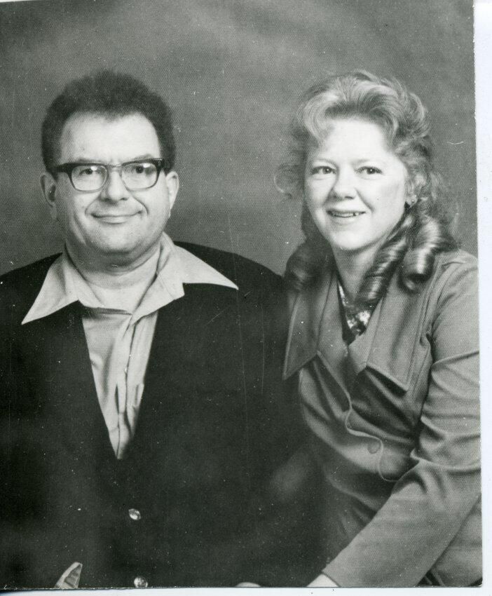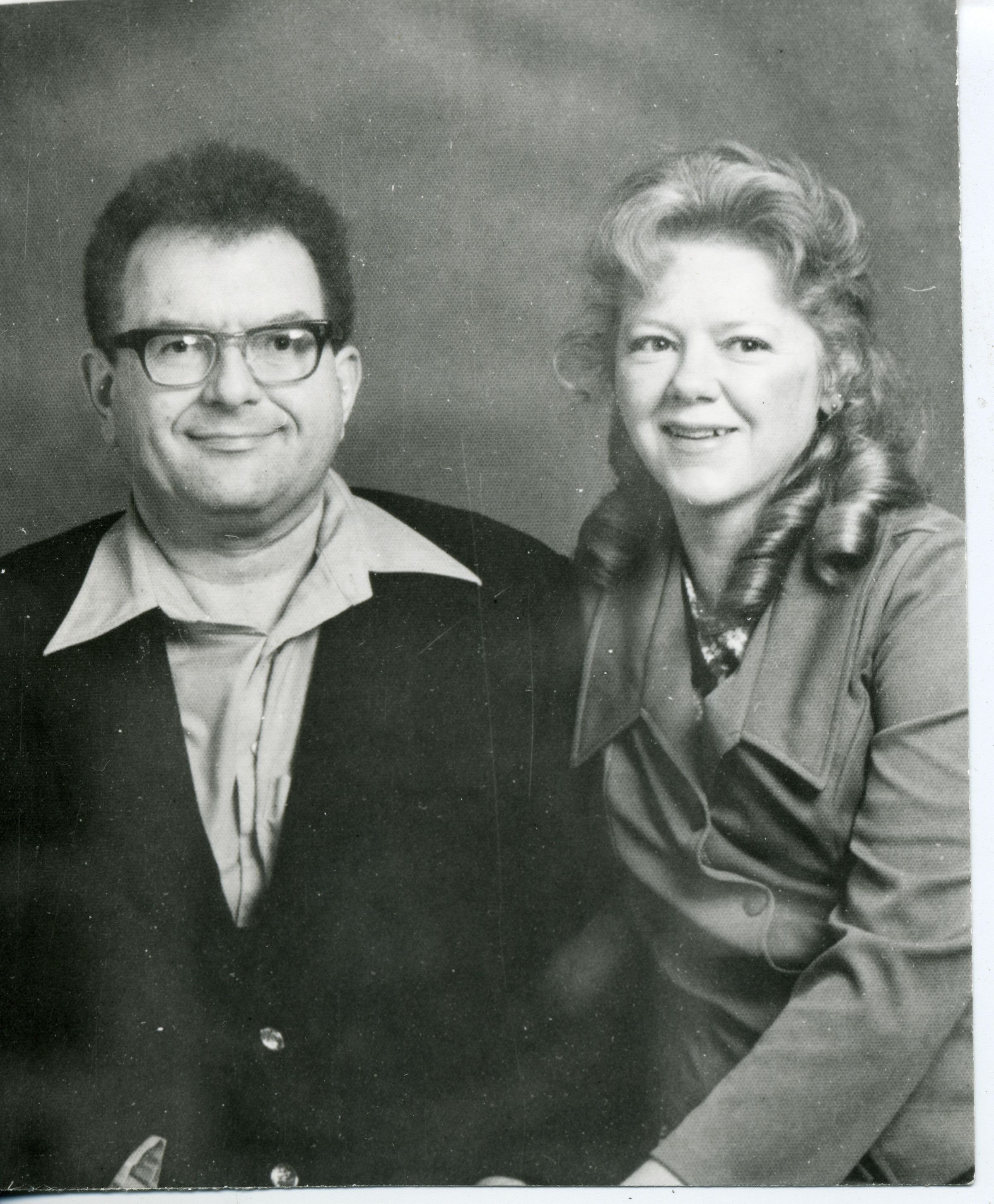 Black and white photo of a man and a woman. The man has short frizzy dark hair and is wearing glasses. He has on a dark jacket over a light-colored shirt that has large collars that extend over the jacket. Buttons are visible on the jacket. The woman has light colored hair with long curls that lie on her shoulders. She has on a medium dark dress open at the collar that exposes a part of a patterned clouse. there is no border. On the back in green felt pen is "86%" and "2 col".