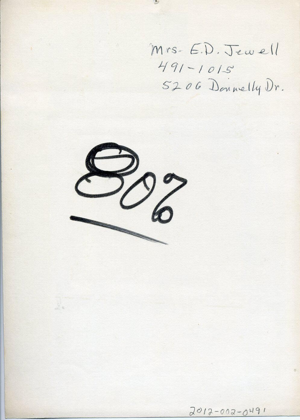 Black and white photo of Mr. Ignacio M. Michel and Mrs. Trinda E. Jewell-Michel. Mrs. Jewell-Michel has long dark hair and is wearing glasses. She has on a white dress with a print and has flowers on her head. Mr. Michel has long dark hair and is wearing a light colored shirt and a white tie with a pattern. He has on dark trousers. They are standing in front of a table with a wedding cake, candles, and dishes. Part of a wall is in the background with a reflection of the flash visible. There is a white border on all sides. On the back in black felt pen is "80%" and in pencil "Mrs. E. D. Jewell 491-1015 5206 Donnelly Dr." According to the bride's brother, Shane, the name and contact information was for his mother, Anne Jewell.