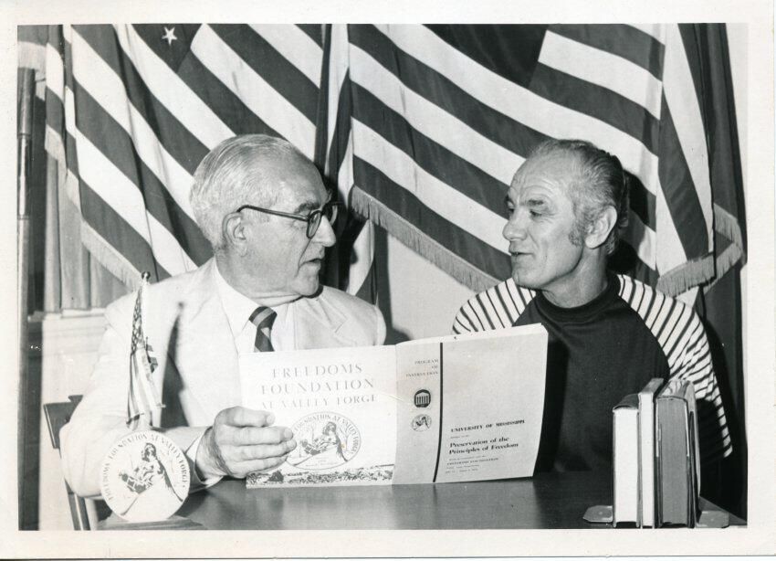 Black and white photo of two men seated at a table. The man on the left is partially bald and has some gray hair. He is wearing glasses and has a white jacket over a white shirt and a striped tie. The man on the right has short gray hair with sideburns and is wearing a tee shirt with striped sleeves and a black body. The man on the left is holding a booklet that says on the front "Freedom Foundation" and has other printing. There are books on the table along with a fixture that has an emblem and a small American flag. In the background are portions of two American flags. There is a white border on all sides. On the back in pencil is "8-6" and in ink "100%". There is also a smear of what might have been adhesive.