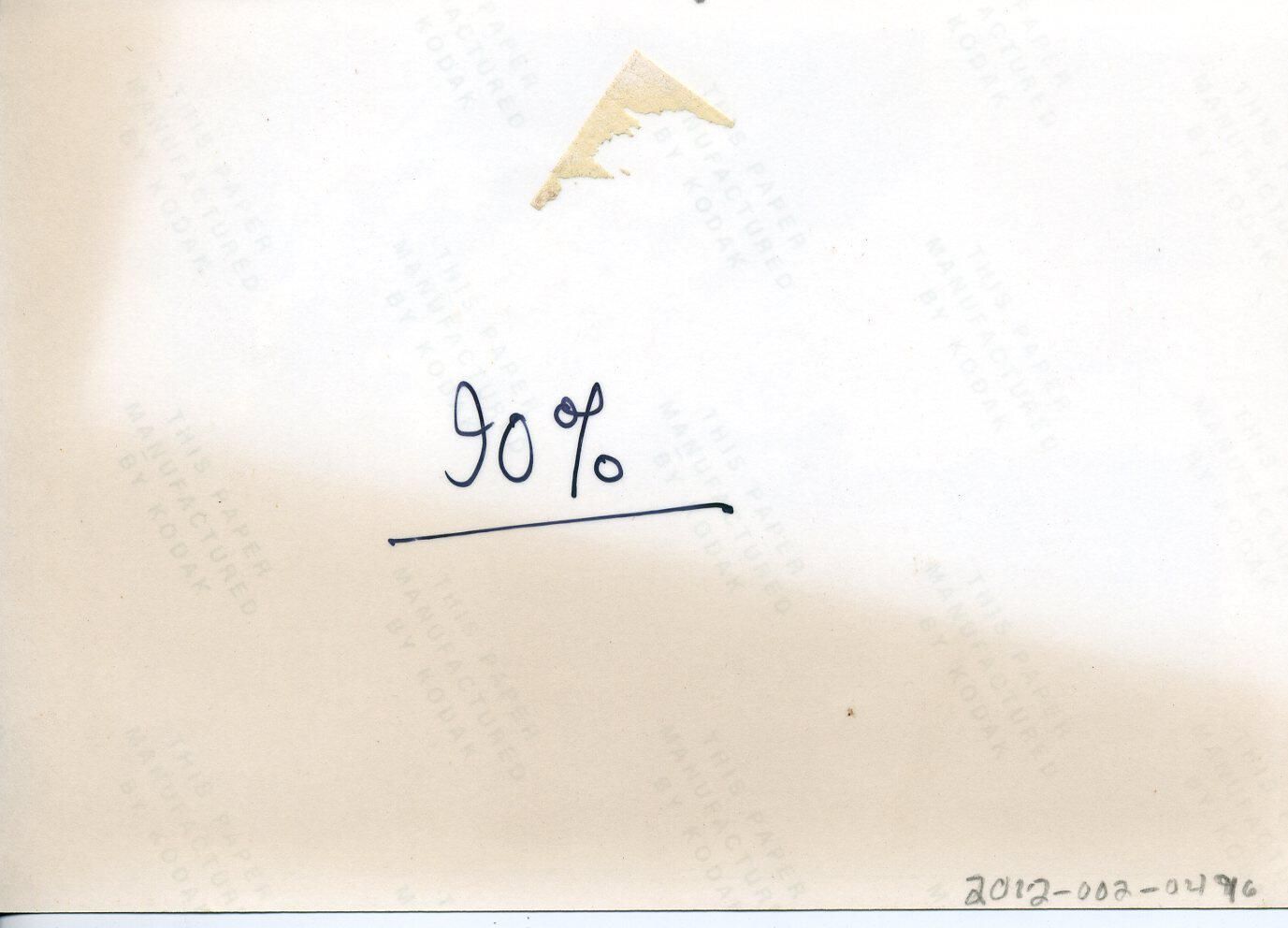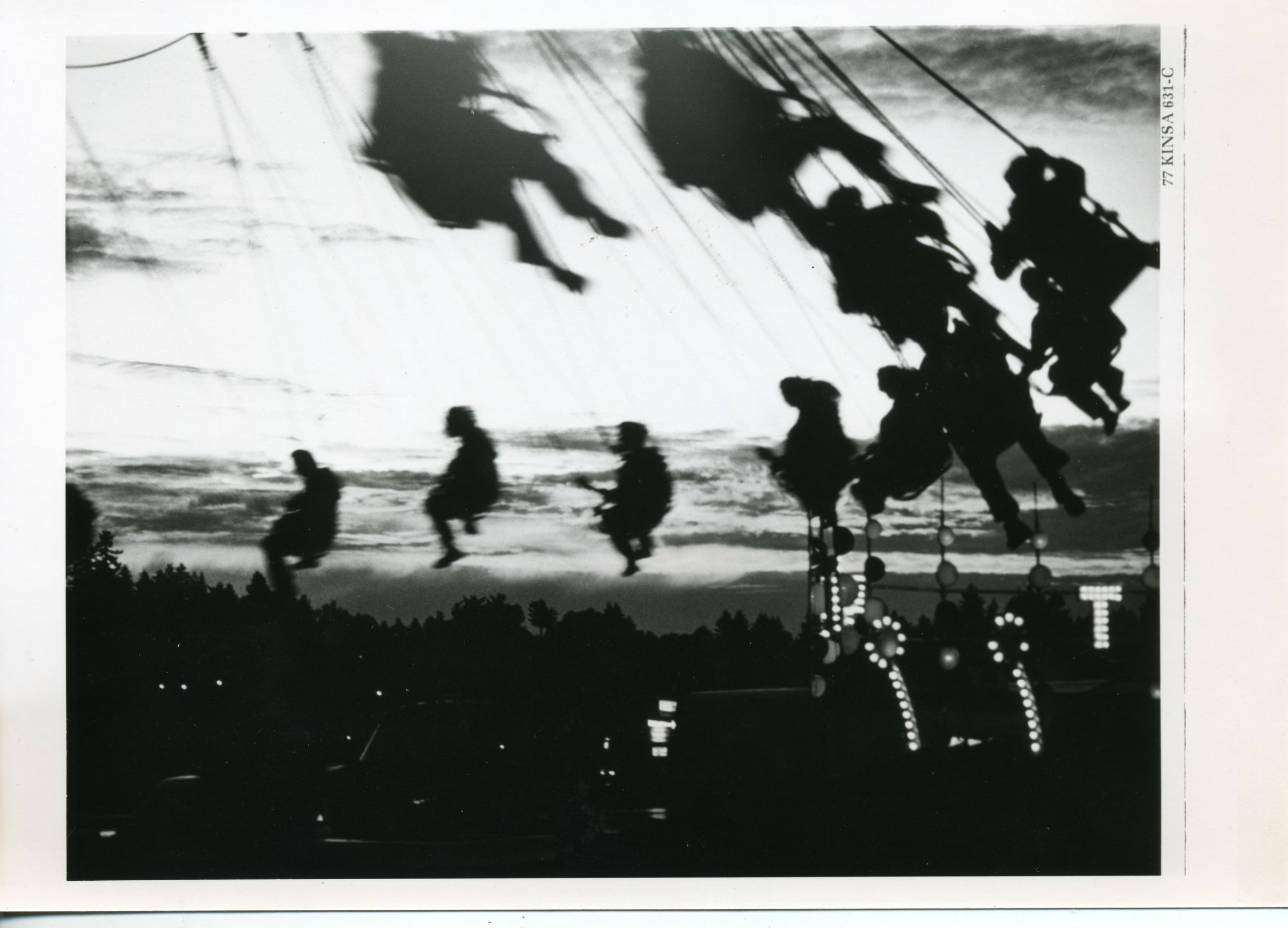 Black and white photo of individuals on a carnival ride. The people are silhouettes and are hanging from chains or ropes and are in a circle as if being rotated by the ride. There are lights in the foreground and what appears to be a tree line and sky with clouds. There is a white border on all sides. In the right border is a smaller border with the following printed "77KINSA631-C". On the back in ink is "90%".