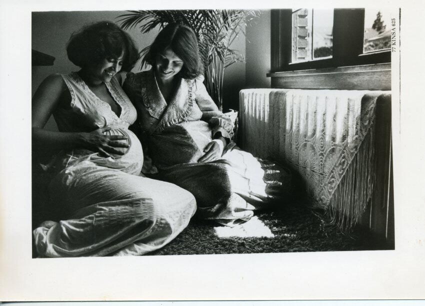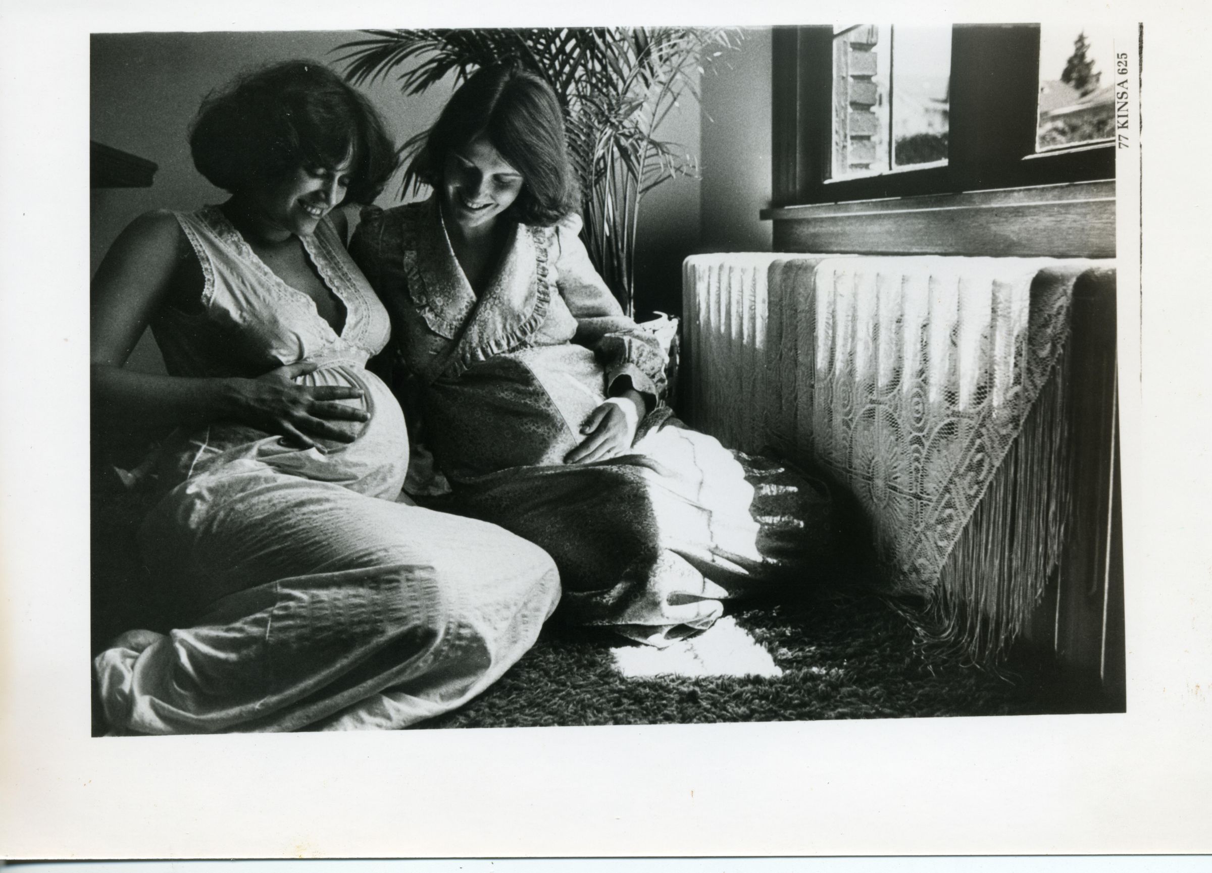 Black and white photo of two women sitting on a carpet. Both women have dark medium length hair and are wearing nightwear. The woman on the left is pregnant and is holding her hand on her stomach while the other woman looks on. There is a window through which sunlight enters and in the room is what appears to be a radiator with a drape over it and a plant such as bamboo in the background. This appears to be a photo of a photo and there is a large white border on the print and a smaller border on the right side has printed "77KINSA625". On the back in ink is "90%".
