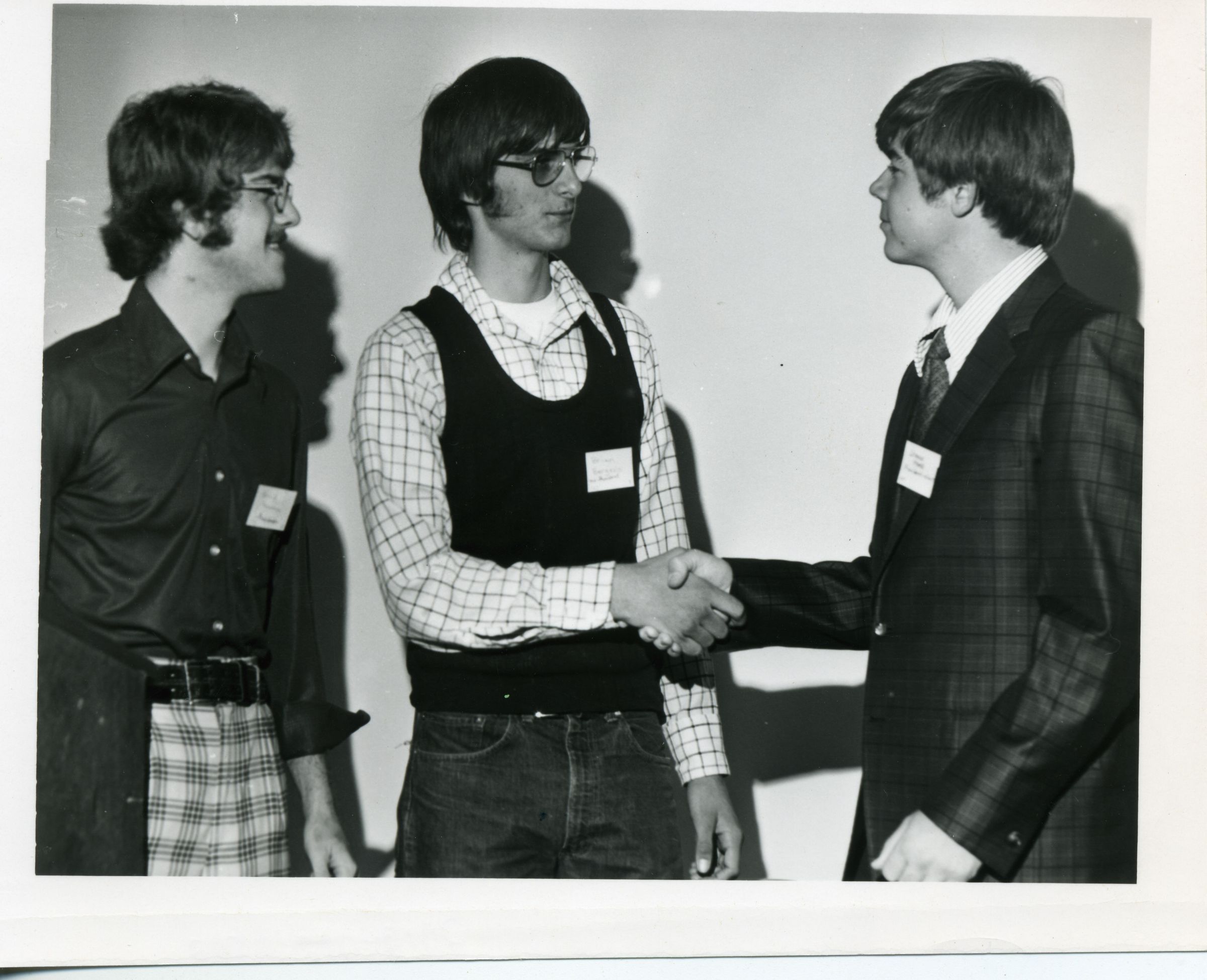 Black and white photo of three young men. The one on the left has long dark hair and is wearing glasses. He has on a dark shirt above plaid trousers. The one in the center has long dark hair and is wearing glasses. He has on a dark vest over a check-patterned shirt above dark trousers. On the right, the man has medium length dark hair and is wearing a checked jacket over a white shirt and a dark tie. The two on the right are shaking hands. All three have name tags. There is a white border on all sides. There is no information on the back.Made/Created