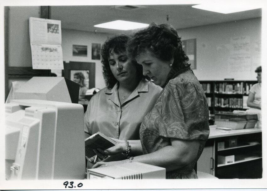 Black and white photo of two women. The woman on the left has dark curly hair and is wearing a light colored dress open at the neck. She has on a necklace with a pendant. The woman on the right also has dark curly hair and is wearing a paisley blouse and ear rings. She is holding a book and both women are looking at a computer monitor. In the background are two other women as well as counters, shelves, posters and a calendar. Walls of the room and ceiling lights are visible. There is a white border on all sides and in the bottom border in ink is "93.0". On the back in ink is "93%" and something in green ink that has been crossed out.