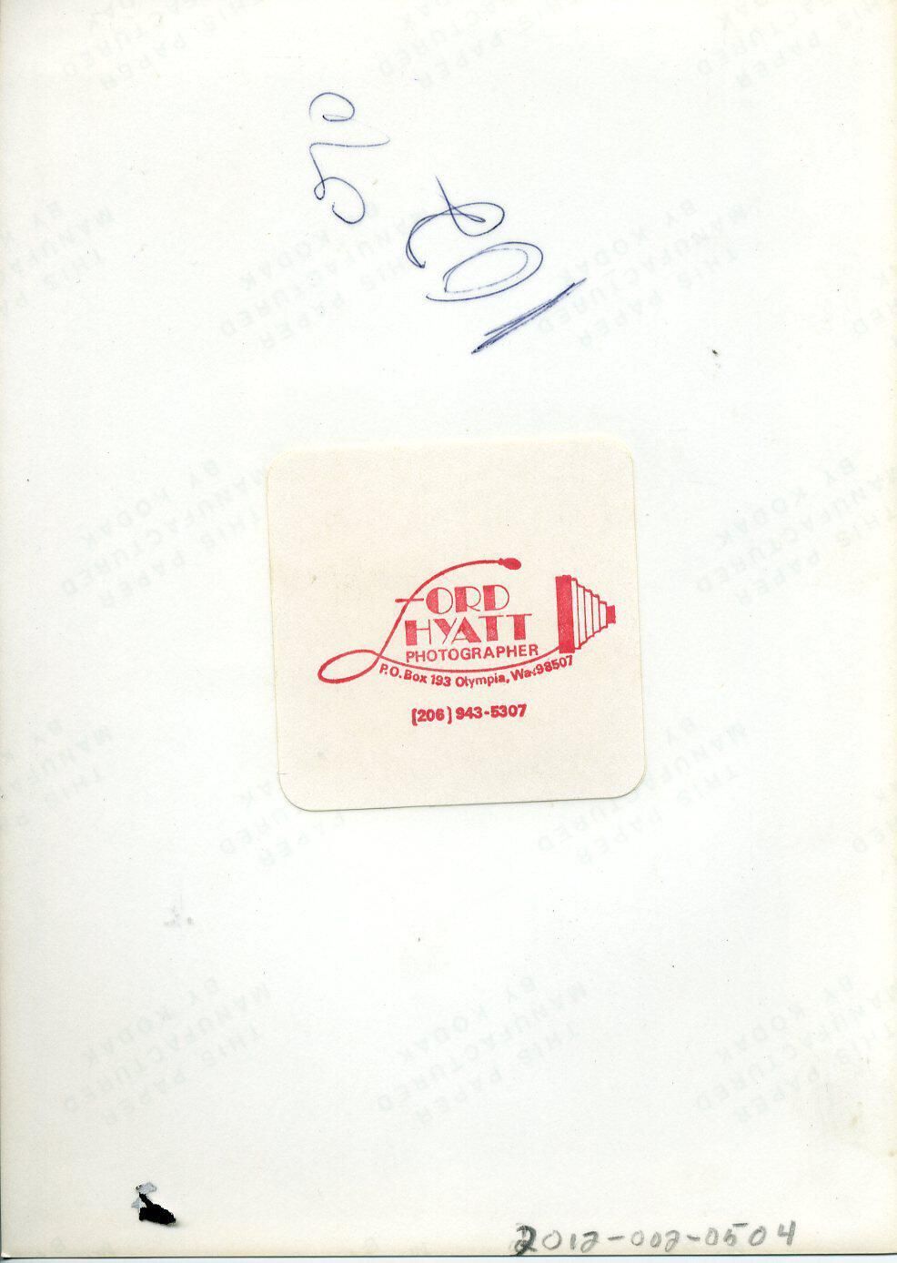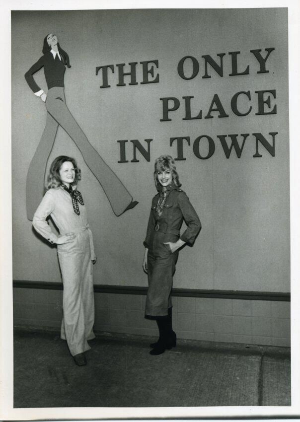Black and white photo of two women. The woman on the left has medium dark hair that is shoulder length and is wearing a white jump suit with a dark scarf. The woman on the right has light colored shoulder length hair and is wearing a medium dark dress over a patterned blouse and dark boots. Both women are standing in front of a display board that has the words "The Only Place in Town" and a stylized drawing of a woman. There is a white border on all sides. On the back in ink is "102%" and a pasted-on piece of paper with the stylized red logo "Ford Hyatt Photographer P.O. Box 193 Olympia, Wa 98507 (206) 943-5307". Also on the back is the repeated statement "This Paper Manufactured by Kodak".
