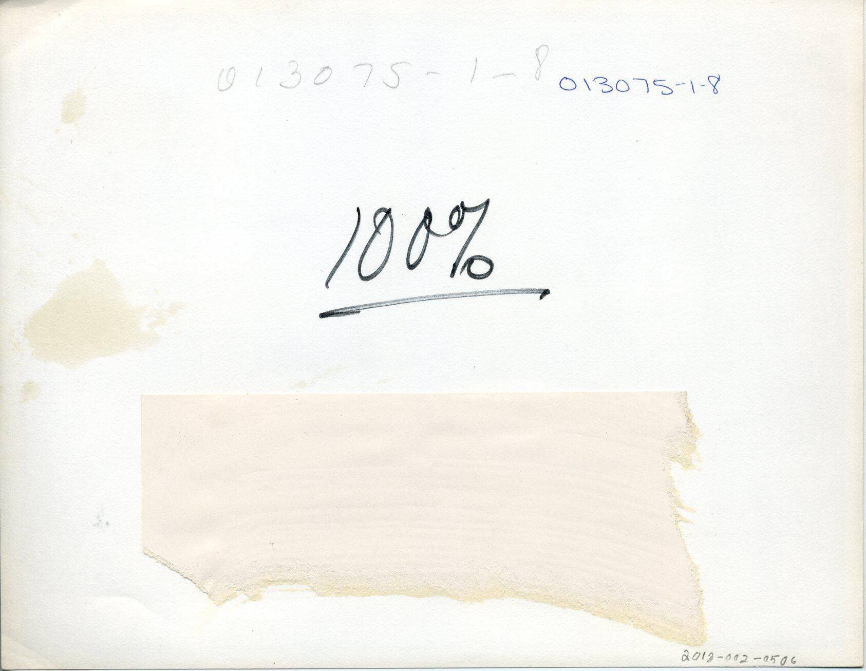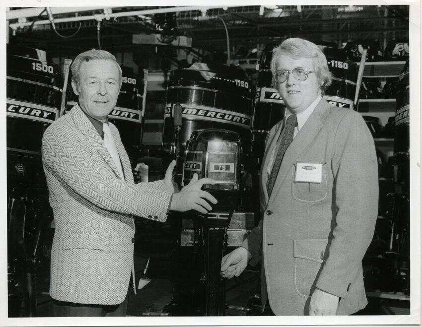 Black and white photo of two men. The man on the left has short light colored hair and is wearing a herringbone patterned jacket over a dark shirt and white tie. The man on the right has medium length light colored hair and is wearing a light colored jacket over a white shirt and a dark patterned tie. He has a name tag on his jacket. Both men are standing in front of a display of Mercury outboard motors. and the man on the left has his hands on one motor. There is a white border on all sides. On the back in ink is "100%" and "013075-1-8" and in pencil "013075-1-8" There is a piece of paper glued onto the back with no information on it.