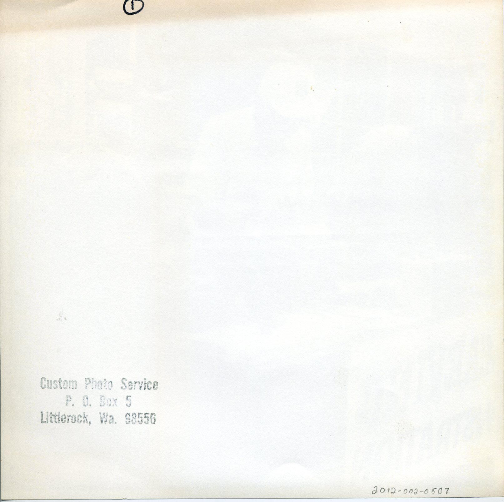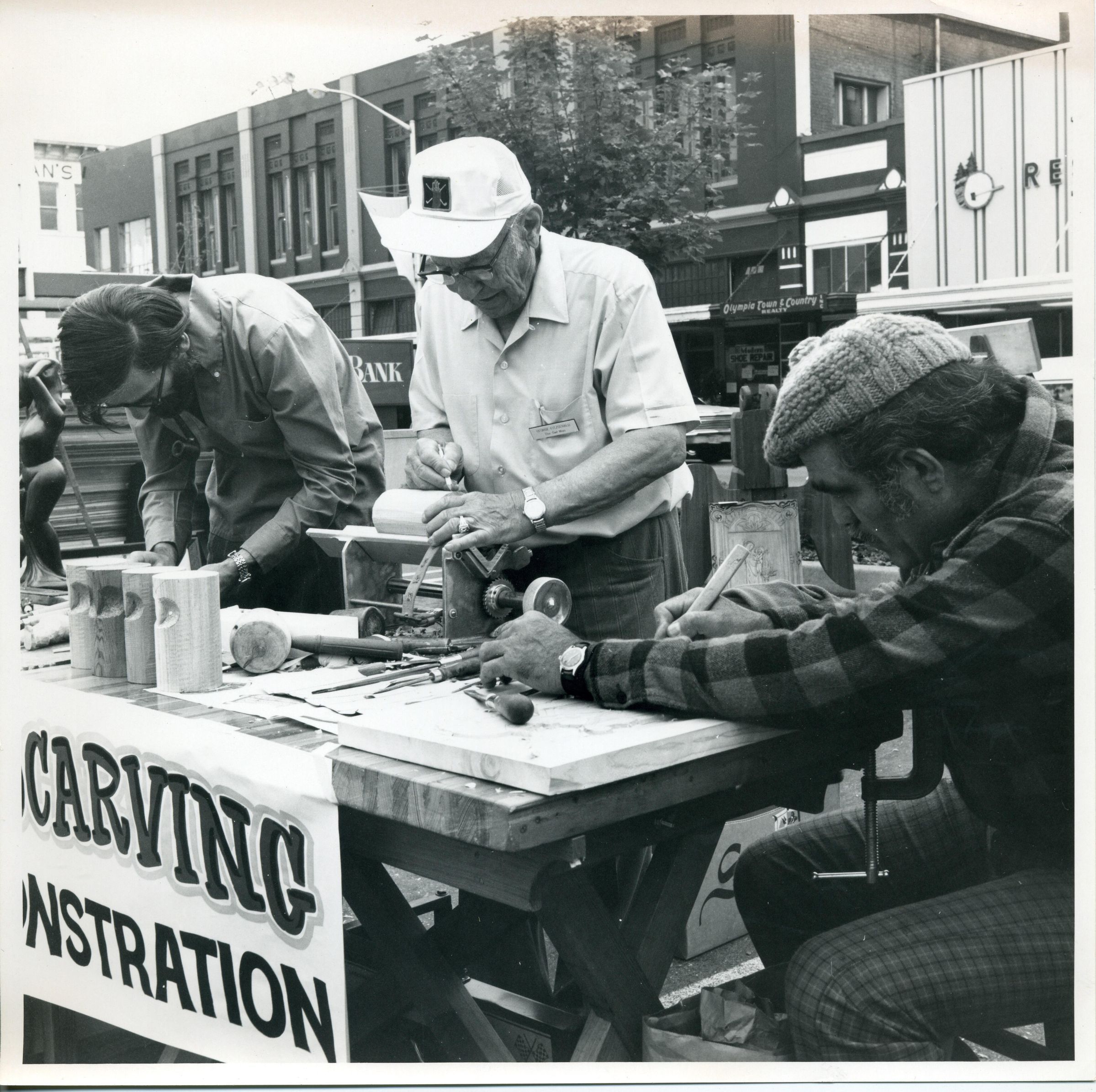 Black and white photo of three men sitting or standing at a table that is holding equipment and tools for carving wood as well as some pieces of wood. The man on the left has dark hair and is wearing glasses and a wrist watch. He appears to have on an apron over a light colored shirt. The man in the center has on a white hat and is wearing glasses. He has a light colored shirt over dark trousers. He is wearing a name tag and a wrist watch. The man on the right has a knitted cap over dark hair. He is wearing a plaid shirt over checked trousers and a wrist watch. On the front of the table is a sign (partially cut off the image) saying "Carving Demonstration". The setting is outdoors and a building and a tree are visible in the background. There is a white border on all sides. On the back is "1" inside a circle, and a stamp that says "Custom Photo Service P. O. Box 5 Littlerock, Wa 98556".Made/Created