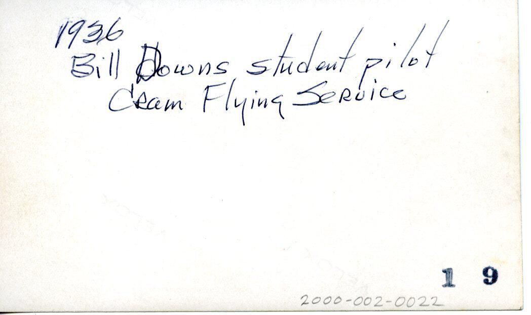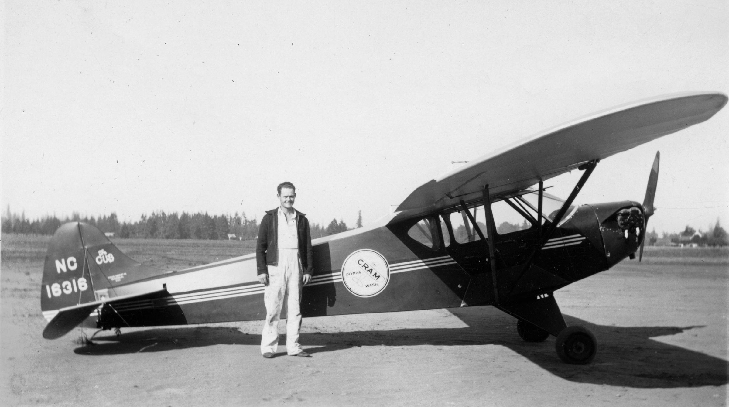 Black and white photograph of Bill Downs, a student pilot with Cram Flying Service, 1938. He is pictured with a Cram Flying Service Cub aircraft. The tail reads: "NC 16316 the Cub."Made/Created