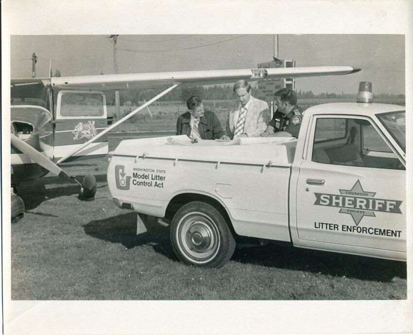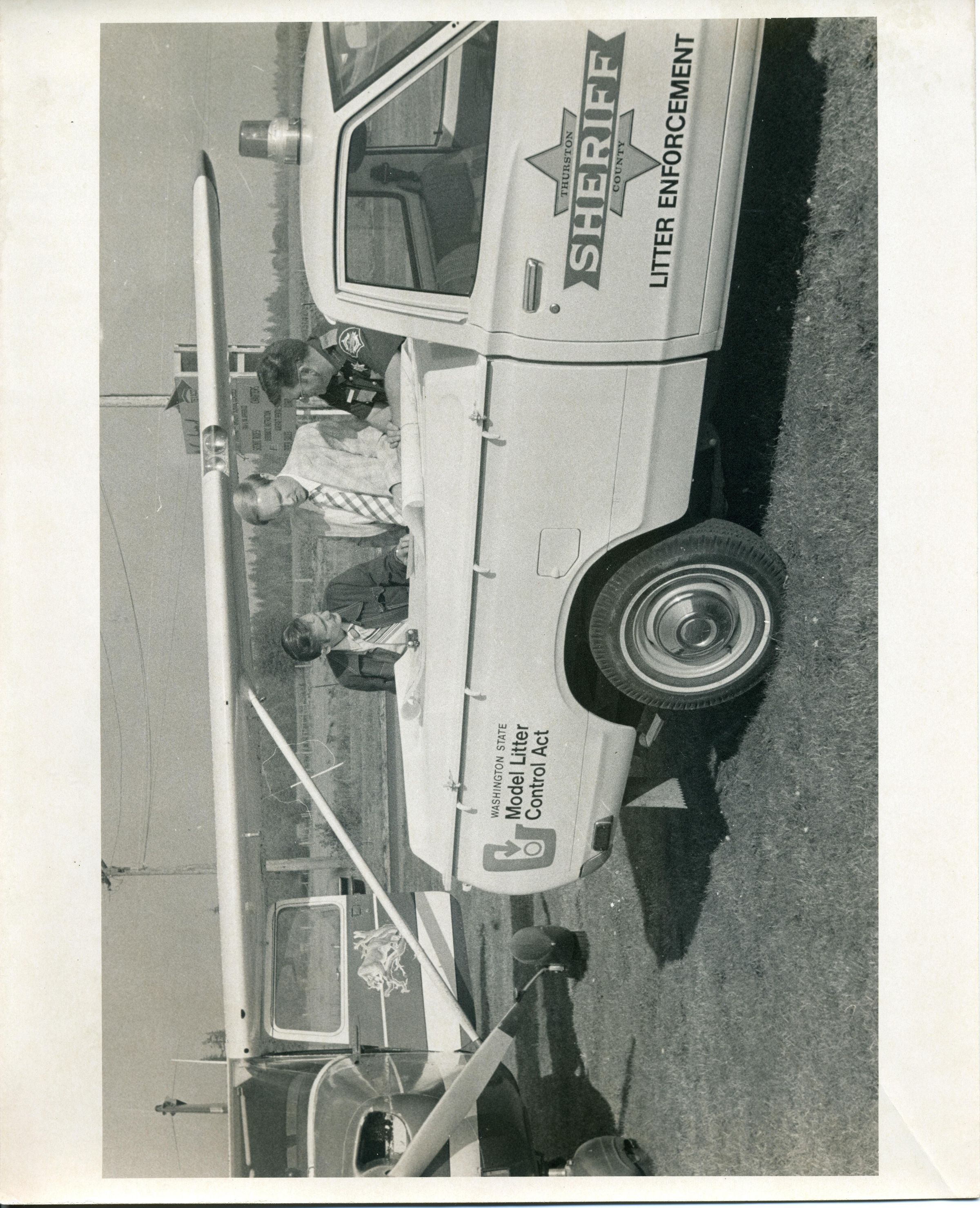 Black and white photo three men standing behind a pickup truck. The man on the left has dark hair and is wearing a dark jacket over a white shirt and a striped tie. The man in the center has light colored hair and is wearing a light jacket over a white shirt and a striped tie. The man on the right has dark hair and is wearing a uniform with patches and insignia. The truck has painted on it "Thurston County Sheriff Litter Enforcement" and"Washington State Model Litter Control Act" with an ion of a waste basket. There is an airplane in the background at the left side of the print.. Further in the background are buildings such as one might see at an airport. There is a white border on all sides with the top and bottom borders being larger. There is no information on the back.Made/Created