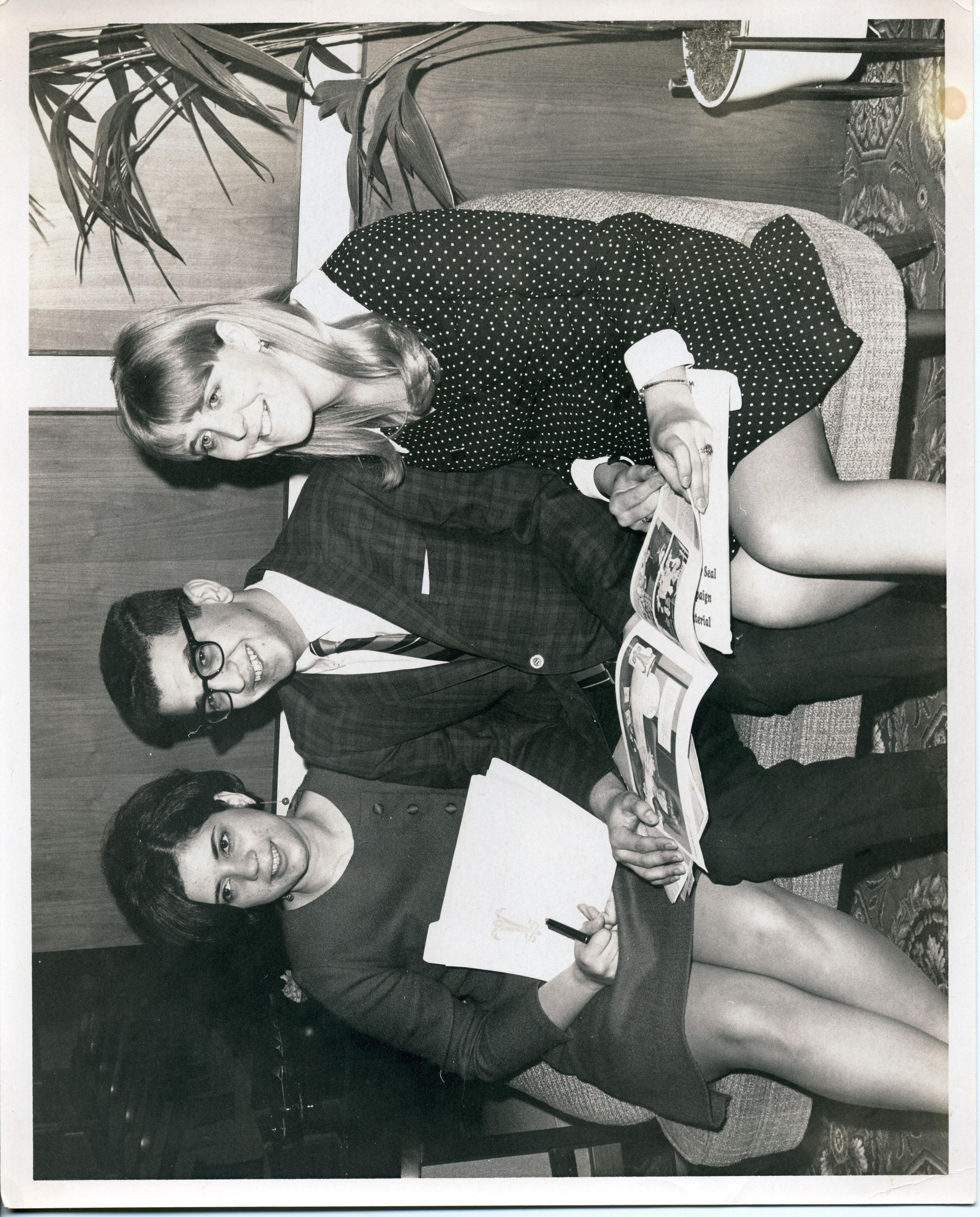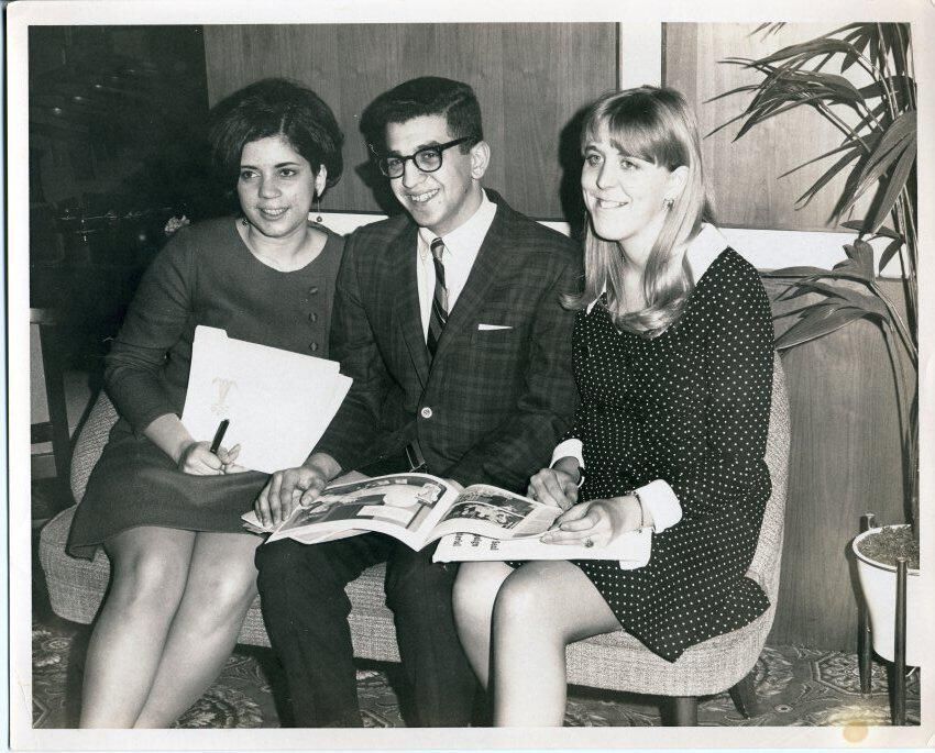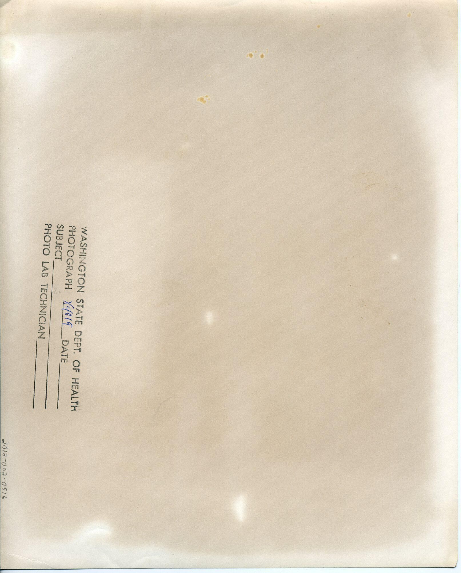 Black and white photo of three young persons sitting on a sofa. On the left is a girl with dark hair and a dark dress. In the center is a boy with dark hair and glasses and wearing a dark checked suit over a white shirt and a striped tie. He has a handkerchief in his lapel pocket and a button is visible on the jacket. On the right is a girl with light hair that falls below her shoulders and is wearing a polka dotted dress with white cuffs. The girl on the left is holding a pen and papers and a book is spread over the laps of the other two. In the background is part of a wall and a potted plant. A carpet is visible below the sofa. There is a white border on all sides On the back is a stamp that says "Washington State Dept. of Health Photograph x4019 Date Subject Photo Lab Technician".Made/Created