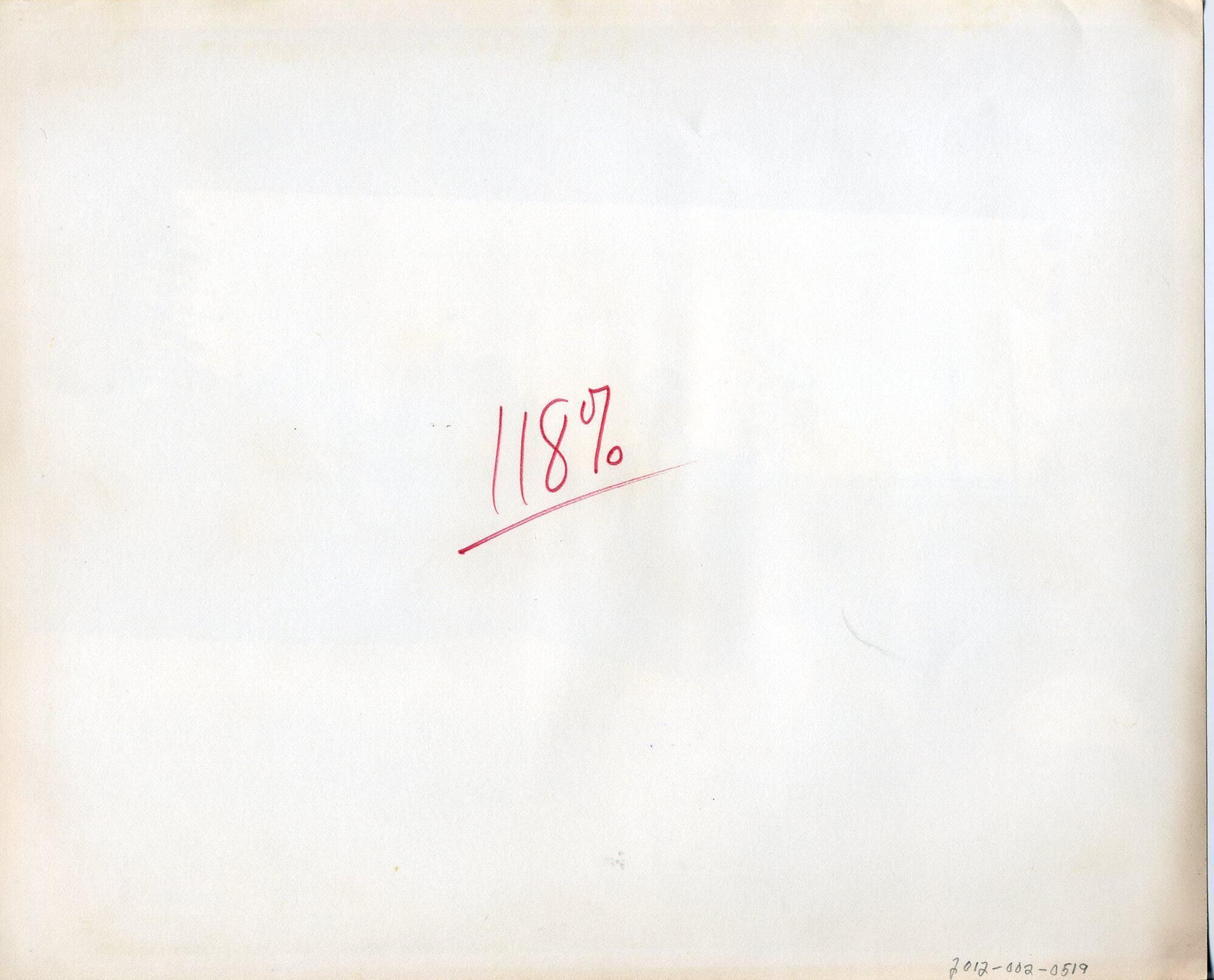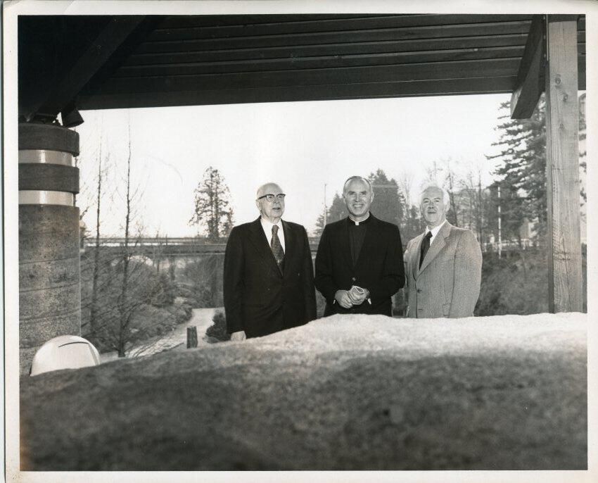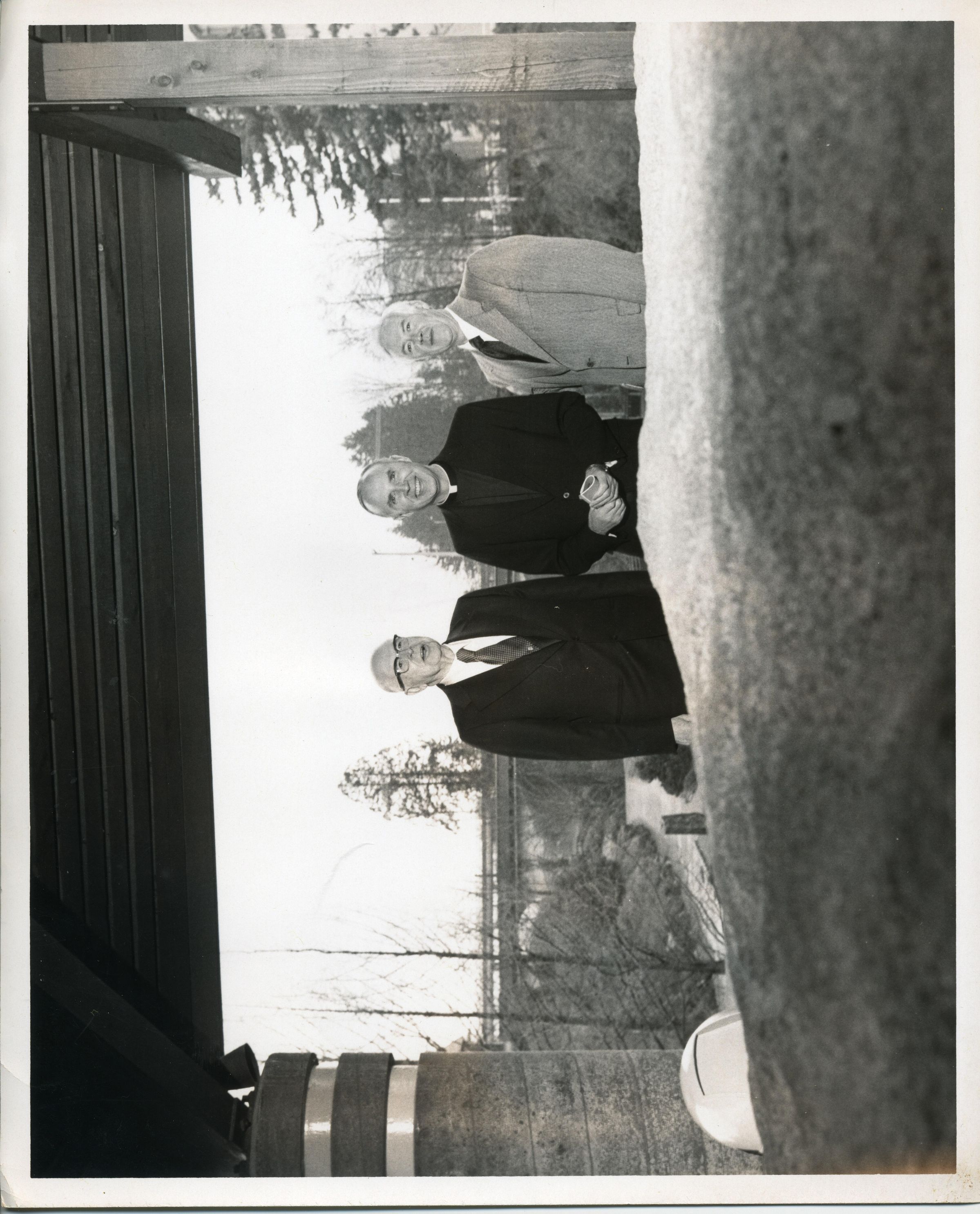 Black and white photo of three individuals. The man on the left is mostly bald and is wearing glasses. He has on a dark suit over a white shirt and a medium dark tie. In the center is a man that is partially bald and is wearing clerical garments and is holding a booklet. On the right is a man with short white hair and a light colored suit over a white shirt and a dark tie.. They are standing behind a concrete-type wall and under a structure that has a pillar on the left and a post on the right. There is a board roof over their heads. In the background are trees, a stream, and a bridge or roadway.. There is a white border on all sides. On the back in red ink is "118%".