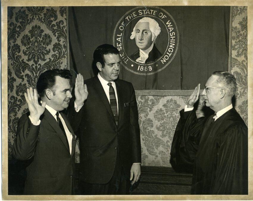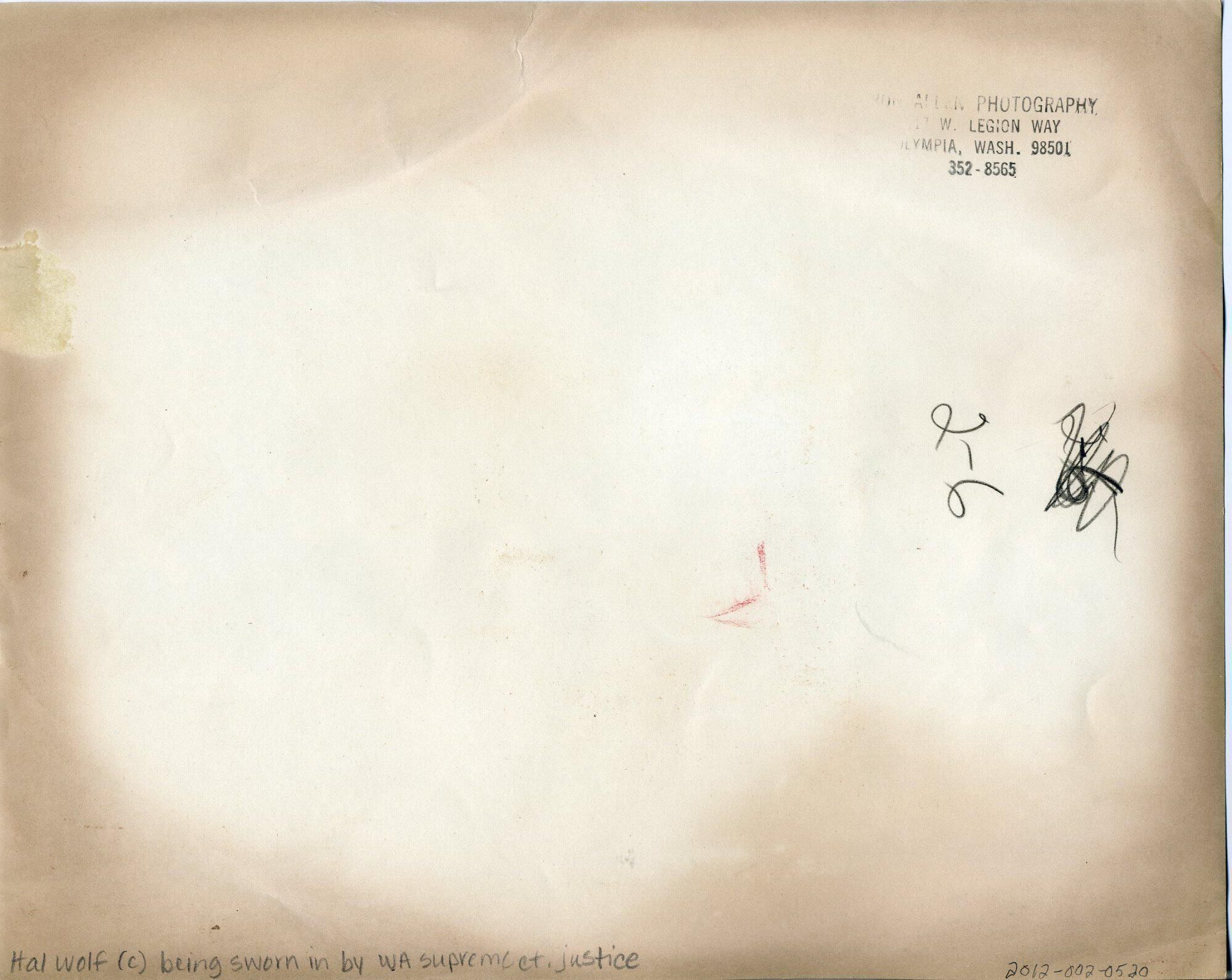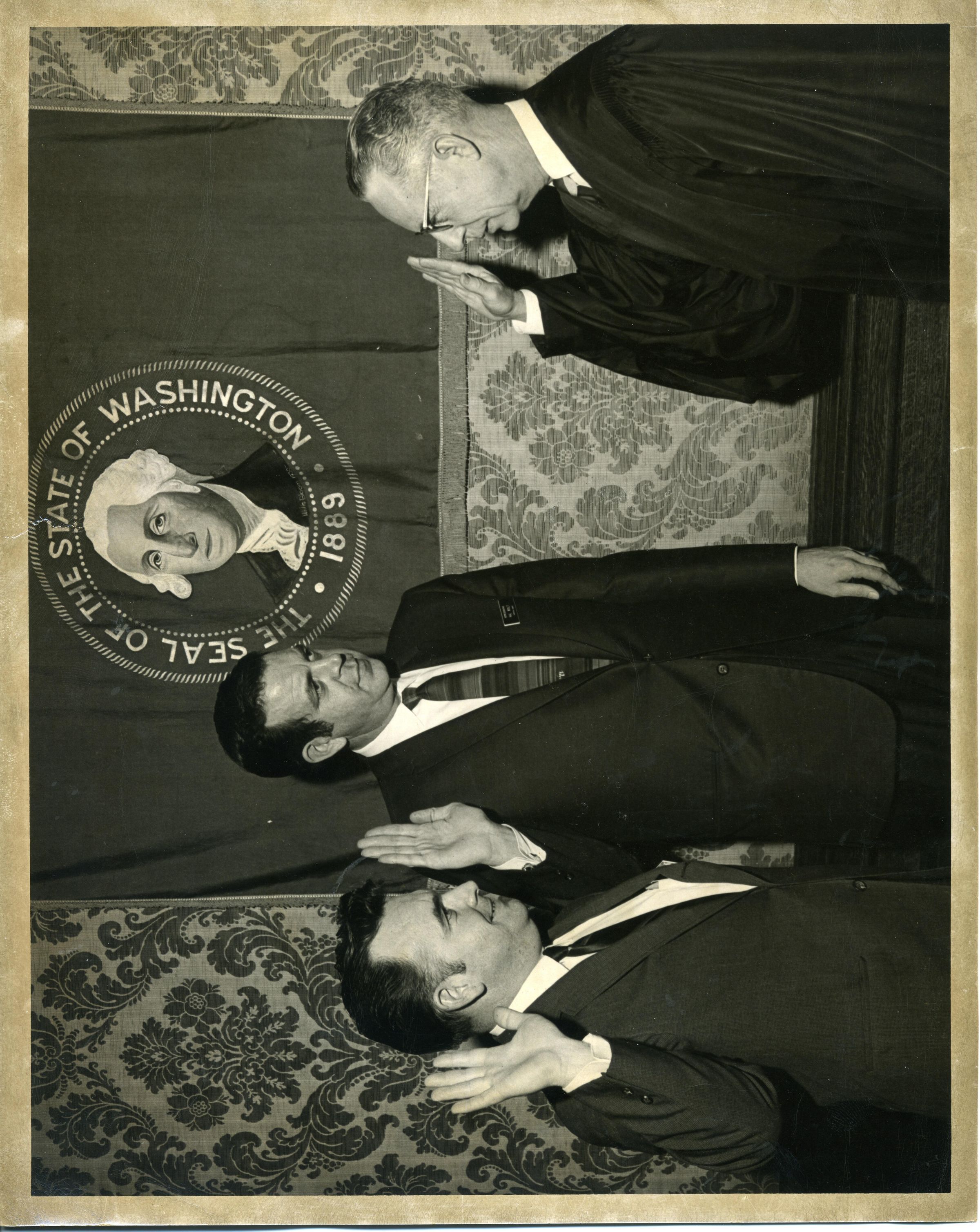 Black and white photo of two men being sworn in by a third. All have their right hands raised. The man on the left, who is unidentified, has short dark hair and is wearing a dark suit over a white shirt and a dark tie. The man in the center is Hal Wolf. He has short dark hair and is wearing a dark suit over a white shirt and a striped tie. A name tag is visible on his coat. On the right is Chief Justice Robert Hunter. He has short gray hair and is wearing glasses. He has on a judicial robe over a white shirt. The three are standing in front of a wall with patterned panels and a drape with the seal of the State of Washington. The seal has an image of George Washington and the words "Seal of the State of Washington 1889". There is a white border on all sides. On the back in pencil are some numbers crossed out and "2-6". A stamp in black ink says "?? photography ??W Legion Way Olympia Wash. 98501 352-8565". In pencil is "Hal Wolf (c) being sworn in by a supreme ct. justice".