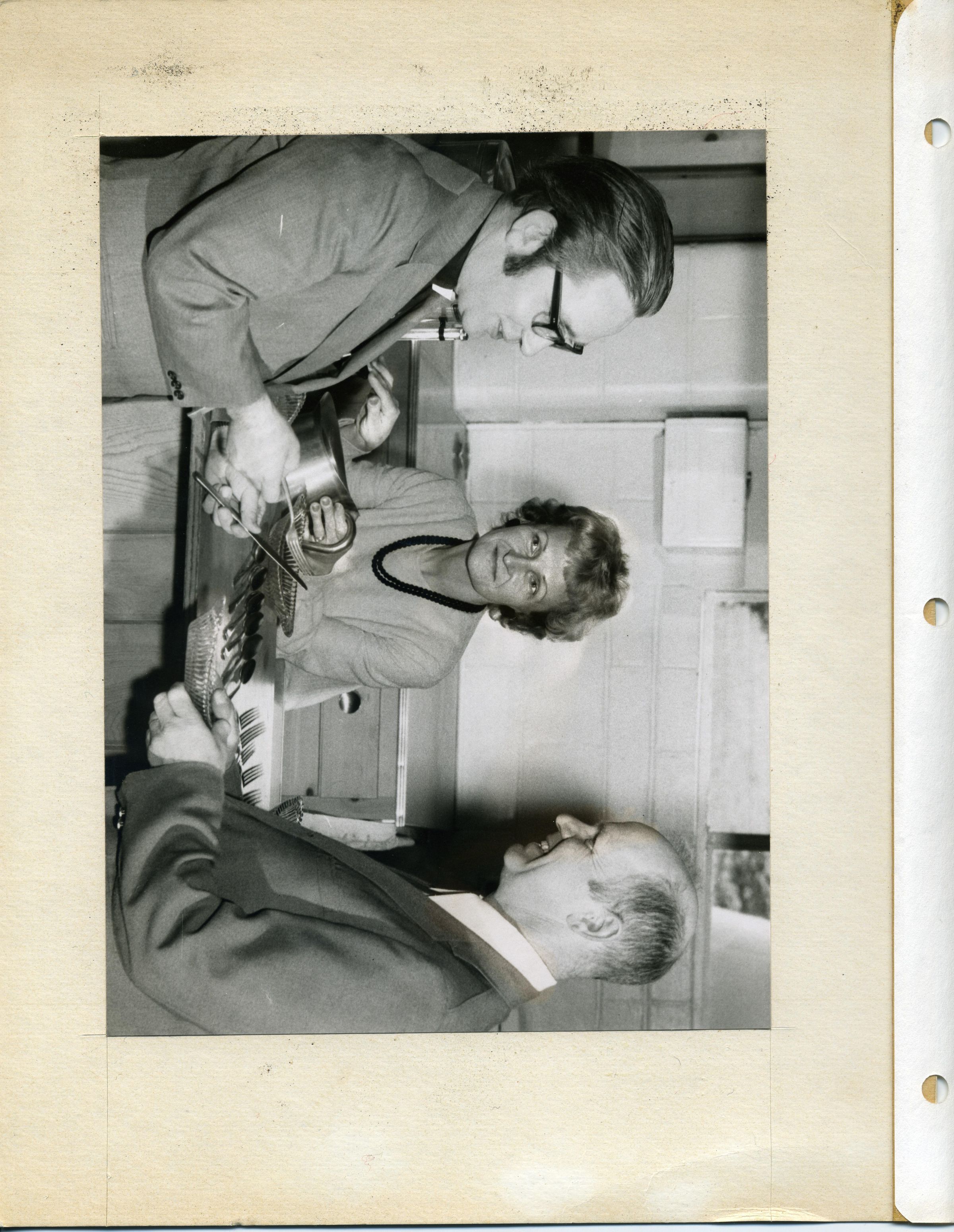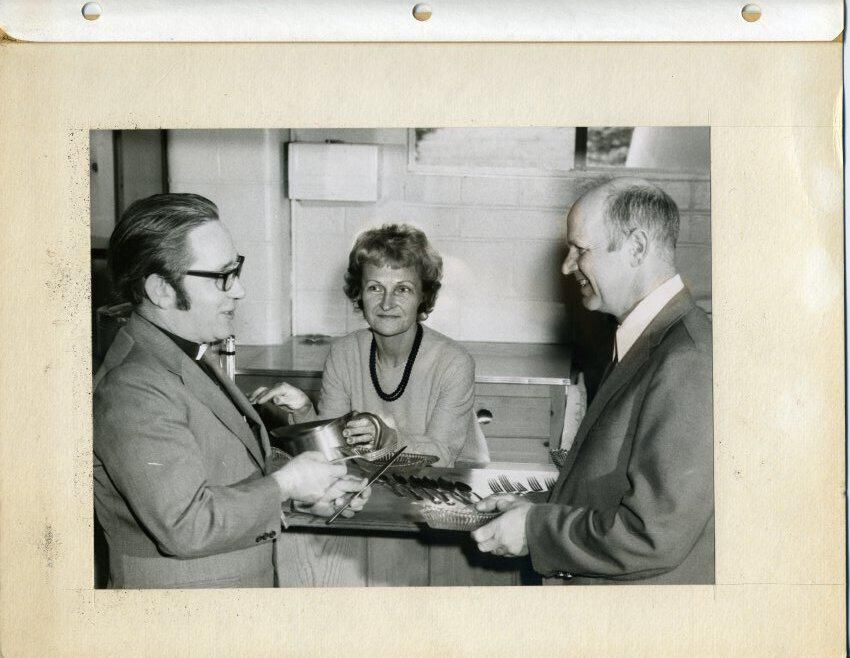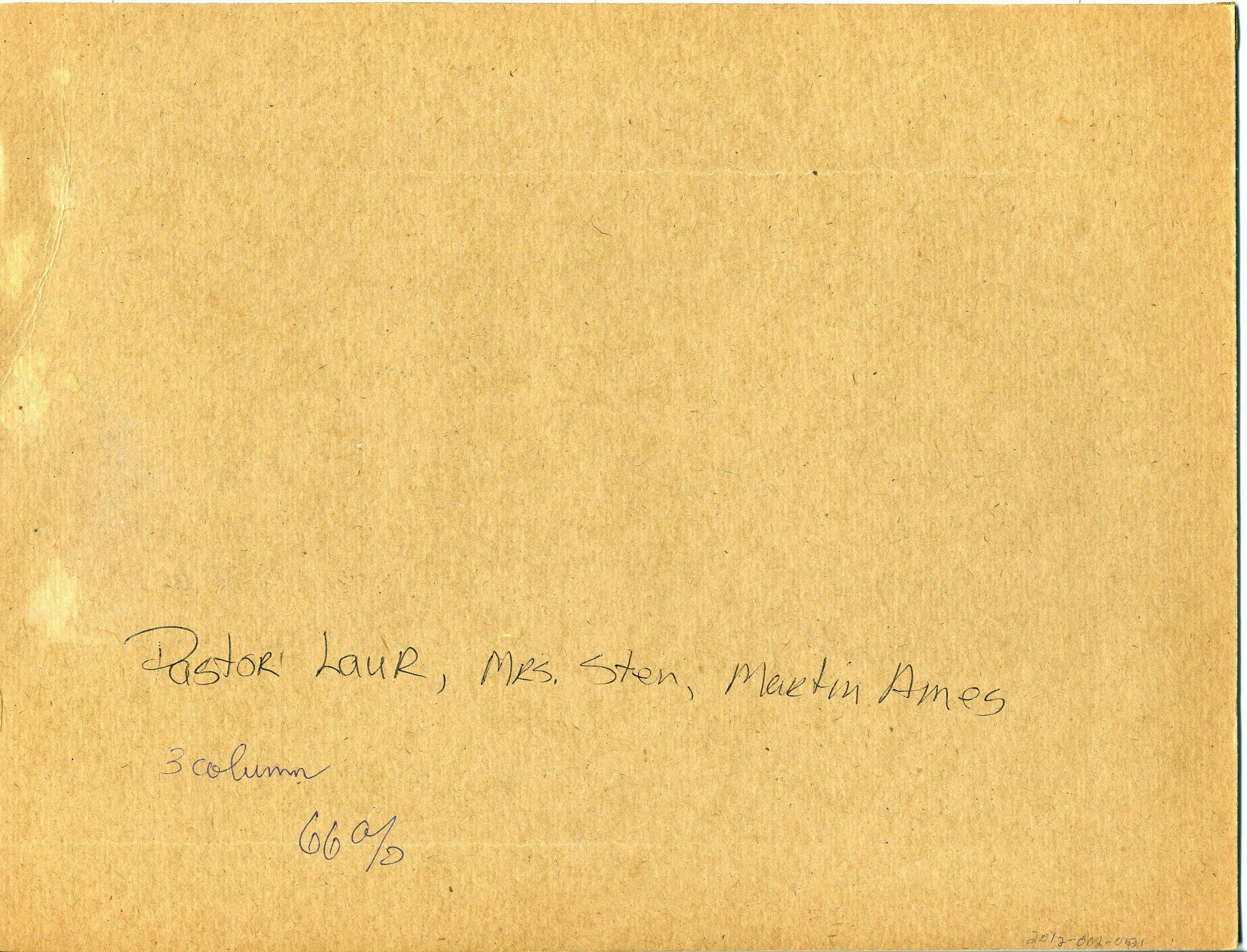 Black and white photo of three individuals in a kitchen setting. The man on the left is identified as "Pastor Laur". He has dark hair and is wearing glasses. He has on a light colored jacket over a clerical vest and collar. In the center is a woman identified as "Mrs. Sten". She has light hair and is wearing a light colored dress with a dark ring at the collar. On the right is a man identified as "Martin Ames". He is mostly bald and is wearing a light colored suit over a white shirt and a dark tie. All three are holding kitchen implements and silverware is visible on the table. The photographic print has been pasted onto a cardboard, and a paper punched for insertion into a notebook is attached to the top of the cardboard so that it covers the image. On the back of the cardboard in ink is "Pastor Laur, Mrs. Sten, Martin Ames 3 column 66%".
