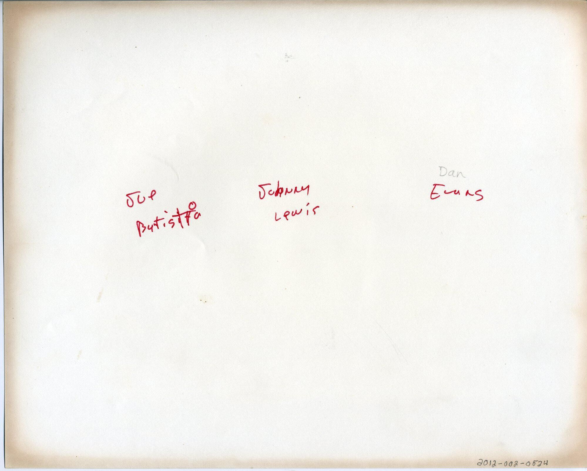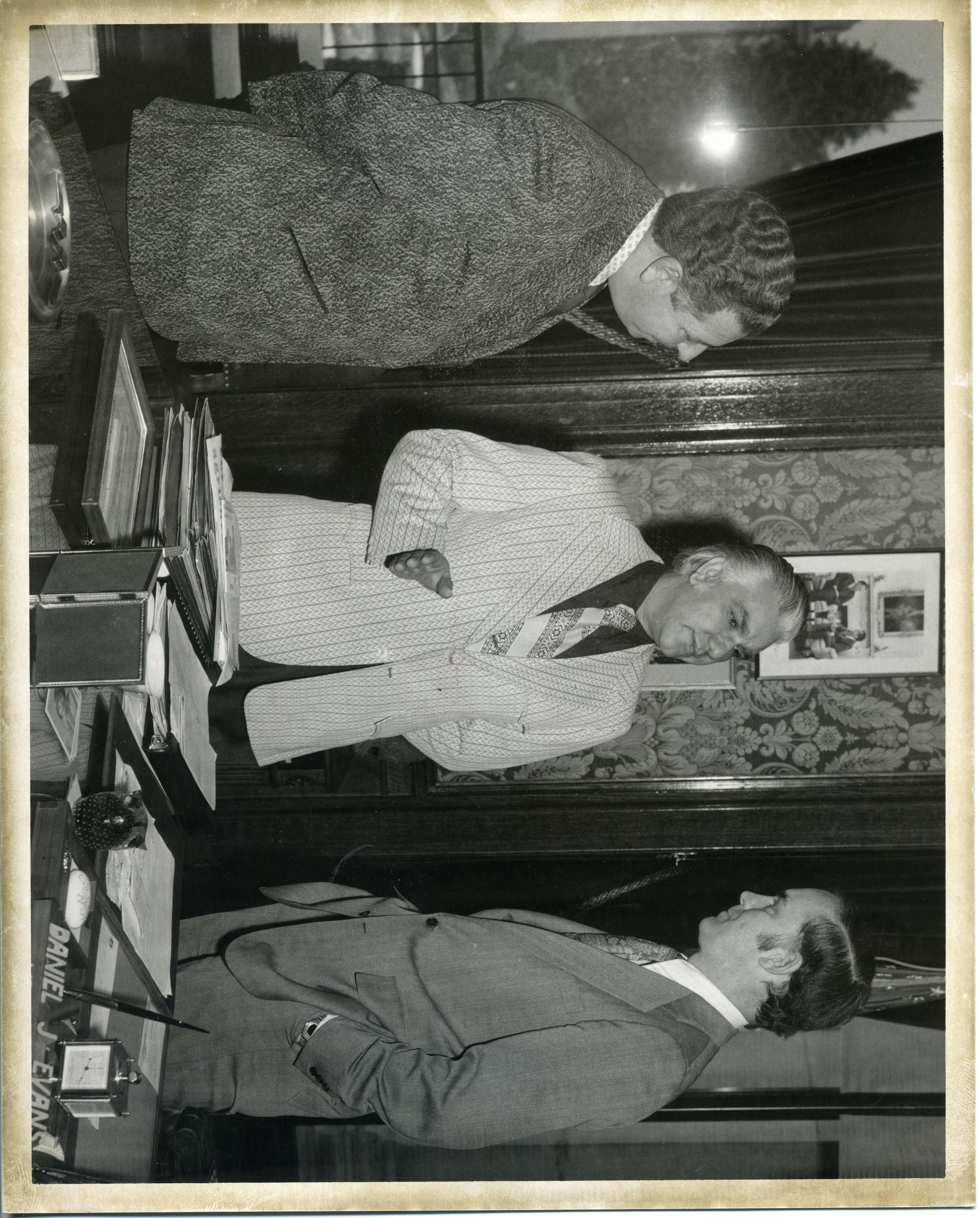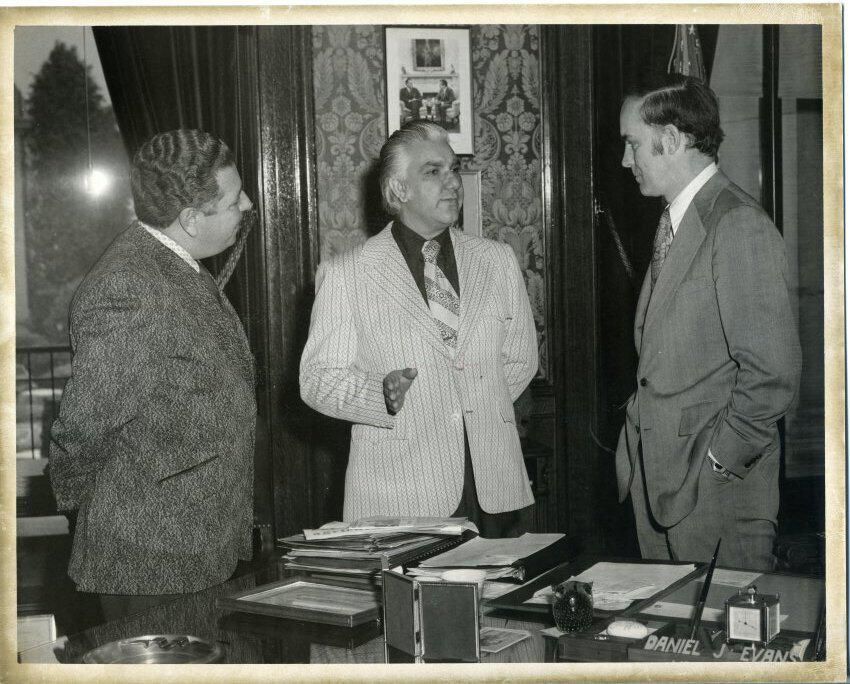 Black and white photo of three men. On the left is a man vaguely identified as Joe Butisto. He has dark curly hair and is wearing a gray patterned jacket over a white patterned shirt and dark trousers. In the center is Johnny Lewis. He has medium length gray hair and is wearing a light colored jacket with a line-and-speck pattern over a dark shirt and a light colored patterned tie. He is gesturing with one hand On the right is Governor Dan Evans. He has short dark hair and is wearing a gray suit over a white shirt and patterned tie. He has his hands in his pockets. The men are standing in what is apparently the governor's office with a wall in the background with wood, wallpaper, a window, and pictures. In the foreground is a desk with papers, photos, booklets, a paper weight, a clock or barometer, and a pen visible. On the desk is a name plate saying "Daniel J. Evans". There is a white border on all sides. On the back in red ink is "Joe Butis??o Johnny Lewis Evans". Above "Evans" in pencil is "Dan".Made/Created