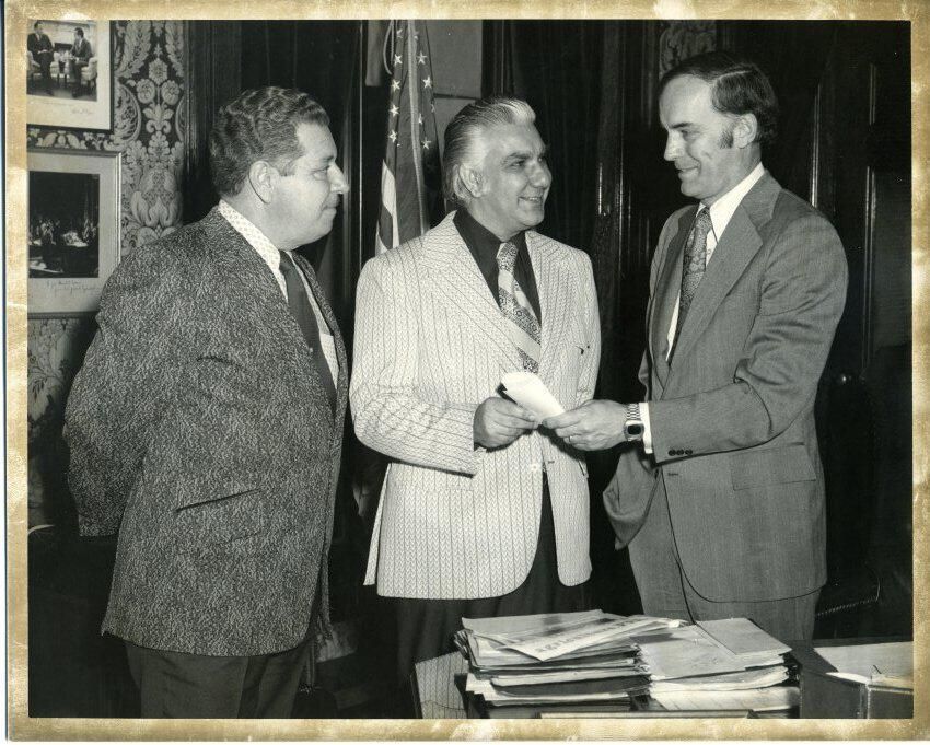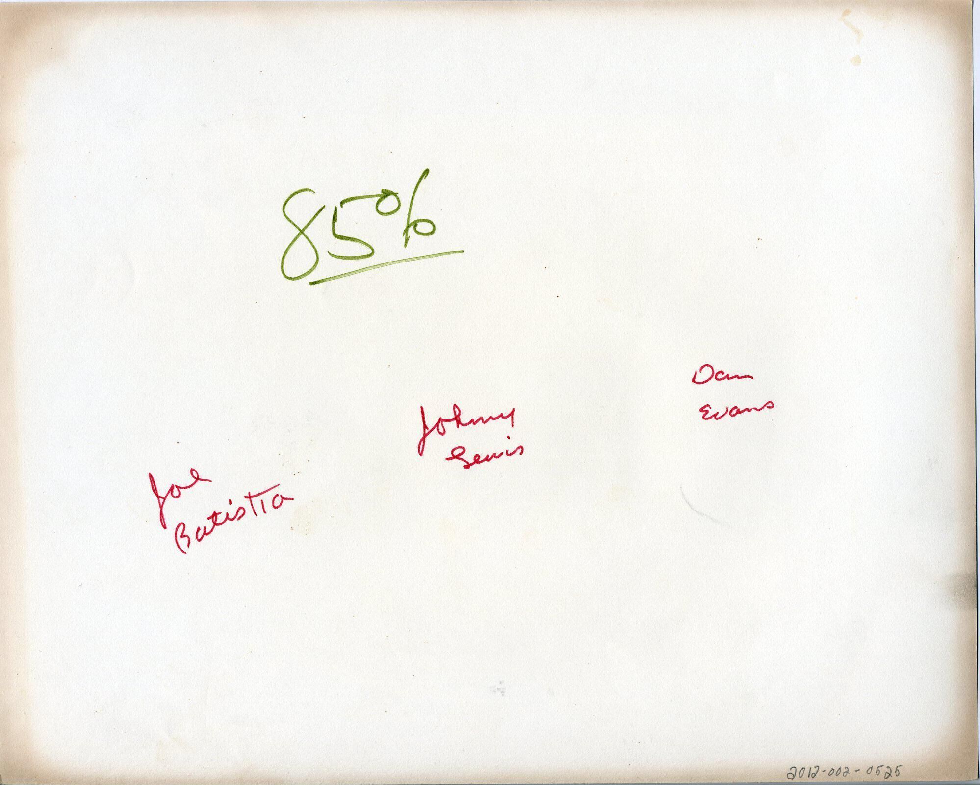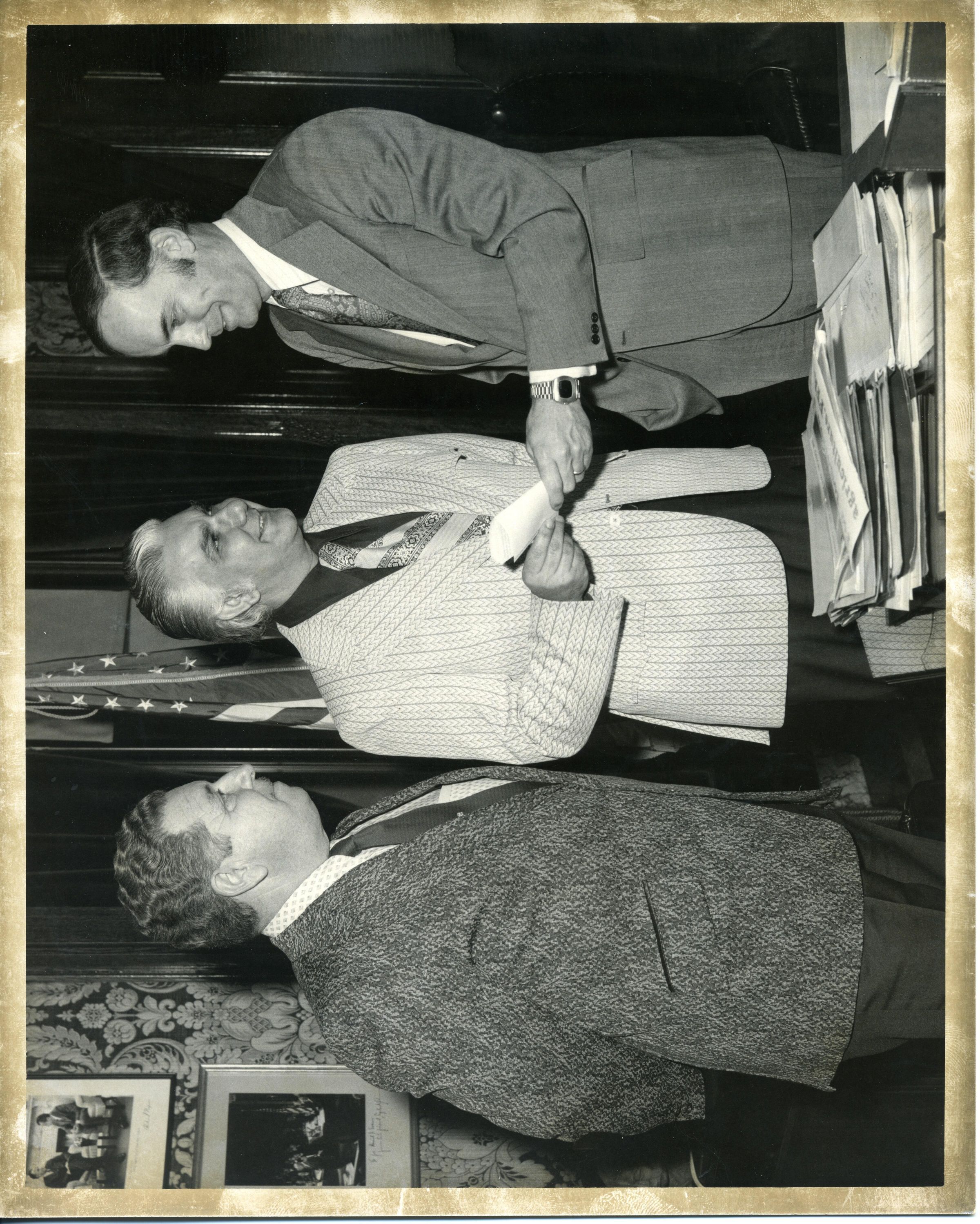 Black and white photo of three men. On the left is a man identified as Joe Bastistia. He has dark curly hair and is wearing a gray patterned jacket over a white patterned shirt and dark tie and trousers. In the center is Johnny Lewis. He has medium length gray hair and is wearing a light colored jacket with a line-and-speck pattern over a dark shirt and a light colored patterned tie. On the right is Governor Dan Evans. He has short dark hair and is wearing a gray suit over a white shirt and patterned tie. He is handing a paper to Lewis. The men are standing in what is apparently the governor's office with a wall in the background with wood, wallpaper, a window, and pictures. In the foreground is a desk with papers, booklets, and a photo visible. Also in the background is a U. S. flag. There is a white border on all sides. On the back in red ink is "Joe Bastistia Johnny Lewis Dan Evans". In green ink is "85%".
