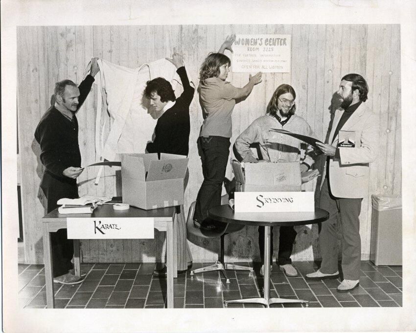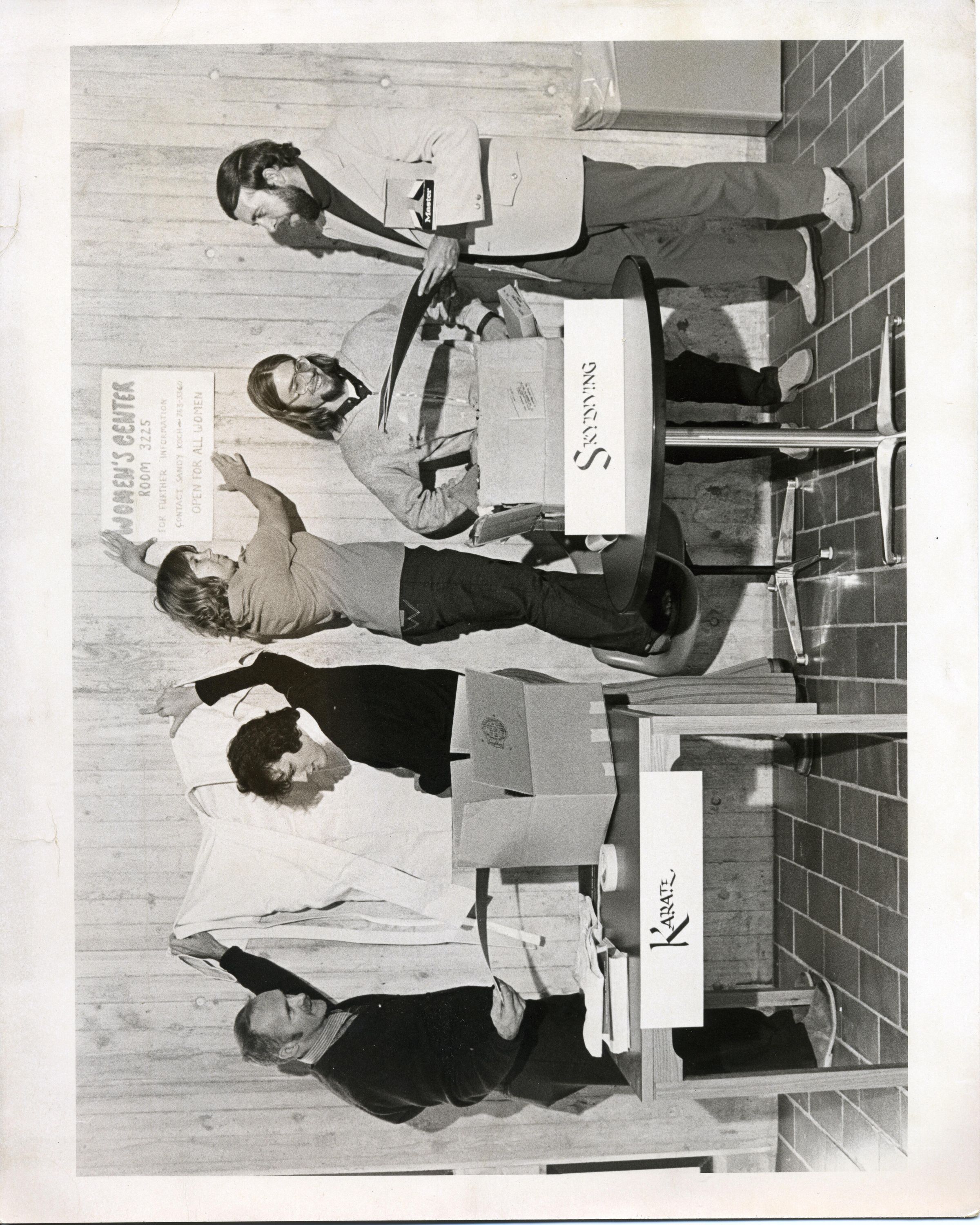 Black and white photo of five individuals holding various objects. On the left is a man that is partially bald with a mustache. He is wearing dark clothing over a striped shirt and dark tie. He is holding a paper or cardboard in one hand and with the other is holding one side of a white robe high against the wall. Next to him is a man with dark curly hair who is holding the other side of the robe. In the center is a woman standing on a chair holding a sign that says "Women's Center Room 3225 [two lines unreadable] Open For All Women". Next is a man with long hair and glasses. He has on a white sweater over a dark shirt. On the right is a man with dark hair and a beard He has on a light colored jacket over a dark sweater and dark trousers. He is holding a cardboard and has an open box squeezed between his arm and body. In the foreground, on the left, is a square table with boxes, a book, and a a roll of tape. A sign fastened to the front says "Karate". On the right is a round table with boxes and a sign that says "Skydiving". The floor is made up of tiles and the wall in the background appears to be louvered. A wastebasket is on the extreme right side. There is a white border on all sides. There is no information on the back.Made/Created