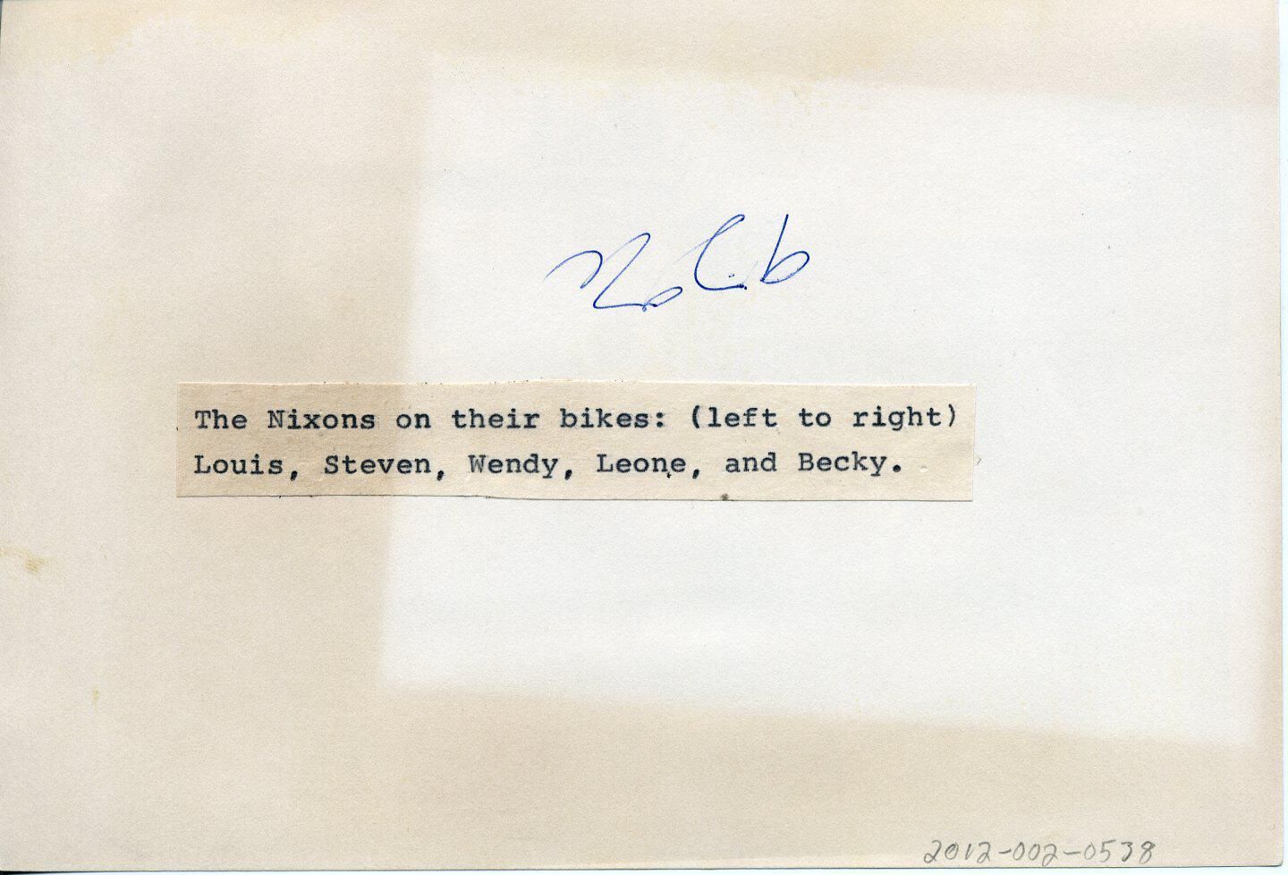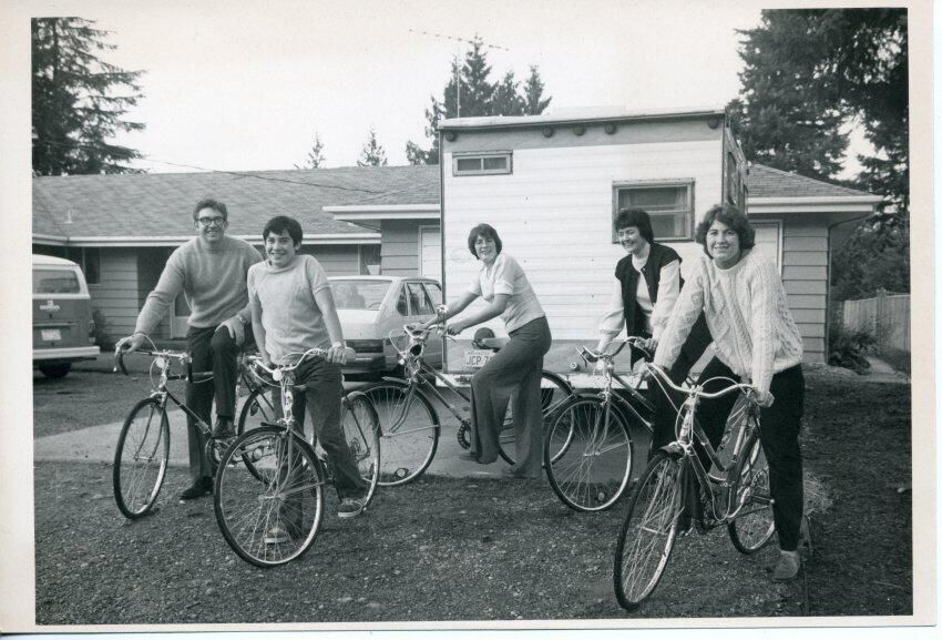 Black and white photo of five members of the Nixon family standing beside or astride bicycles. On the left is Louis. He has short dark hair and is wearing glasses. He has on a light colored sweater over dark trousers. Next is Steven who has short dark hair and is wearing a white sweater over dark trousers. Next is Wendy who has dark hair and is wearing a white sweater over dark trousers. Next is Leone who has dark hair and is wearing a dark vest over a white top with dark trousers. On the right is Becky who has medium length dark hair and is wearing a white sweater (with ribs) over dark trousers. The female members of the family are standing by "girls" bicycles in that they have no upper bar. All the bicycles have brake and gear-shifting cables visible. The family is assembled on a gravel driveway and behind them is a travel trailer and two motor vehicles. Further in the background is a house with trees behind it. There is a white border on all sides. On the back in ink is "92%" and typed on a pasted-on paper is "The Nixons on their bikes: (left to right) Louis, Steven, Wendy, Leone, and Becky".