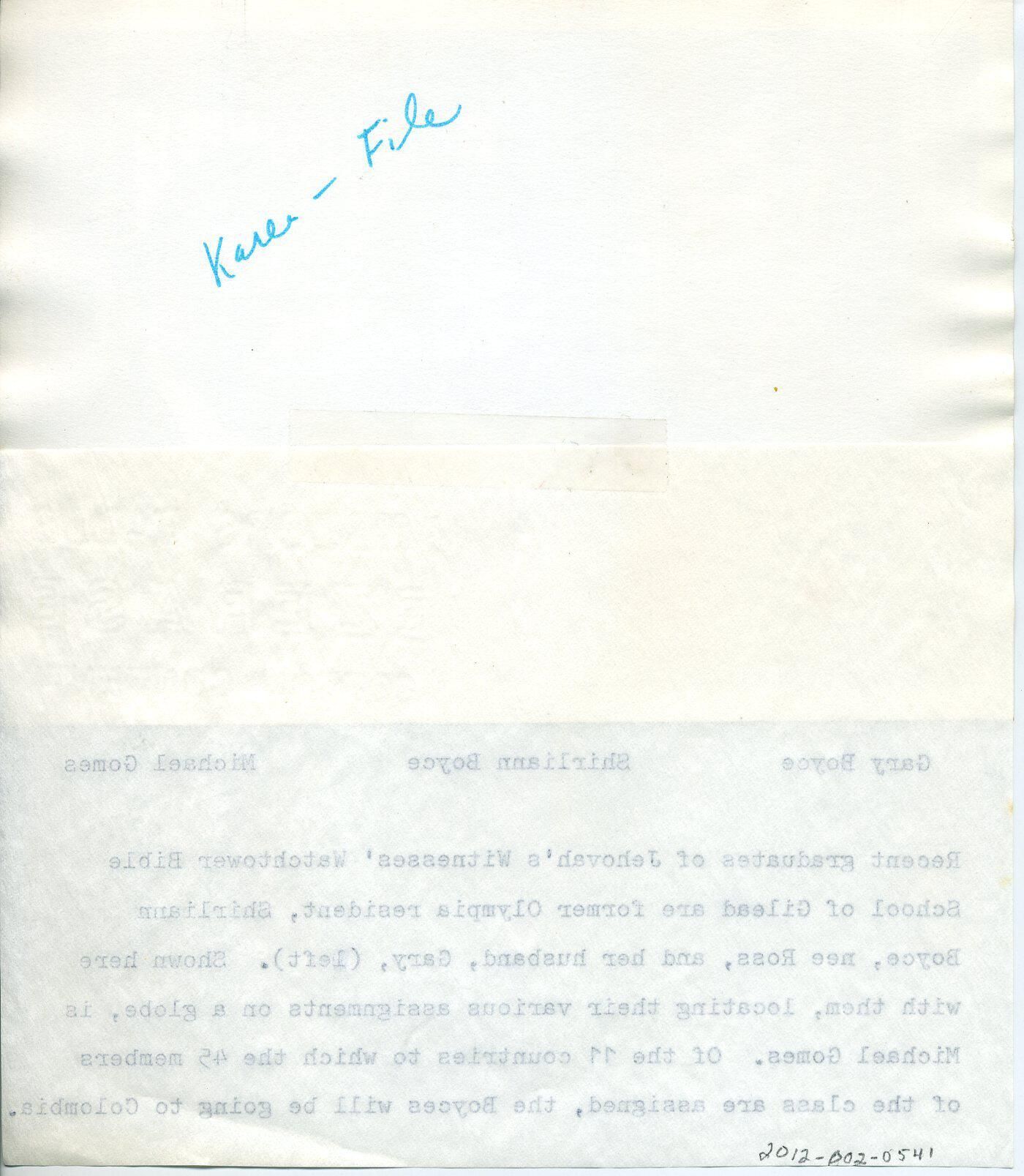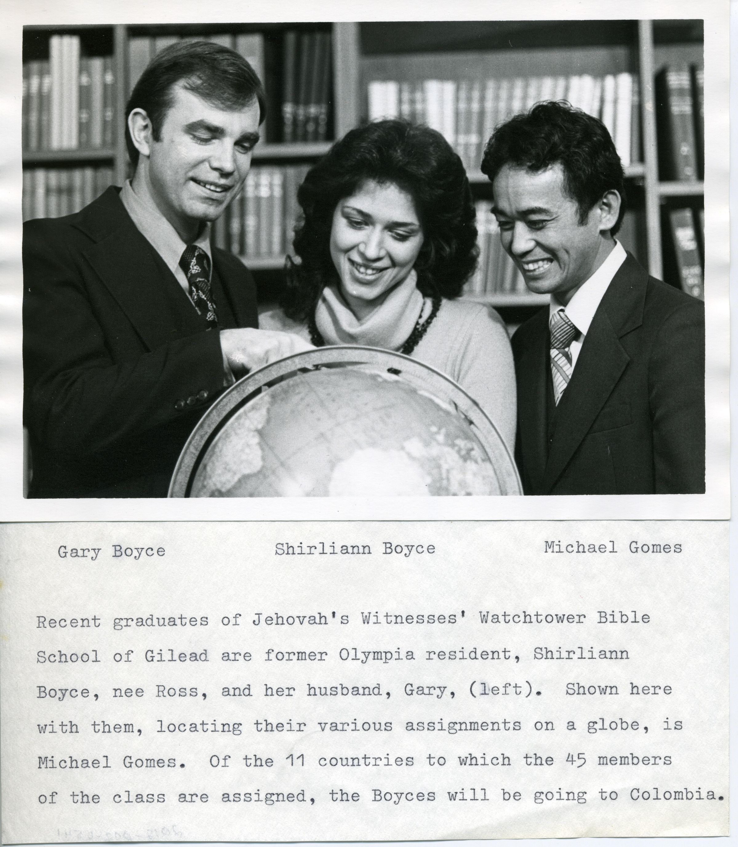 Black and white photo of three individuals. On the left is Gary Boyce. He has medium length dark hair and is wearing a dark suit over a white shirt and a patterned tie. In the center is Shirliann Boyce. She has long dark hair and is wearing a white sweater with a full collar and a black necklace. On the right is Michael Gomes. He has short curly, dark hair and is wearing a dark suit over a white shirt and a patterned tie. In front of the three is a world globe and Gary is pointing at it. In the background are shelves with books. There is a white border on all sides of the print and a paper is affixed to the print with scotch tape On the paper is typed "Gary Boyce Shirliann Boyce Michael Gomes Recent graduates of Jehovah's Witnesses' Watchtower Bible School of Gilead are former Olympia resident Shirliann Boyce, nee Ross, and her husband Gary, (left). shown here with them, locating their various assignments on a globe, is Michael Gomes. Of the 11 countries to which the 45 members of the class are assigned, the Boyces will be going to Columbia.". On the back in blue ink is "Karen - File".Made/Created