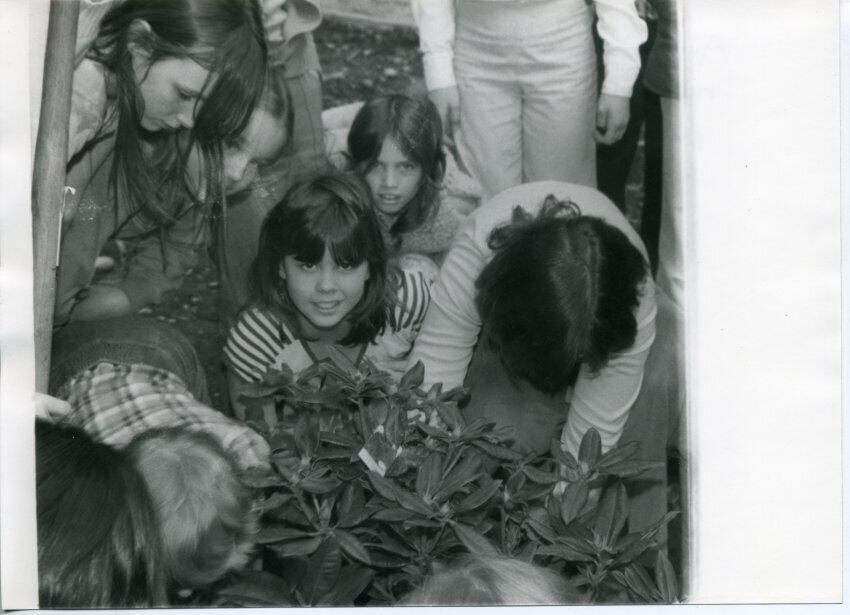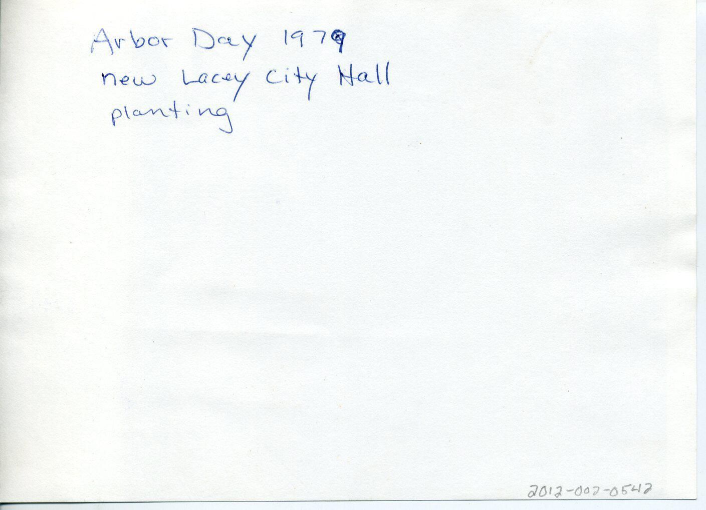 Black and white photo of a group planting at Arbor Day at Lacey City hall. In the lower left is a head of dark hair and a head of light hair over a plaid shirt. In the upper left is the face of a girl with long dark hair. Beside her is the face of another girl with dark hair. In the center of the print is a girl with dark hair, looking at the camera, wearing a white top with stripes on the shoulders. Behind her is another girl with dark hair and a light colored sweater On the right is the top of a head with dark hair over a white top. Behind all of them are portions of people's bodies and in front of all of the people is a plant resembling a Rhododendron. At the very bottom is a small portion of light colored hair. There is a small white border on the left side and a large white border on the right. On the back in ink is "Arbor Day 1979 New Lacey City Hall planting".Made/Created