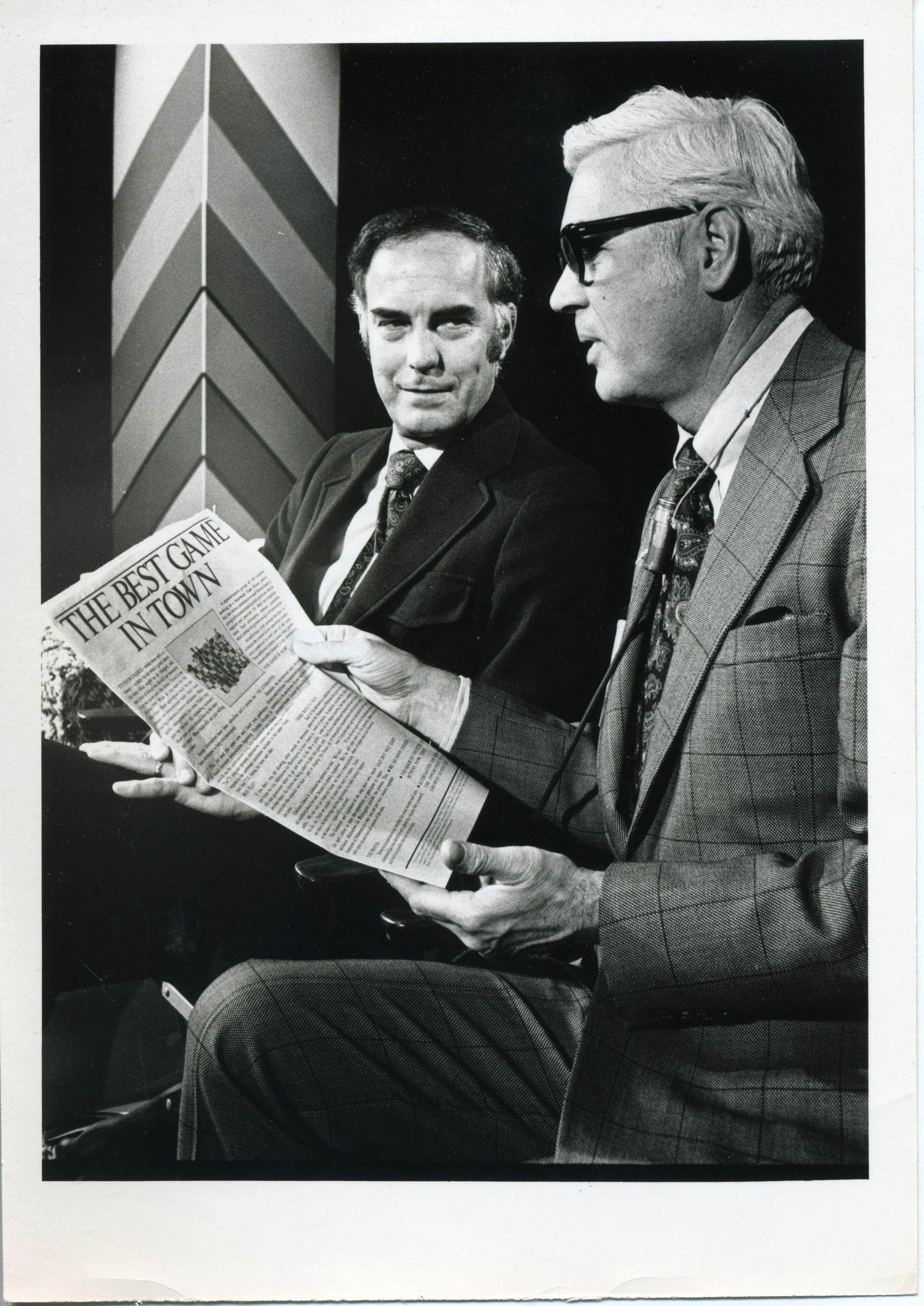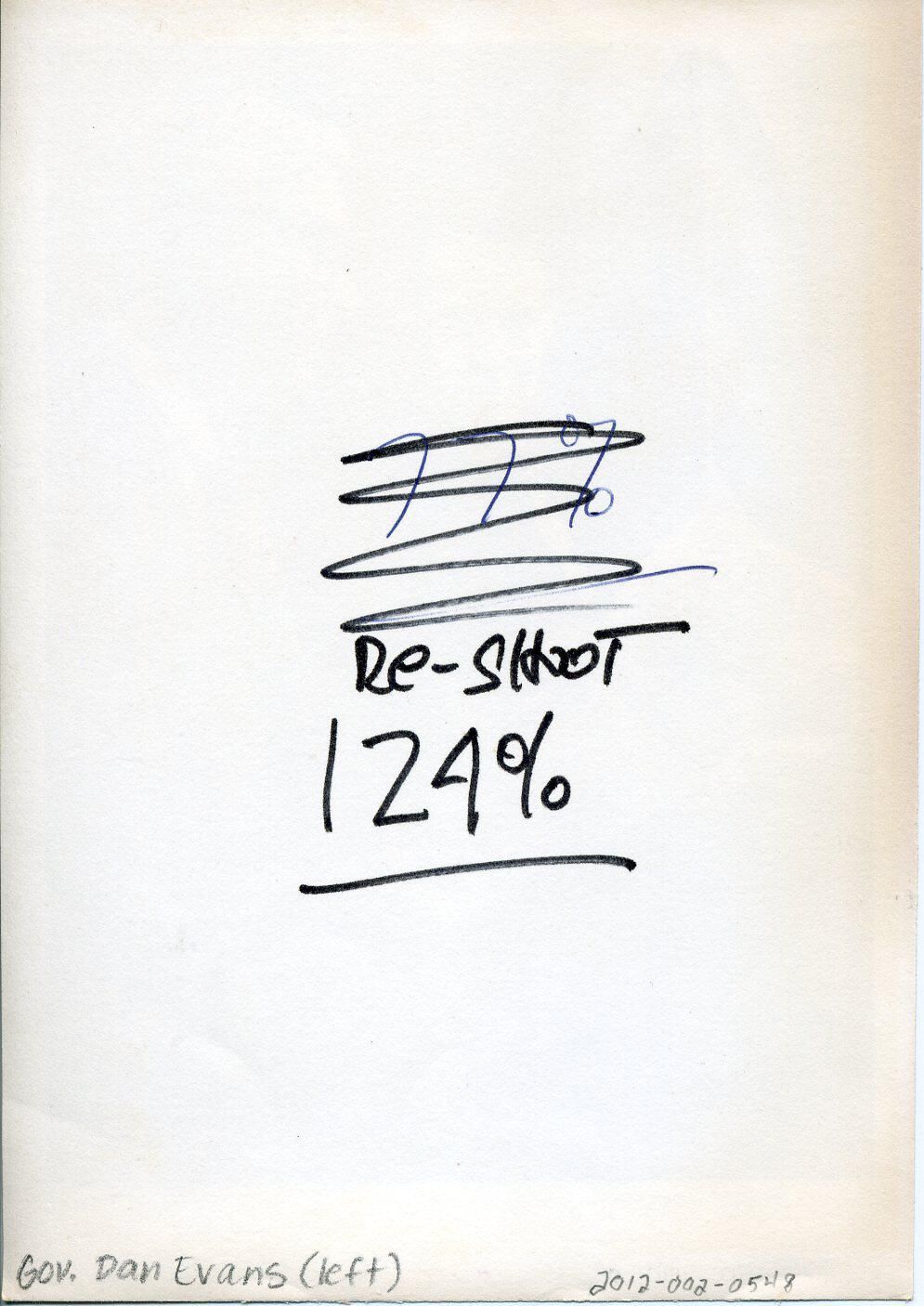 Black and white photo of Governor Dan Evans and an unidentified man. Evans has dark hair and is wearing a dark suit over a white shirt and a patterned tie. He is looking at the other man. The man on the right has medium length gray hair and is wearing glasses. He has on a gray, patterned suit over a white shirt and a patterned tie. There is a wire assembly that extends up and over his collar. He is holding small newspaper with the headline "The Best Game in town". The arm of a chair and what appears to be a waste basket and also visible. In the background is a large triangular object that has alternate dark and white stripes in the form of chevrons. A white border is on all sides and the bottom border is larger. On the back in ink is "77%" which is crossed out in felt pen and in the same felt pen is "Re-Shot 124%". In pencil is "Gov Dan Evans (left)".