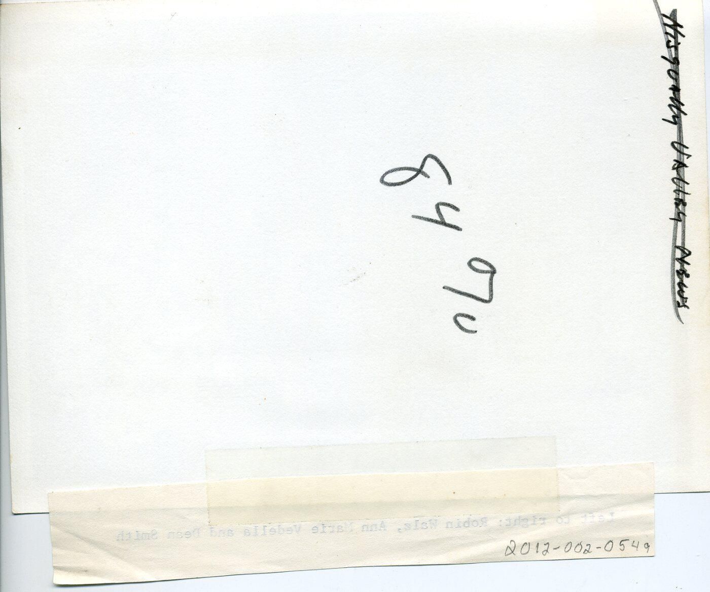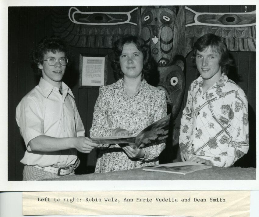 Black and white photo of three individuals. On the left is a boy with dark hair and glasses. He is wearing a white shirt, a white belt, and checked trousers. In the center is a girl with dark hair. She has on a patterned dress. On the right is a boy with dark hair who is wearing a shirt with large decorations. The boy on the left and the girl are holding a booklet or pamphlet. In front of them is a table with a paper or booklet on it. Behind the three is a wall with a Native American carving with what appears to be faces and wings. There is also a framed paper with printing on it. There is a white border on all sides. A piece of paper has been taped to the print that has typed on it "Left to right: Robin Walz, Ann Marie Vedella and Dean Smith". On the back in felt pen is "Nisqually Valley News [crossed out] 84%".