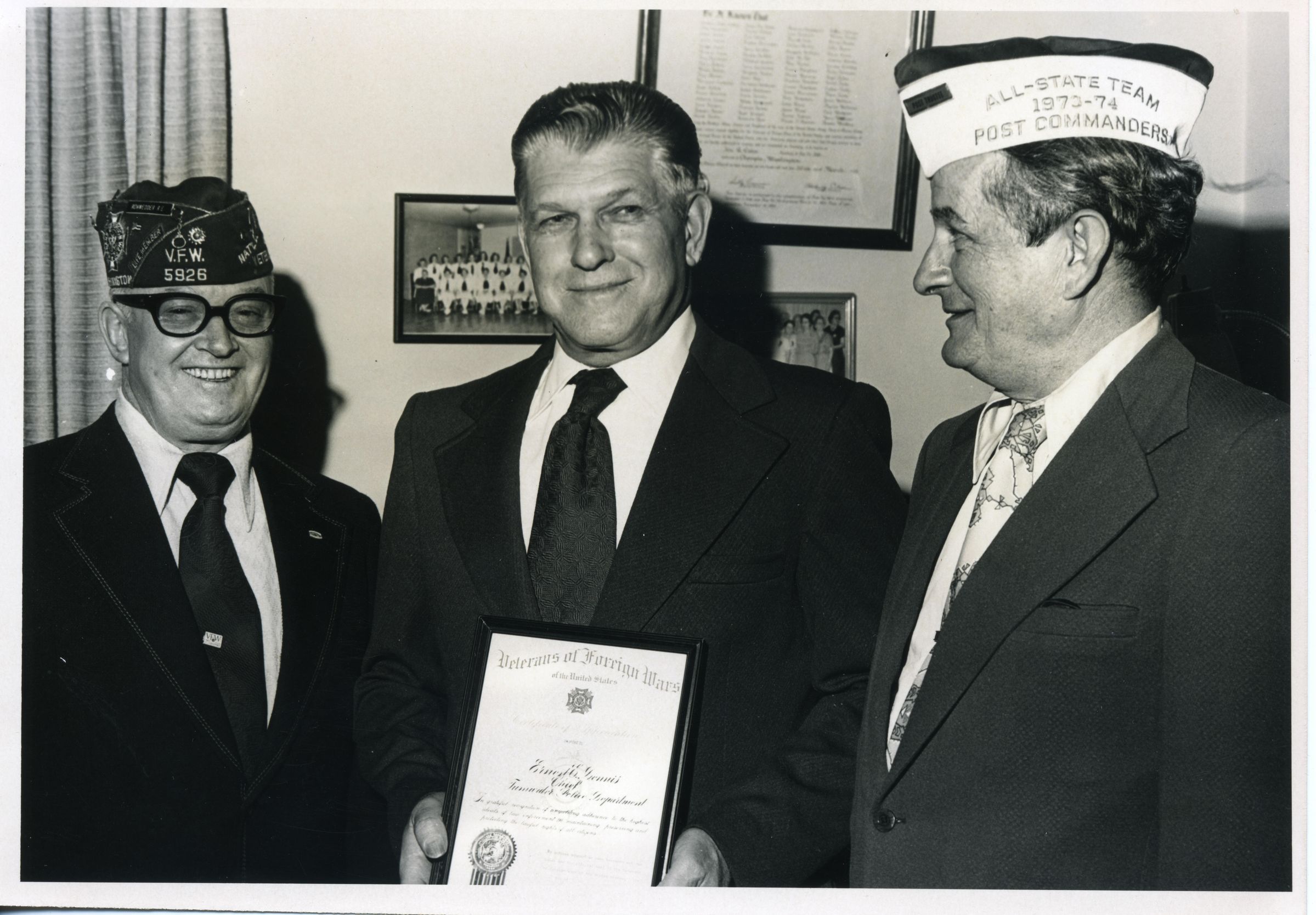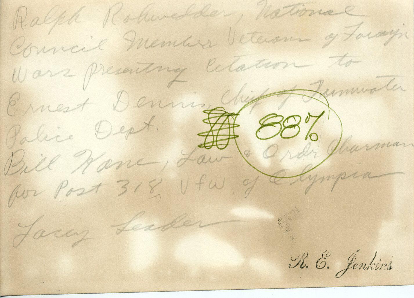 Black and white photo of three individuals. The man on the left has on a hat and glasses and is wearing a dark suit over a white shirt and dark tie. Several symbols and insignia are visible on his hat including "V.F.W. 5928". He has a membership-type pin in his lapel and on his tie. The man in the center has dark hair and is wearing a dark suit over a white shirt and dark tie. He is holding a framed citation with a seal and writing , part of which says "Veterans of Foreign Wars". The man on the right has on a hat over dark hair. He has on a dark suit over a white shirt and patterned tie. His hat has printed on it "All-State Team 1972-74 Post Commanders. On the wall behind the men are framed photos and a framed document. Curtains are visible on the left. There is a white border on all sides. On the back in pencil is "Ralph Robwedder, National Council Member Veterans of Foreign Wars presenting Citation to Ernest Dennis, Chief of Tumwater Police Dept. Bill Kane, Law & Order Chairman for Post 318 vfw of Olympia Lacey Leader". A stamp in black ink says "R. E. Jenkins". Over the pencil writing is, in green ink, "80 [crossed out] 88%".