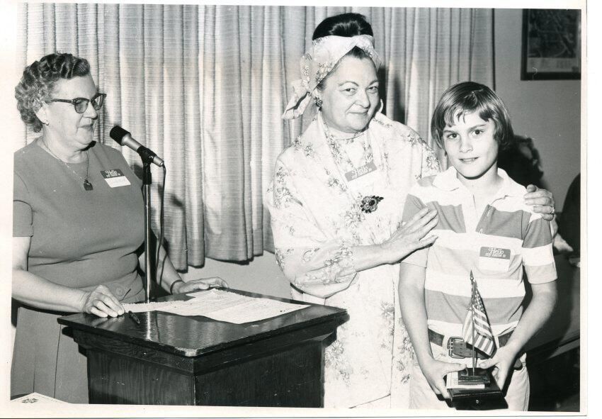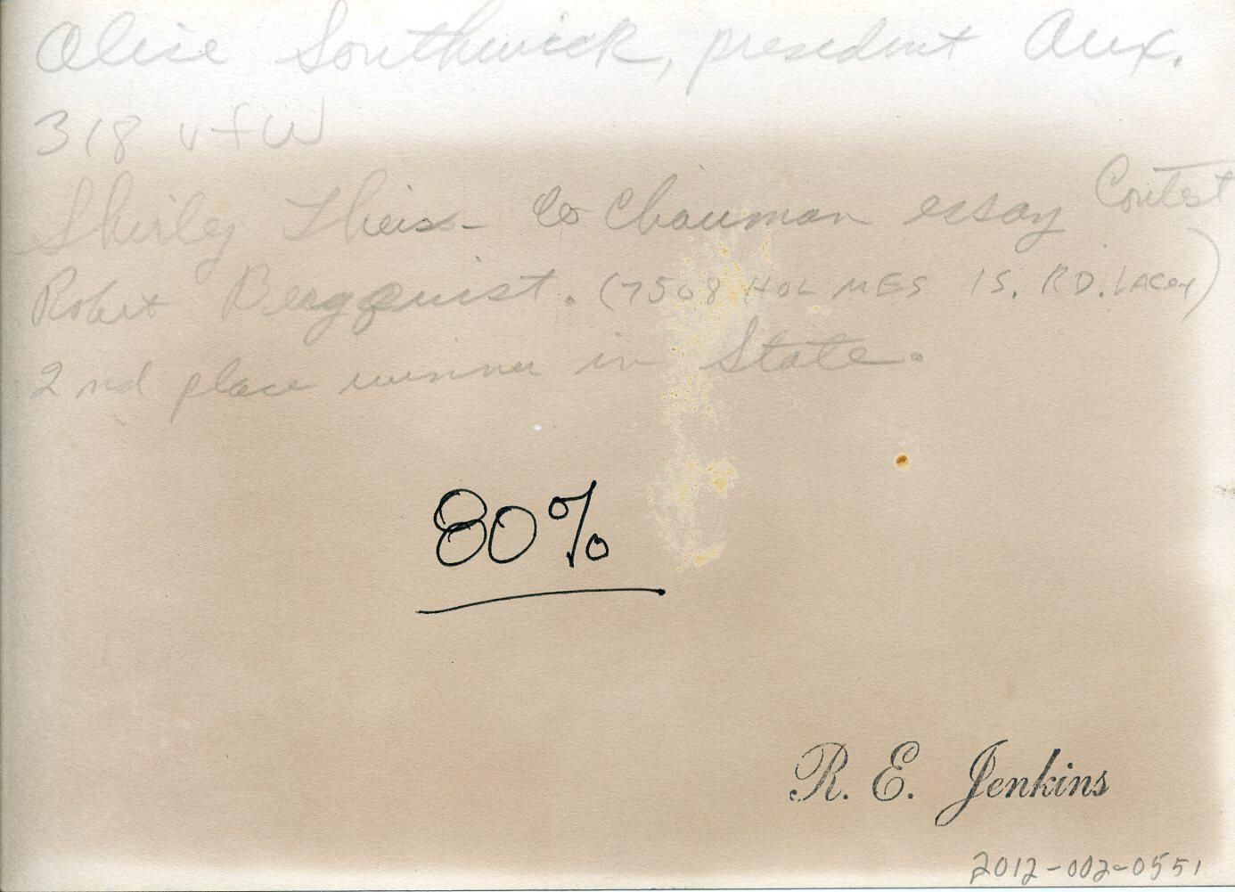 Black and white photo of three individuals. On the left is a woman with short dark hair and glasses. She is wearing a light colored dress with a pendant on a necklace and a name tag. She is standing in front of a podium with a microphone and has a paper on the table of the podium. In the center is a woman with dark hair and a bandanna. She has on a patterned dress with a pendant. She has her hands on the shoulders of the boy on the right who has long dark hair and is wearing a striped shirt above white trousers with a black belt. He is holding a plaque, a paper, and a U.S. flag on a stand. In the background are curtains and part of a wall with a picture. There is a white border on all sides. On the back in pencil is "Alice Southwick, president Aux.318 vfw Shirley Theis - Co Chairman essay Contest Robert Bergquist. (7508 Holmes Is. Rd. Lacey) 2nd place winner in State". In ink is "80%" and a stamp in black ink says "R. E. Jenkins".