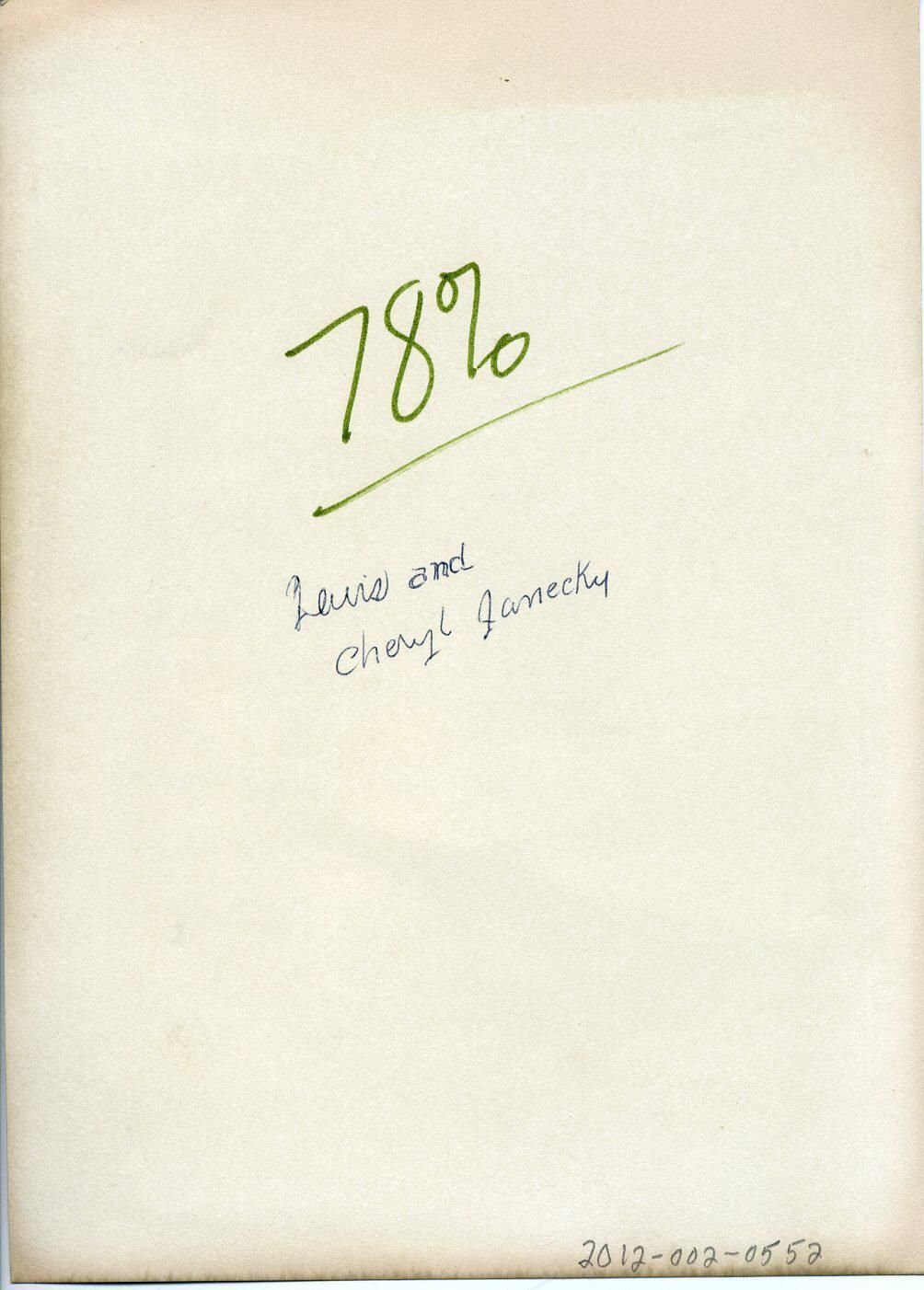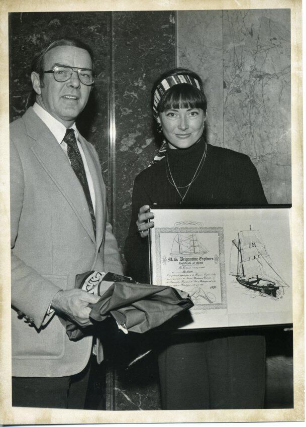 Black and white photo of a man and woman. The man has short dark hair and is wearing glasses. He has on a light colored jacket over a white shirt and dark patterned tie. He has dark trousers. The woman has dark hair with a hair band and is wearing a dark turtle-neck sweater and dark trousers. She has a two-strand necklace The man is holding what appears to be a flag or pennant and the woman is holding a framed document with a certificate on the left and a drawing of a sail boat on the right. The certificate says in part "M. S. Brigantine Explorer Certificate of Merit". In the background is a wall with marble, both dark and light. There is a white border on all sides. On the back in ink is "Lewis and Cheryl Janecky" and in green felt pen "78%".