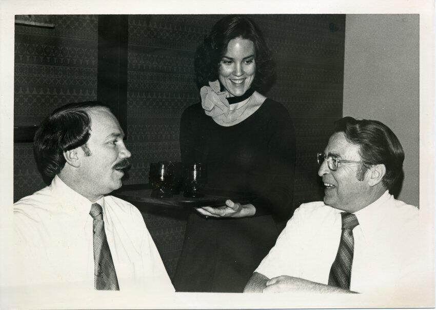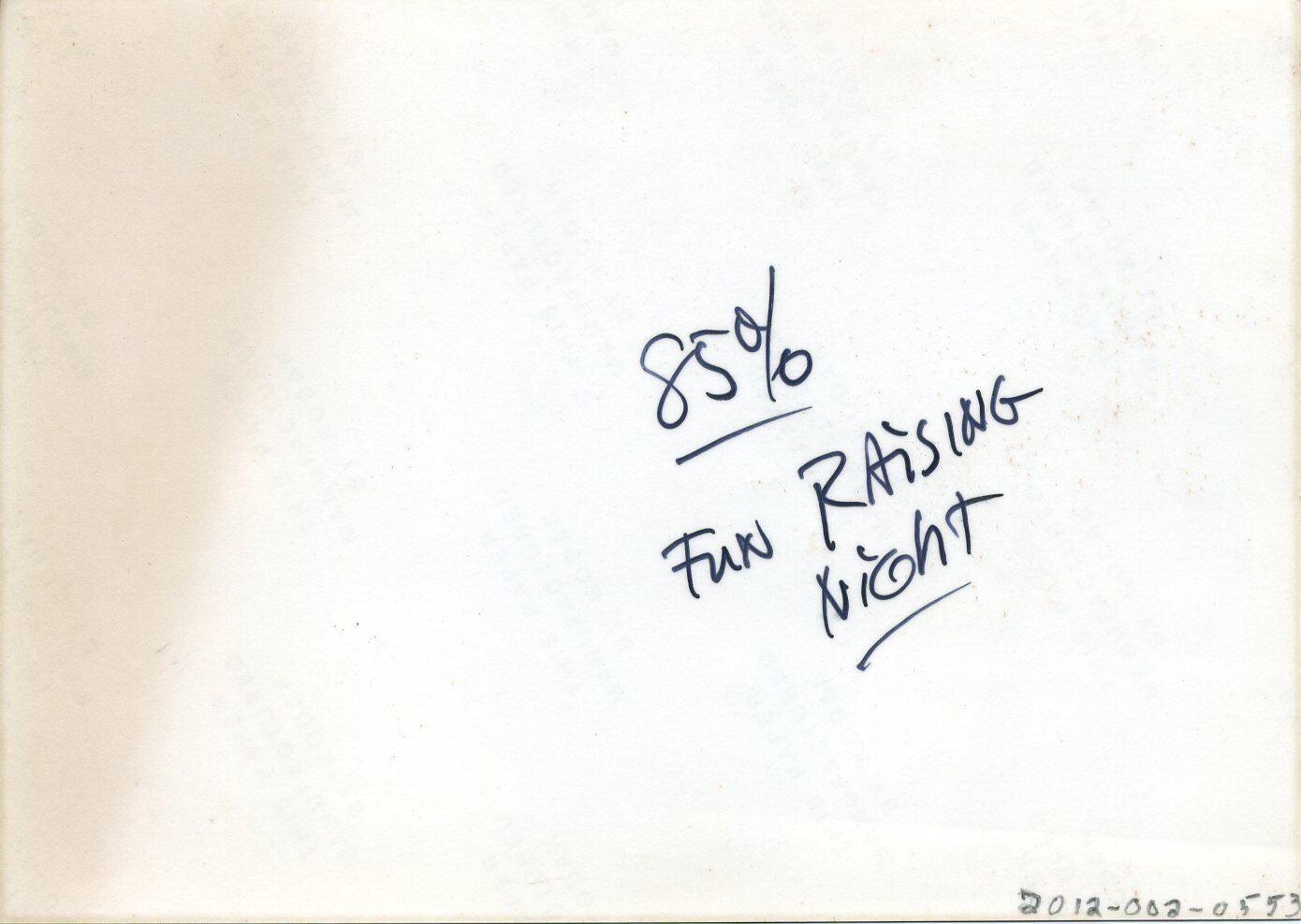 Black and white photo of two men and a woman. The man on the left has long dark hair in a curl and a mustache He is wearing a white shirt and a dark striped tie. The man on the right has medium length dark hair and is wearing glasses. He has on a short sleeve white shirt and a striped tie. Behind them, in the center of the print, is a woman who seems to be a waitress. She has dark hair and is wearing a dark dress with a white collar or scarf. She is holding a tray with glasses on it. In the background is a wall with wallpaper showing both dark and light colors. There is a white border on all sides. On the back is "85% Fun Raising Night".