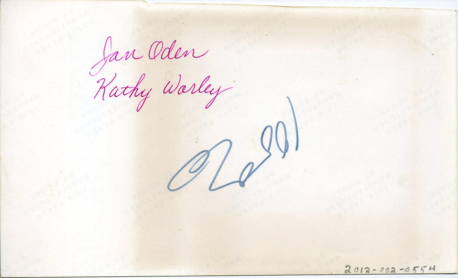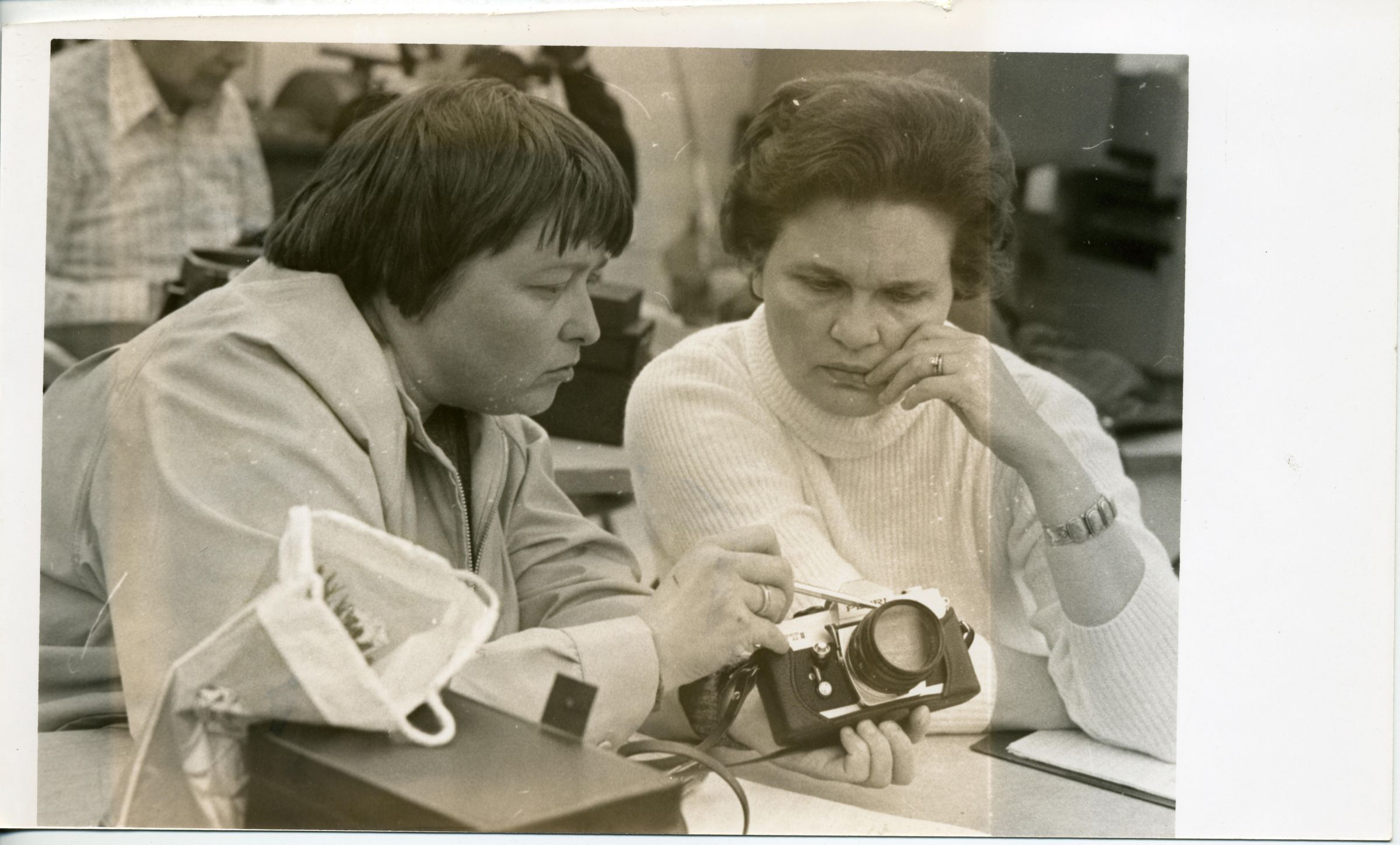 Black and white photo of two women sitting at a table. The woman on the left has short dark hair and is wearing a light colored coat or jacket. The woman on the right has medium length dark hair and is wearing a white turtle neck sweater. A watch band or bracelet is visible on her arm. The woman on the left is holding a camera and is pointing to it with a pen or pencil Other items are visible on the table including a draw-string bag. In the background are other persons. The image is crooked on the print so that the white border is unequal, with no border at the bottom and a larger border at the right. On the back in red ink is "Jan Oden Kathy Worley" and in blue ink "100%:.