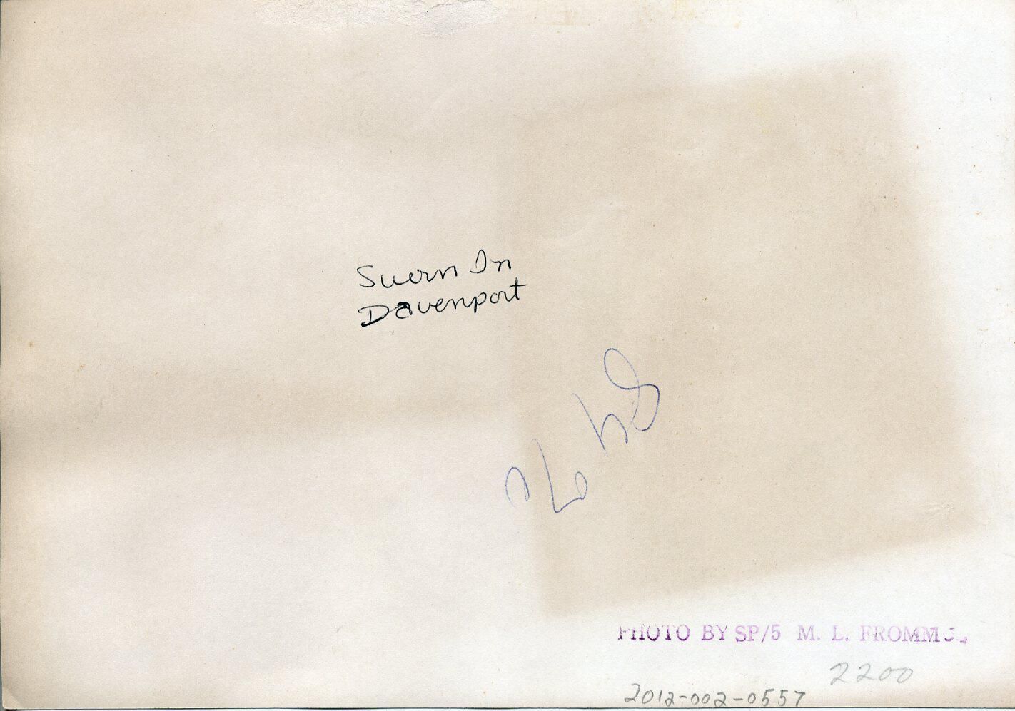 Black and white photo of two men in military uniforms with white shirts and dark ties. Both have their hands raised as if swearing or giving an oath. The man on the left has short dark hair and is wearing glasses. On his uniform are visible buttons, service ribbons, an organizational patch, and a name tag that says "Davenport". The man on the right has short dark hair and also has buttons, service ribbons, and a patch that says "IX" on his uniform. On his shoulder is what appears to be the rank insignia of Colonel. In the background is a U. S. flag and numerous ribbons with dates on them. There is also a cloth with portions of the words "United States" and the date "1776". There is a white border on all sides. On the back in ink is "Sworn in Davenport" and "84%". A red stamp says "Photo by SP/5 M. L. Fromms". In pencil is "2200".