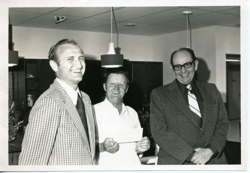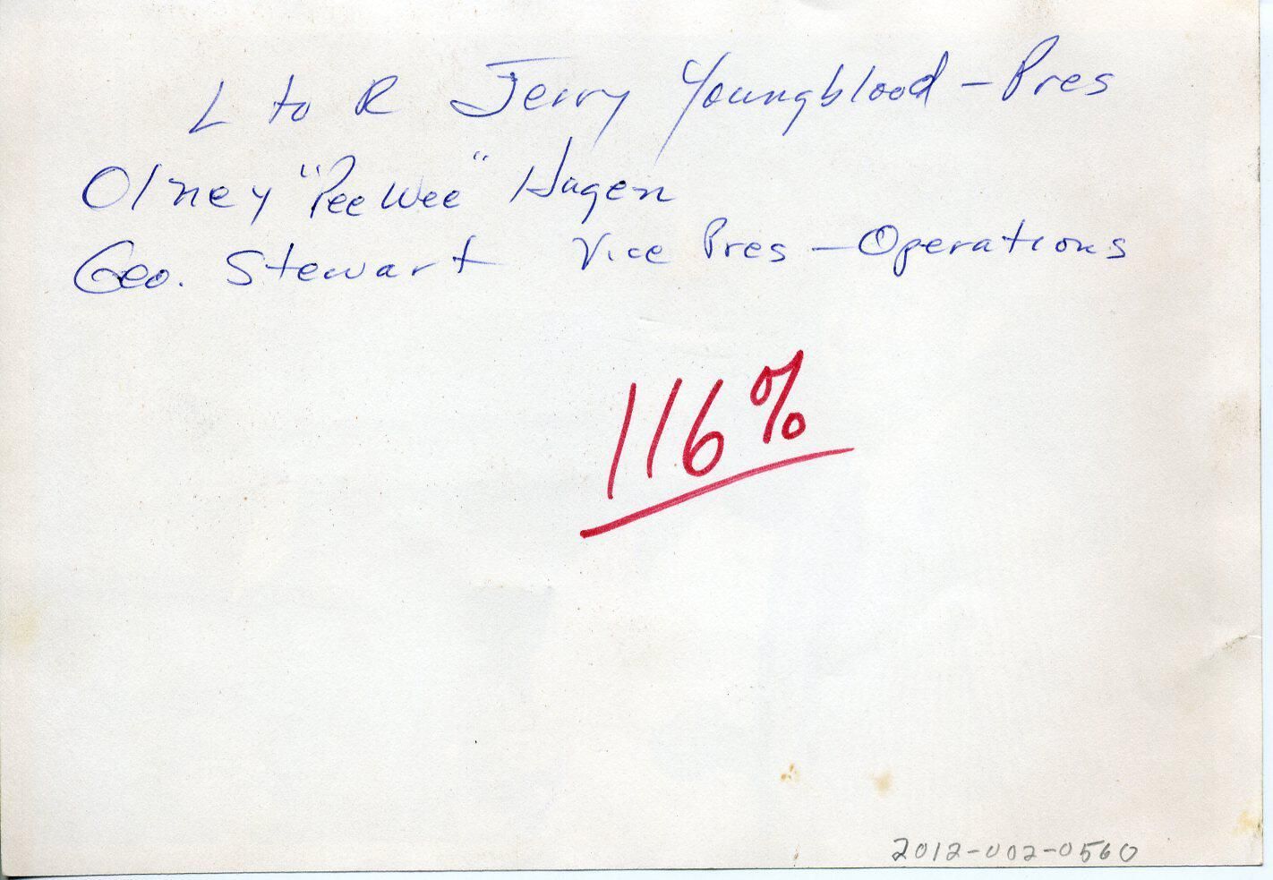 Black and white photo of three men. On the left is Jerry Youngblood. He has short dark hair and is wearing a checked jacket over a white shirt and dark tie. In the center is Olney Hagen. He has short dark hair and is wearing a white shirt open at the collar. He is holding a paper or envelope. On the right is George Stewart. He has on a dark suit over a dark shirt and white striped tie. He is wearing glasses and has his hands clasped. In the background are light fixtures, ceiling features, curtains, mugs on a shelf, and flower decorations. There is a white border on all sides. On the back in ink is "L to R Jerry Youngblood - Pres Olney 'PeeWee' Hagen Geo. Stewart Vice pres - Operations" and in red ink " 116%".