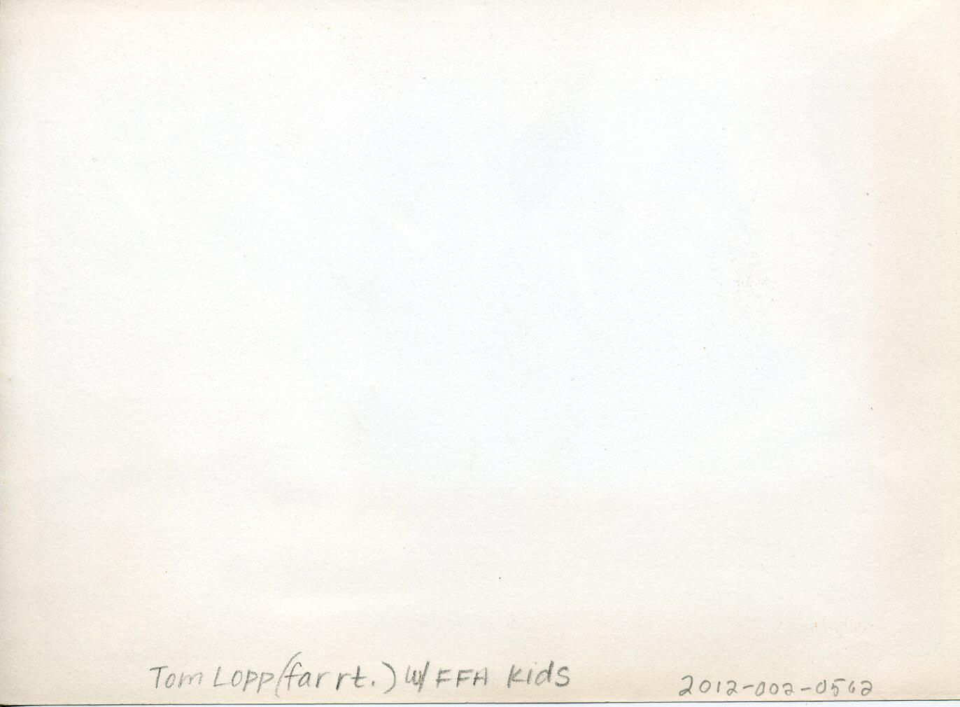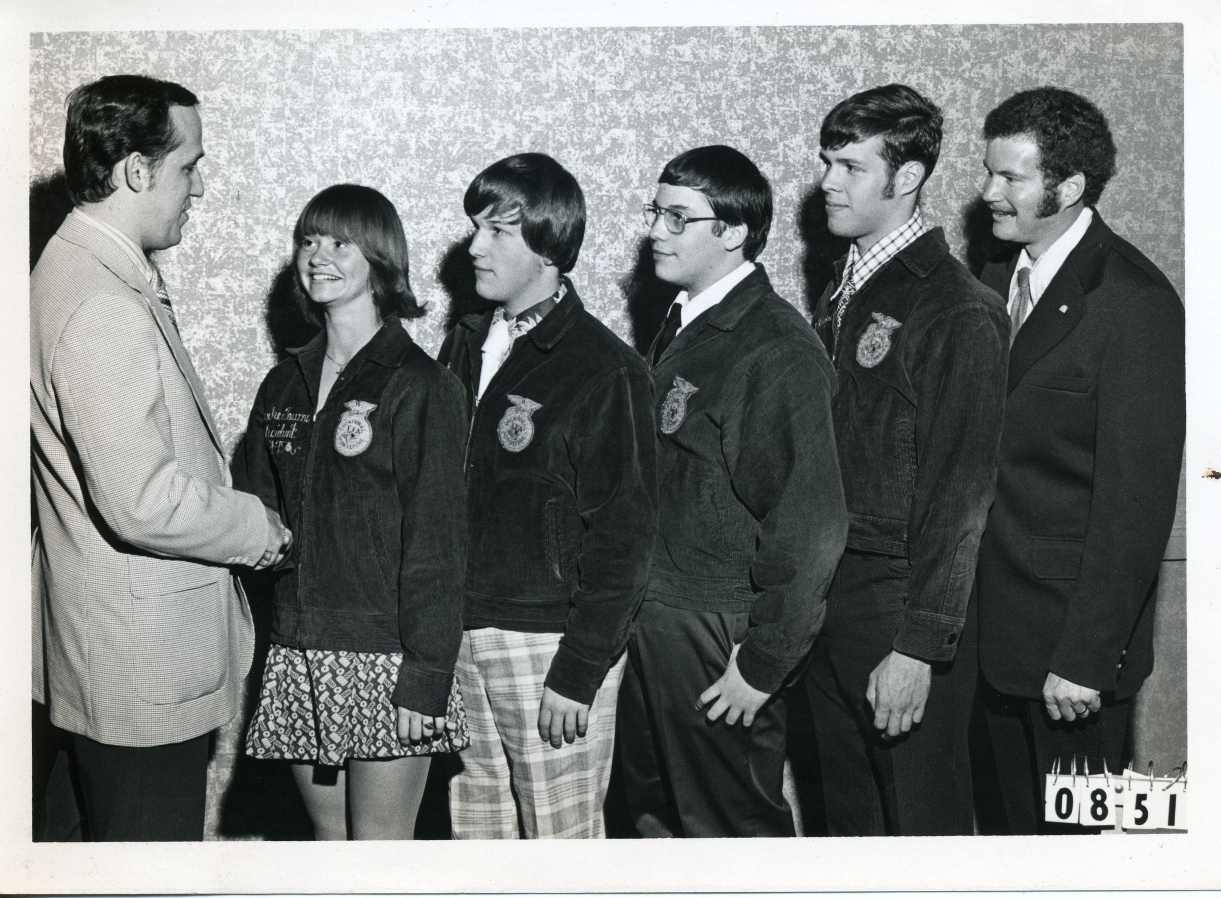 Black and white photo of six individuals. On the left is a man with short dark hair who is wearing a light colored jacket over a white shirt and a striped tie. He has dark trousers. He is shaking hands with a girl with medium length dark hair who has on a dark jacket above a short patterned skirt. Next is a boy with dark hair and a dark jacket over a patterned shirt and white tie. He has on checked trousers. Next is a boy with dark hair and glasses. He is wearing a dark jacket over a white shirt and dark tie. He has on dark trousers. Next is a boy with dark hair and wearing a dark jacket over a checked shirt and patterned tie. He has dark trousers. At the right is a man identified as Tom Lopp. He has dark hair and long sideburns. He has on a dark suit over a white shirt and light colored tie. On the jackets of all the young people are the emblem of Future Farmers of America. At the bottom right is a stand with numbers mounted on wires that reads "08-51". In the background is patterned wall paper. There is a white border on all sides. On the back in pencil is "Tom Lopp (far rt) w/ FFA kids".Made/Created