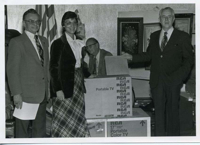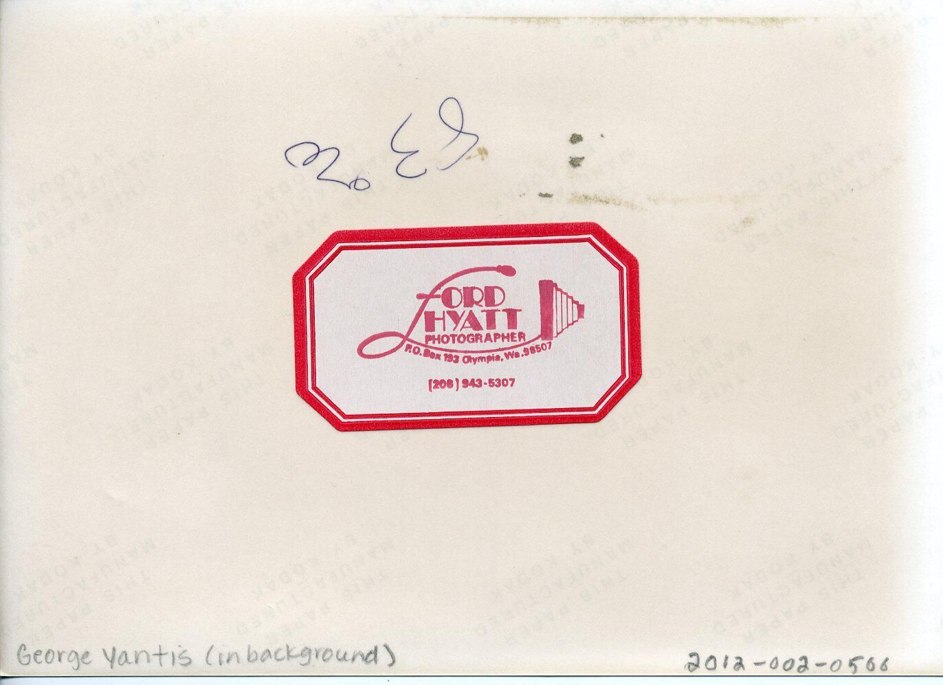 Black and white photo of four individuals. On the left is a man with short dark hair and glasses. He has on a light colored jacket over a white shirt and a striped tie. He has medium dark trousers. He is holding a paper in his hand. Next to him is a woman with short dark hair and glasses. She has a dark jacket over a white blouse with a large bow at her neck. She has on a plaid skirt. On the right is a man with short gray hair and glasses. He has on a dark suit over a white shirt and a striped tie. He is holding a file folder. In the background is sitting a man identified as George Yantis. He has short dark hair and glasses. He has on a light colored jacket over a white shirt and dark tie. Between the three persons in the forefront are boxes that hold or had held television sets. On the top box is printed "Portable TV" and "RCA" repeated. On the bottom box is "RCA 17" Portable Color TV" along with an arrow pointing up. On the wall in the background is a portion of a U. S. flag and pictures. There is a white border on all sides. On the back in ink is "83%" and in pencil "George Yantis (in background)". There is a pasted-on paper that says in red ink "Lord Hyatt photographers P.O. Box 193 Olympia, Wa. 98507 [206] 943-5307".