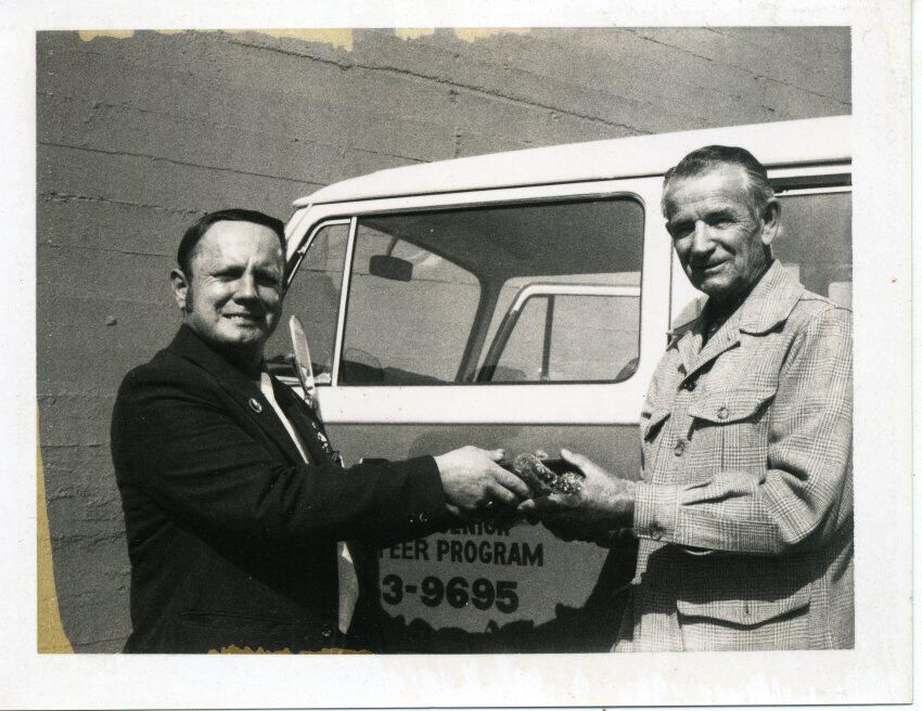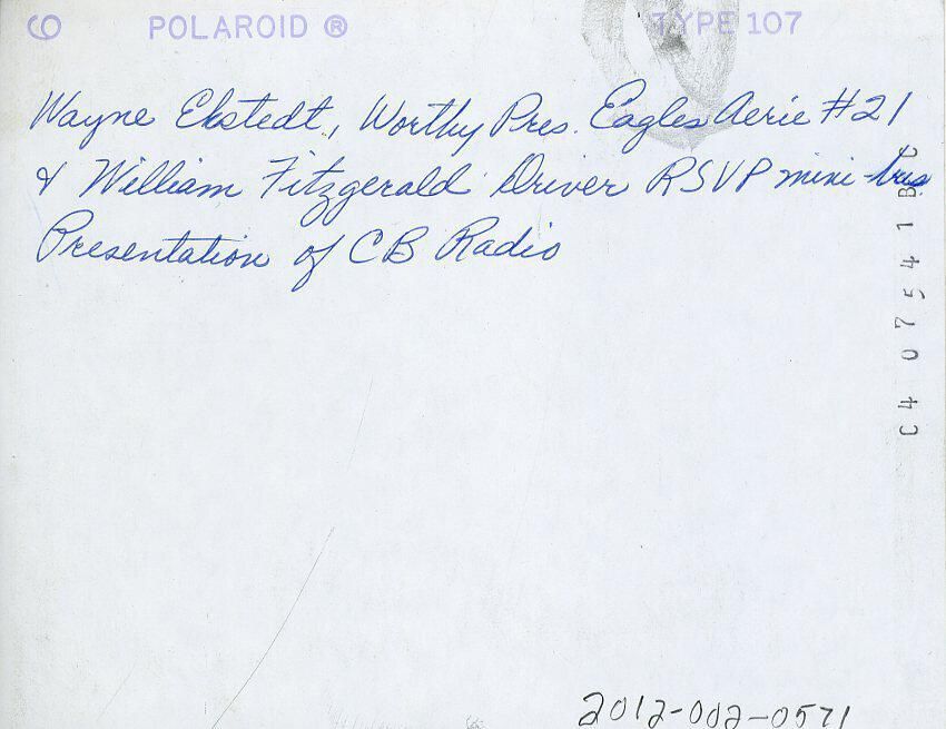 Black and white Polaroid image of two men. The man on the left, Wayne Ekstedt, has short dark hair and is wearing a dark suit over a dark shirt with a white tie. He is handing an object to William Fitzgerald who has short dark hair and is wearing a light colored coat over a dark shirt or sweater. Behind the men is a vehicle with printing on the door, the portion of which is visible saying "Program" and "3-9695". There is a white border on all sides. On the back in ink is "Wayne Ekstedt, Worthy Pres Eagles Aerie #21 & William Fitzgerald Driver RSVP mini bus Presentation of CB radio". Printed on the back is "Polaroid", "Type 107", and "C407541BC".Made/Created