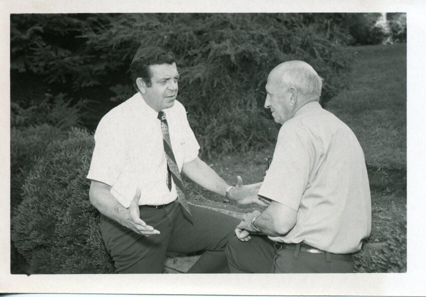 Black and white photo of two men. On the left is Hal Wolf. He has dark hair and is wearing a white short sleeve shirt with a striped tie and dark trousers. On the right is Wes Estes. He has short gray hair and is wearing a light colored shirt and dark trousers. Hal Wolf has his arms extended, and Wes Estes is mostly turned away from the camera. In the background are trees and shrubs. There is a white border on all sides. On the back in red ink is "Hal Wolf" and in blue ink is "Wes Estes". A stamp in black ink says "Photo by Jeffers Studio Olympia, Wash.".