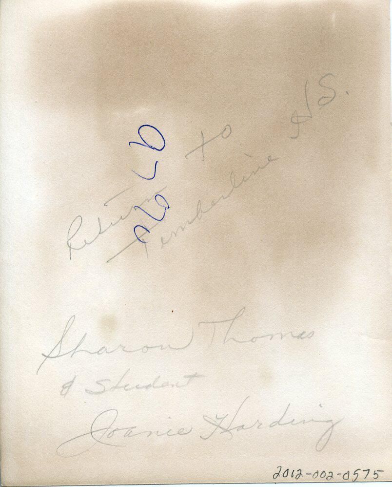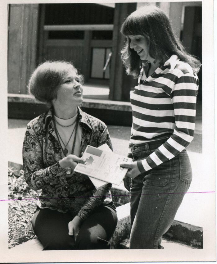 Black and white photo of two individuals. On the left is Sharon Thomas. She has medium length light colored hair and is wearing a patterned jacket over a white turtle neck sweater and dark trousers. She has a necklace with a pendent and is sitting while handing a paper to the person on the right. The person standing on the right is Joanie Harding. She has long dark hair and is wearing a striped sweater over dark pants. There is foliage beside Ms. Thomas and in the background is a portion of a building. There is a white border on all sides. A line in red ink has been drawn across the image near the bottom. On the back in pencil is "Sharon Thomas & student Joanie Harding" and "Return to Timberline H S" In ink is "97%".