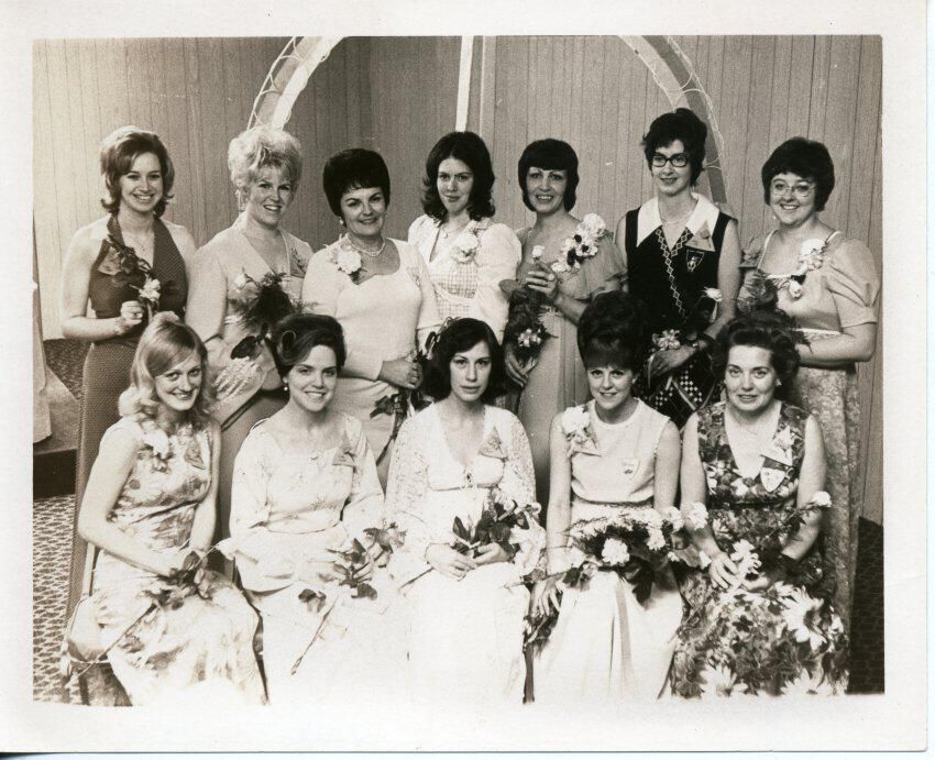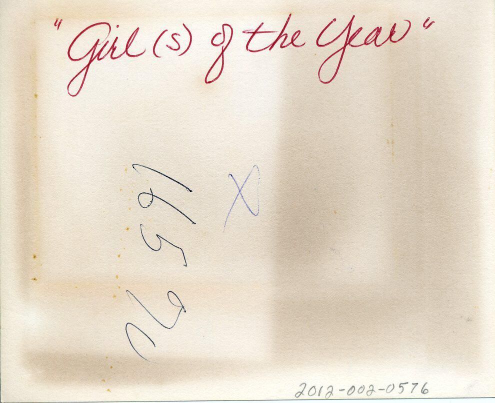 Black and white photo of 12 individuals. All are wearing formal gowns and are holding flowers. Five girls are sitting in front. On the left is a girl with long blond hair and a flowered gown. Next, a girl has short dark hair and a white gown. Next is a girl with medium length dark hair and a white gown. Next is a girl with a large dark hairdo and a white gown. On the right is a girl with long dark hair and a patterned gown. Standing in the back are 7 girls. On the left is a girl with medium length dark hair and a dark gown. Next is a girl with long blond hair and a white gown. Next is a girl with medium length dark hair and a white gown. Next is a girl with long dark hair and a white gown. Next is a girl with short dark hair and a tan gown. Next is a girl with short dark hair, glasses, and a dark gown with a white collar. On the right is a girl with medium length dark hair and a tan gown. In the background is a wooden wall and a circular decoration. There is a white border on all sides. On the back in red ink is "girl(s) of the year" and in blue ink "165%".