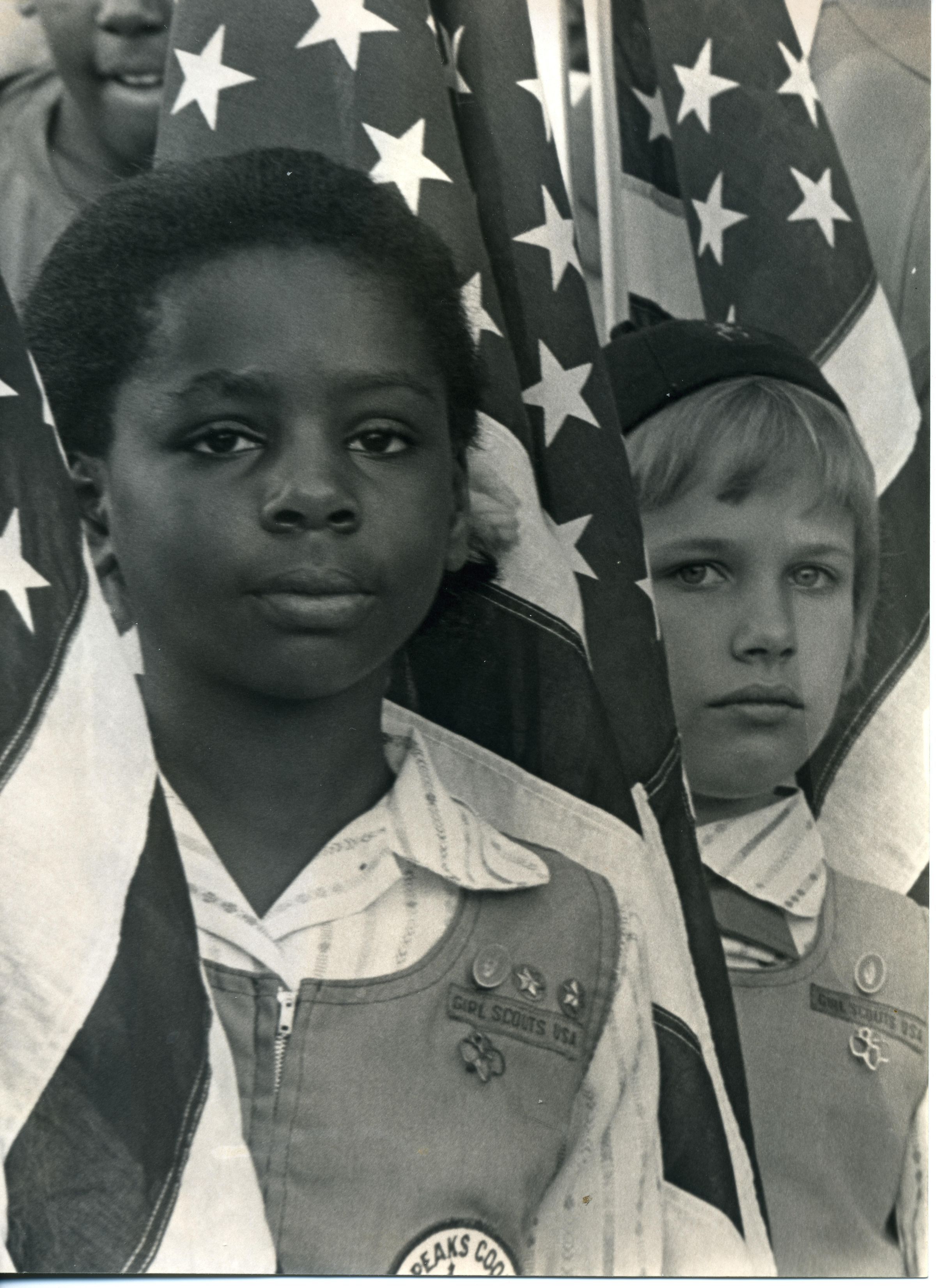 Black and white photo of two girls in Brownie uniforms that consist of a brown jumper over a patterned blouse. In the foreground is a girl with short kinky dark hair. Pins and insignia are visible on her jumper. Behind her is a girl with short light colored hair under a cap. Insignia is also visible on her jumper. The girls are standing among several U. S. flags. In the upper left corner of the image is part of a man's face. There is no border. On the back in ink is "100%".