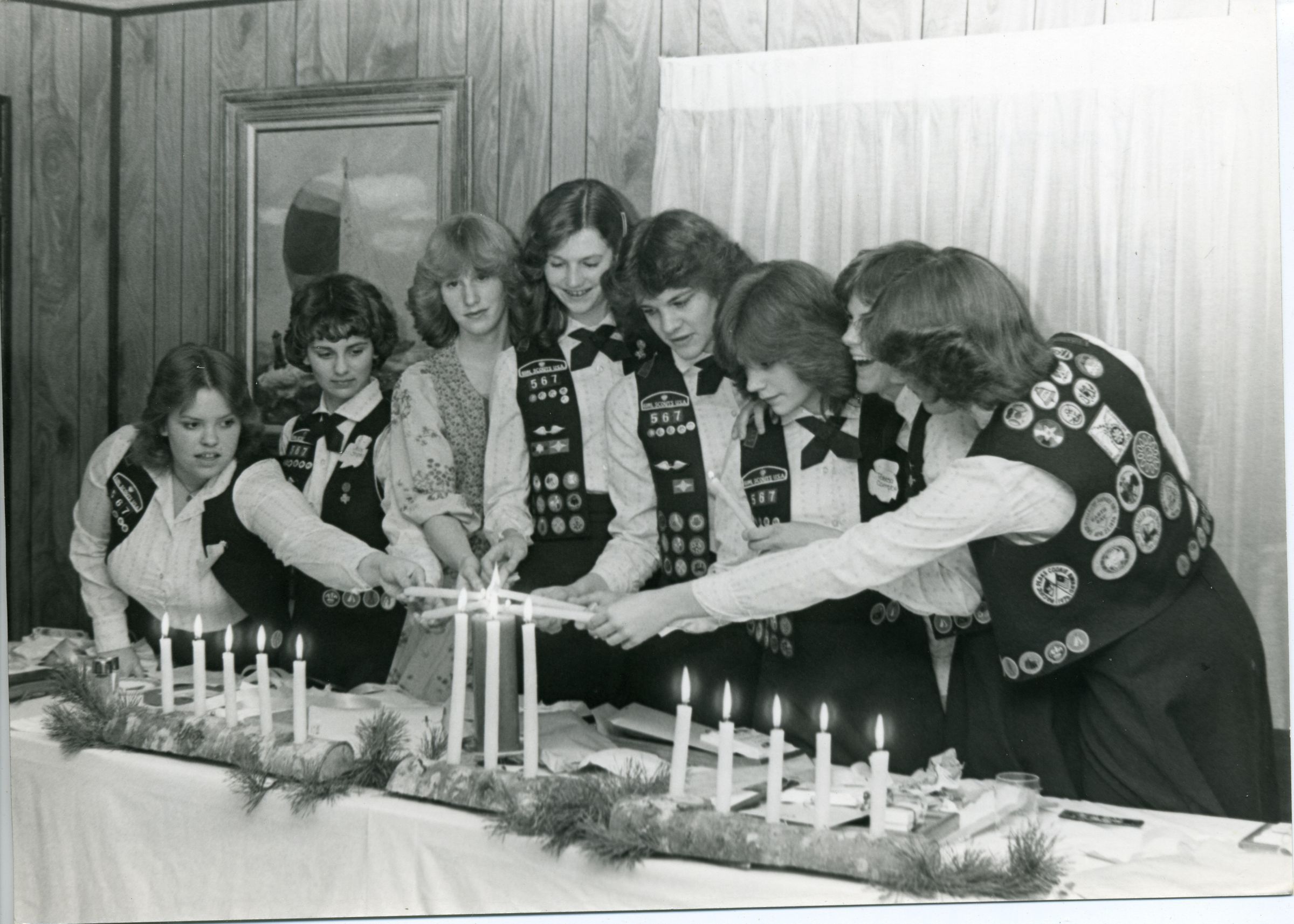 Black and white photo of 8 girls holding candles. Seven of the girls have on a Girl Scout Uniform that consists of a black vest with badges sown thereon over a white blouse and black skirt. The one exception is the girl third from left that has on a patterned jumper over a white blouse. She has light colored hair. All the other girls have medium length dark hair. The girls are extending their candles toward the center over a table with 13 burning candles on it. There is also what appears to be evergreen decoration on the table. In the background is a wall with curtains and a large picture in a frame. There is no border. On the back in black ink is "Troop 567 at First Class Ceremony 1977 March" and in blue ink is "#7". In blue felt pen is "72%".