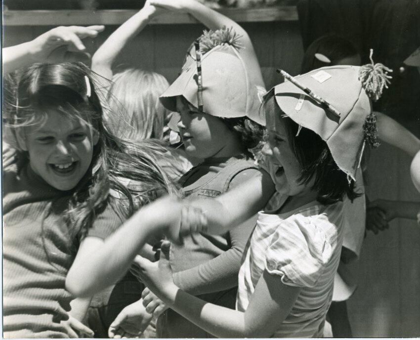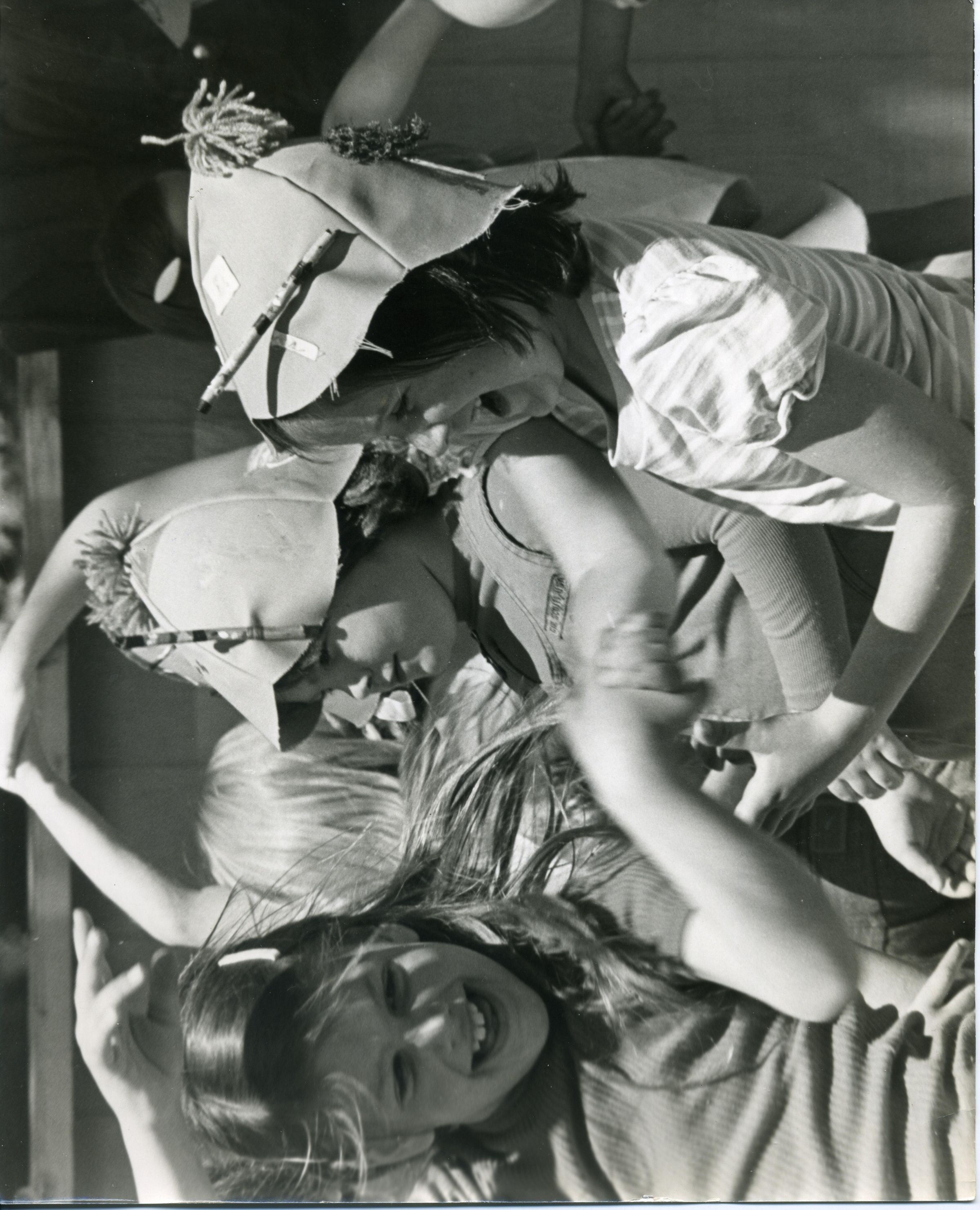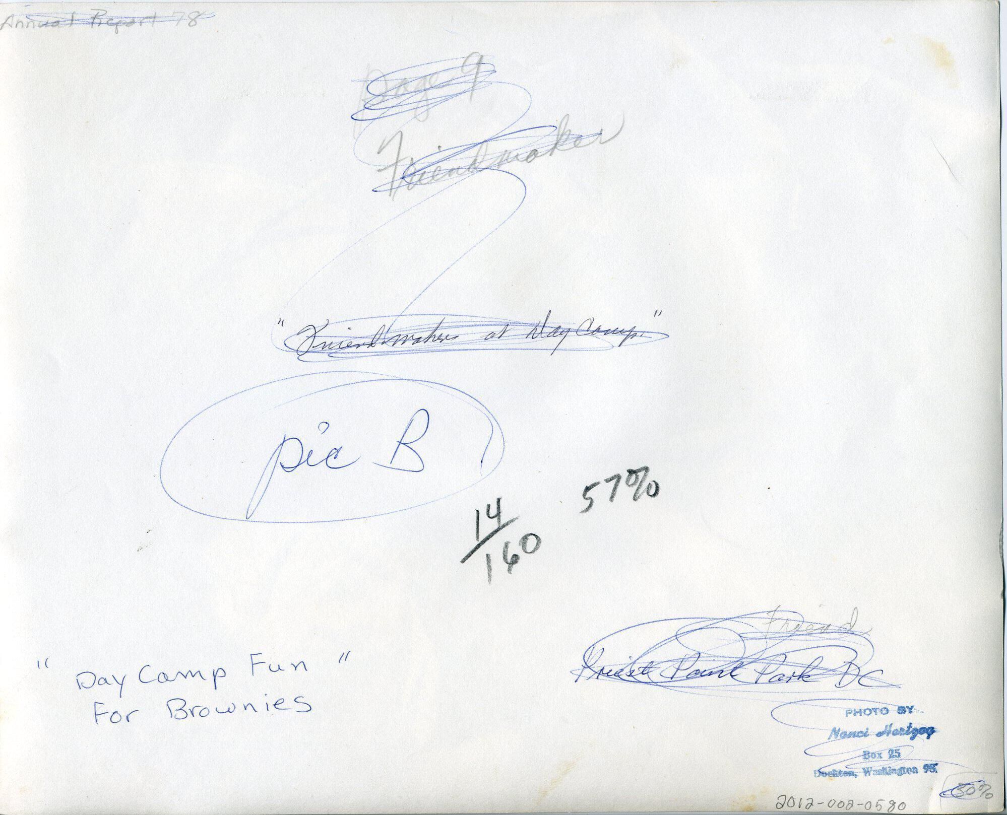 Black and white photo of four girls dancing. The girl on the left has long dark hair with a barrette and is wearing a medium dark sweater. Next is a girl with only her blond hair visible. The next two girls have cloth hats with a tassel at the top and what appears to be a pencil attached. The girl second from the right has a tan jumper over a tan shirt and the girl on the right has dark hair visible below the hat and is wearing a white shirt. The girls are holding hands as they spin in the dance. On the very right of the image are some hands and arms. A wall is visible in the background. There is no border. On the back in ink that has been crossed out is "page 9 friend maker", "friend makers at day camp", "50%", and "Priest Point Park DC". A stamp in blue that is crossed out says "photo by Nanci Hertog Box 25 Dockton, Washington 98". Not crossed out is "pic B" and "Day Camp fun for Brownies". In black felt pen is "14/160 57%".