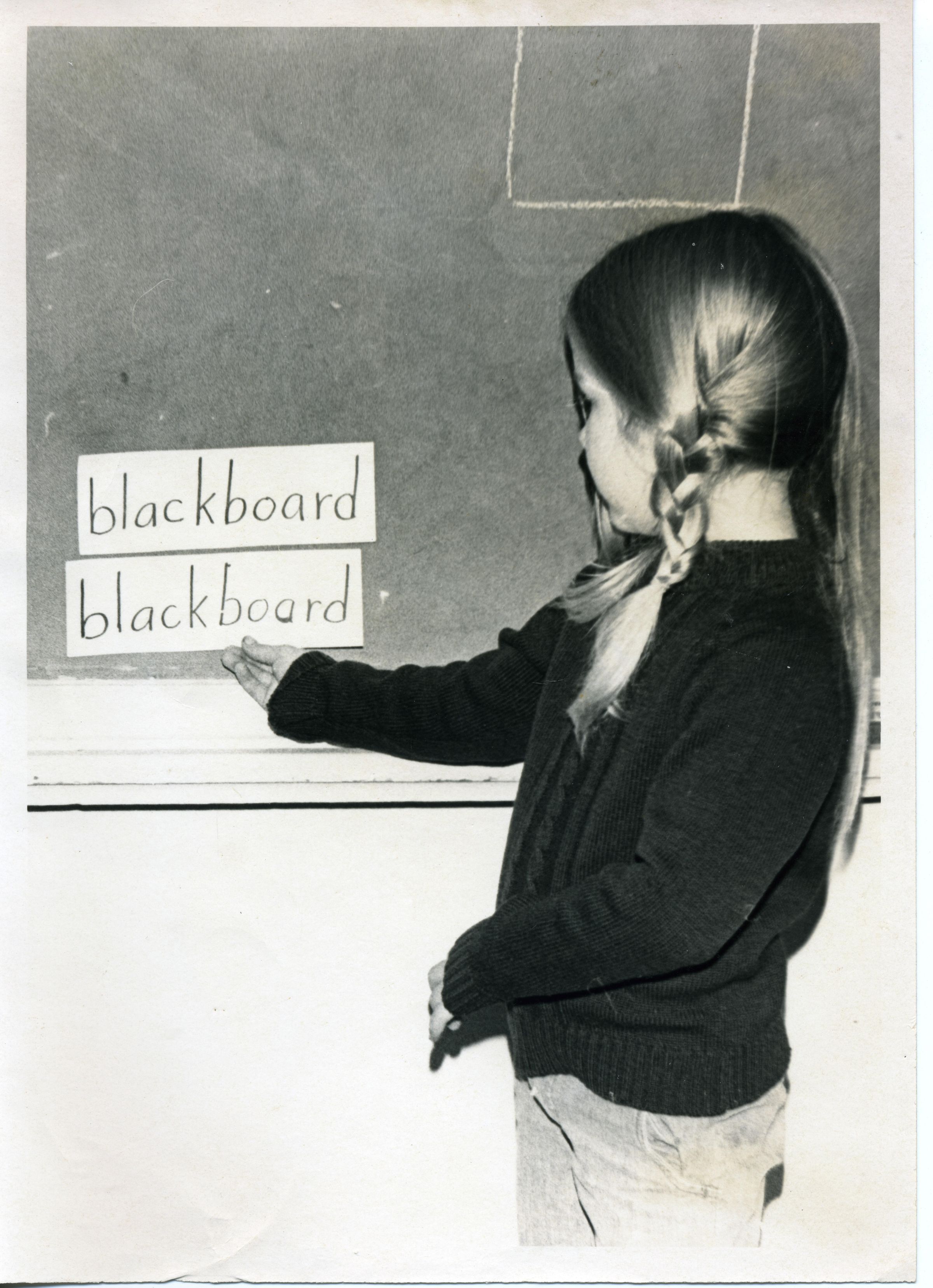 Black and white photo a a girl standing in front of a blackboard. She has light brown hair with braids hanging down onto her shoulders. She is wearing a black sweater above light colored trousers. She is mostly turned from the camera and has an arm extended toward the board and seems to be holding a white rectangular sign that says "blackboard". An identical sign is above the first one. There appears to be something hanging down behind the girl that looks like long hair, but no other person appears to be in the image.