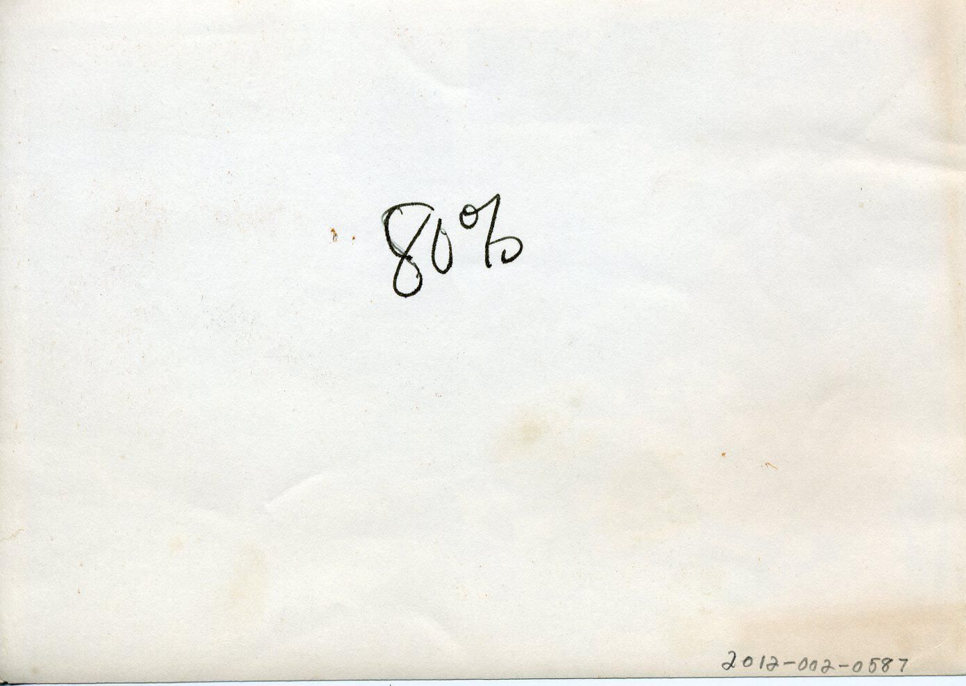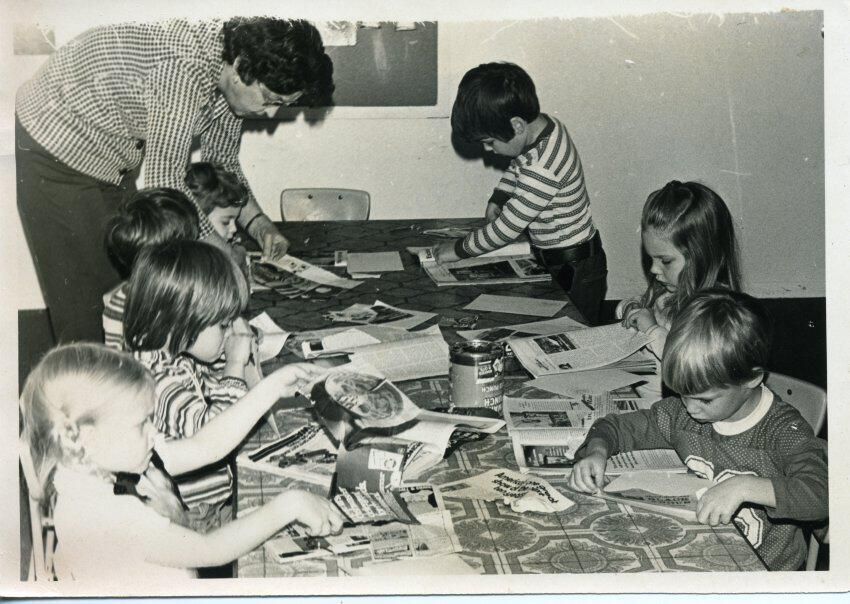 Black and white photo of an adult and seven children at a table. The adult, at the far end of the table, has dark hair and is wearing glasses. She has on a checked top above dark trousers. She is leaning over one of the children to demonstrate something. The child's dark hair and face is visible between the adult's arms. Next toward the bottom of the image is just the dark hair of another child. Next is a girl with dark hair that is holding some of the items from the table. At the front is a girl with light colored hair and a white top. Across the table at the top of the image is a boy with dark hair and a striped shirt over dark trousers. He is working at what appears to be a magazine. Next is a girl with dark hair who is holding a newspaper. At the bottom right of the image is a boy with light colored hair. He is wearing a jersey with a white collar and a number on the front. The table is covered with various materials over a patterned surface. In the background is a picture on the wall and the top of a chair. There is a white border on all sides. On the back in black ink is "80%".