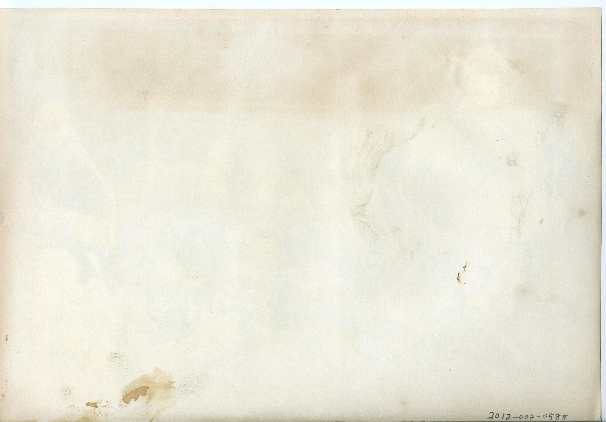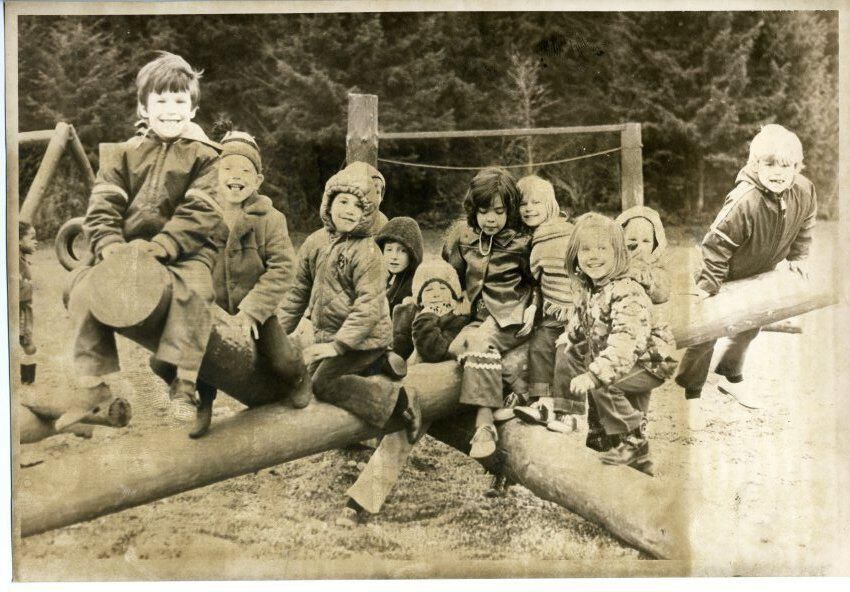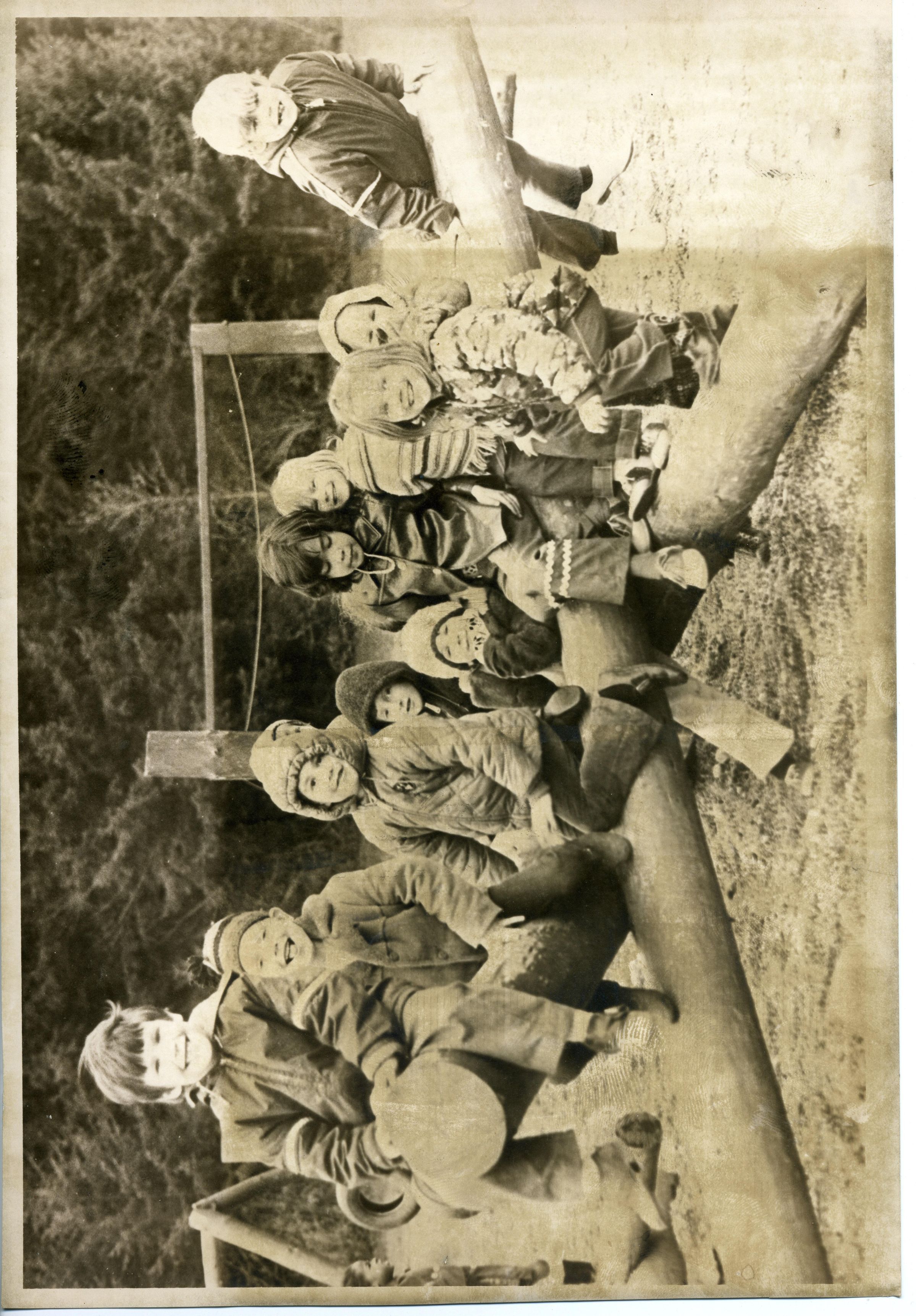 Black and white photo of ten children sitting on logs in a playground. All of them have on winter coats. Beginning at the left, a boy has dark hair and is straddling a log. Next is a boy wearing a stocking cap. Next are three children with hoods over their heads. Next is a girl with dark hair and a girl with blond hair. Then another girl with blond hair, a girl with a hood, and a boy with light colored hair. In the background are other play equipment and further back is a row of trees. There is a white border on all sides. There is no information on the back, but there is a soiled spot.Made/Created