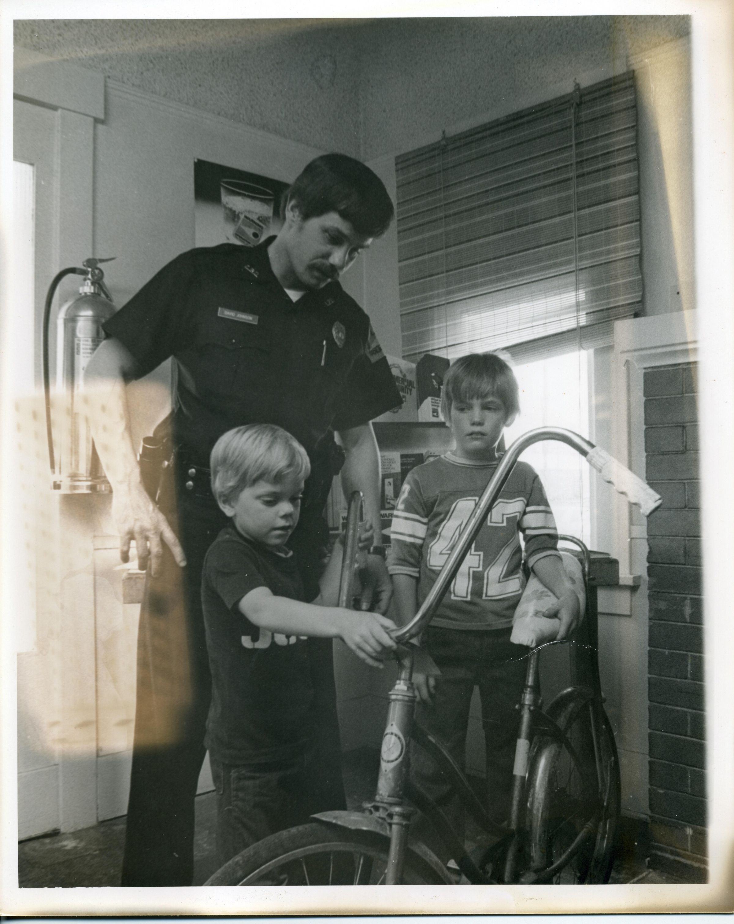 Black and white photo of an adult and two children. The adult has dark hair and is wearing what appears to be a police department uniform. There is a name tag that appears to read "David Johnson", a badge, a shoulder emblem, and a pencil or pen in a pocket. On the left foreground is a young boy with blond hair and dark clothing. There is writing on his shirt but it is obscured by his arm. Next to him is an older boy with dark hair and wearing a jersey with stripes and the number "42" on it. He has dark trousers. All are leaning over a bicycle with the two boys each touching a part of it. On the wall in the background is mounted a fire extinguisher and a poster. On an adjoining wall is a window with a blind and a portion of a brick fireplace. There is a white border on all sides. There is no information on the back.Made/Created