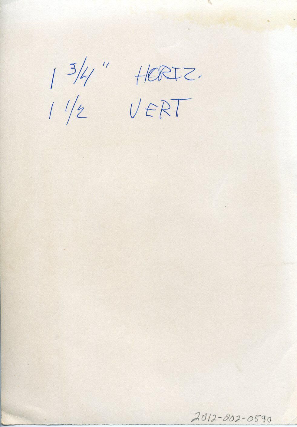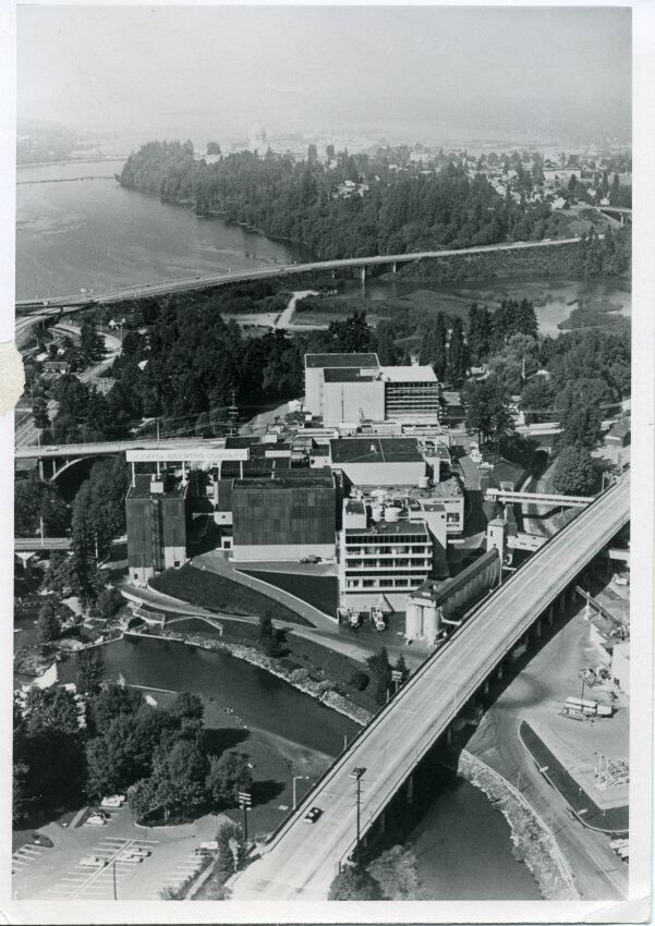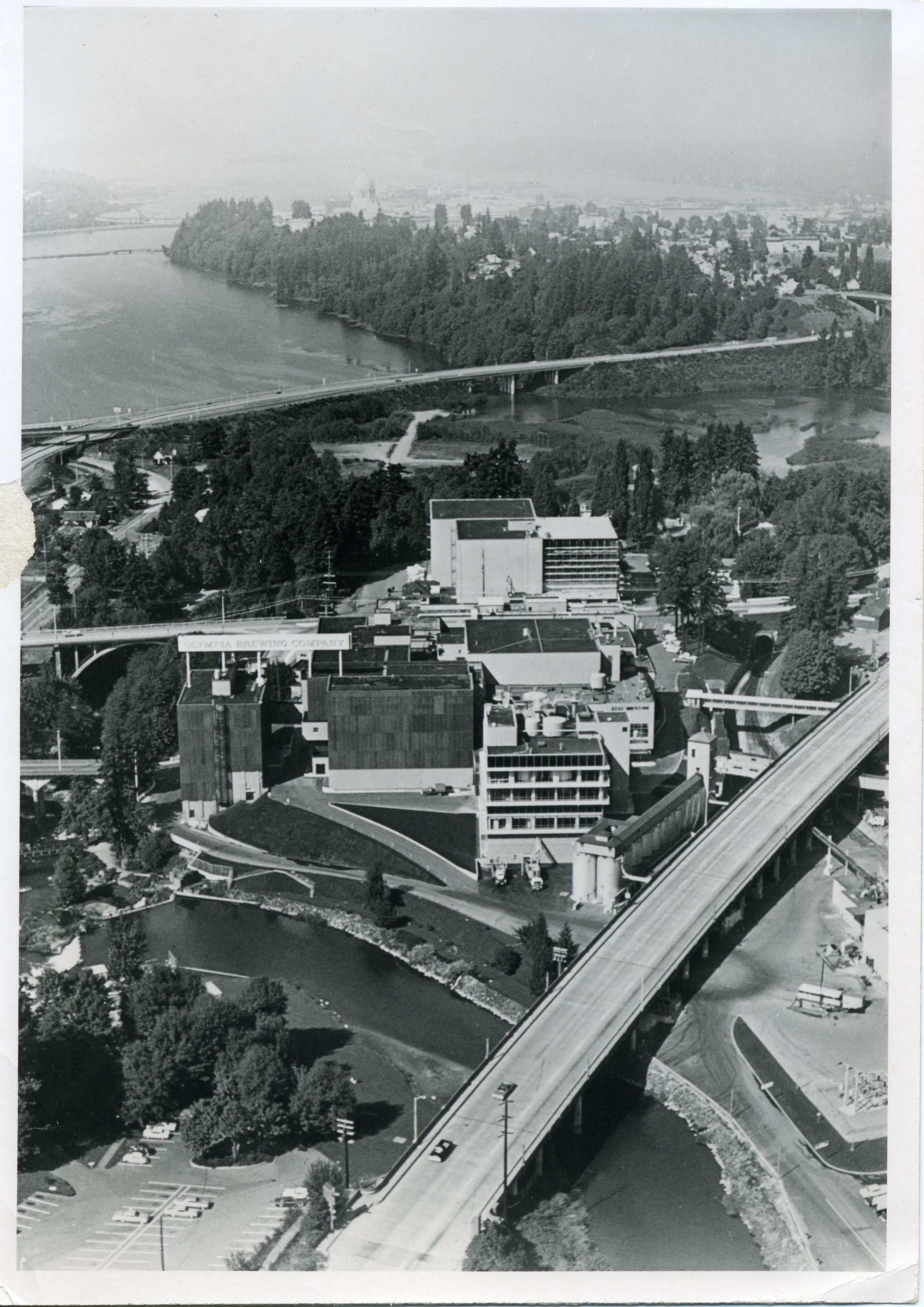 Black and white Aeriel photo of the Olympia Brewing Company buildings. In the center of the image are approximately five buildings. In the lower right corner is a portion of Capital Way. In the background is a portion of Puget Sound and the I-5 freeway. A portion of the Des Chutes River is visible near the bottom of the image. Also visible are parking lots, telephone poles, and trees. There is a white border on all sides. On the back in ink is "1 3/4" horiz 1 1/2" vert".