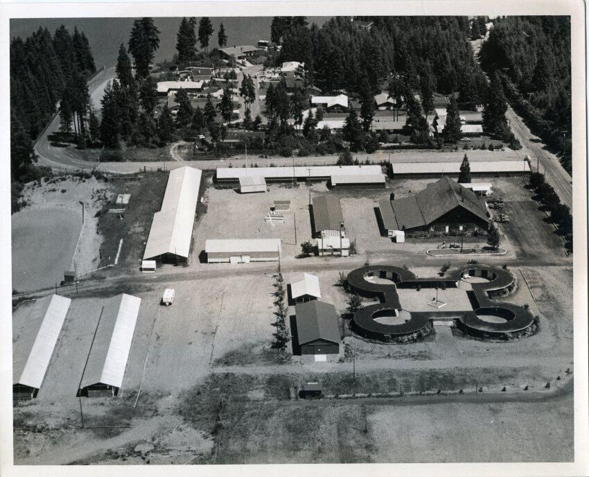 Black and white aerial photo. It is believed that the buildings shown are at the Thurston County Fair Grounds. The administration building is at the right center and next t it is a display building with four round segments. Also visible are stock buildings and pens, roads, houses, and a portion of Long Lake. There is a white border on all sides. On the back in red ink is "108%".