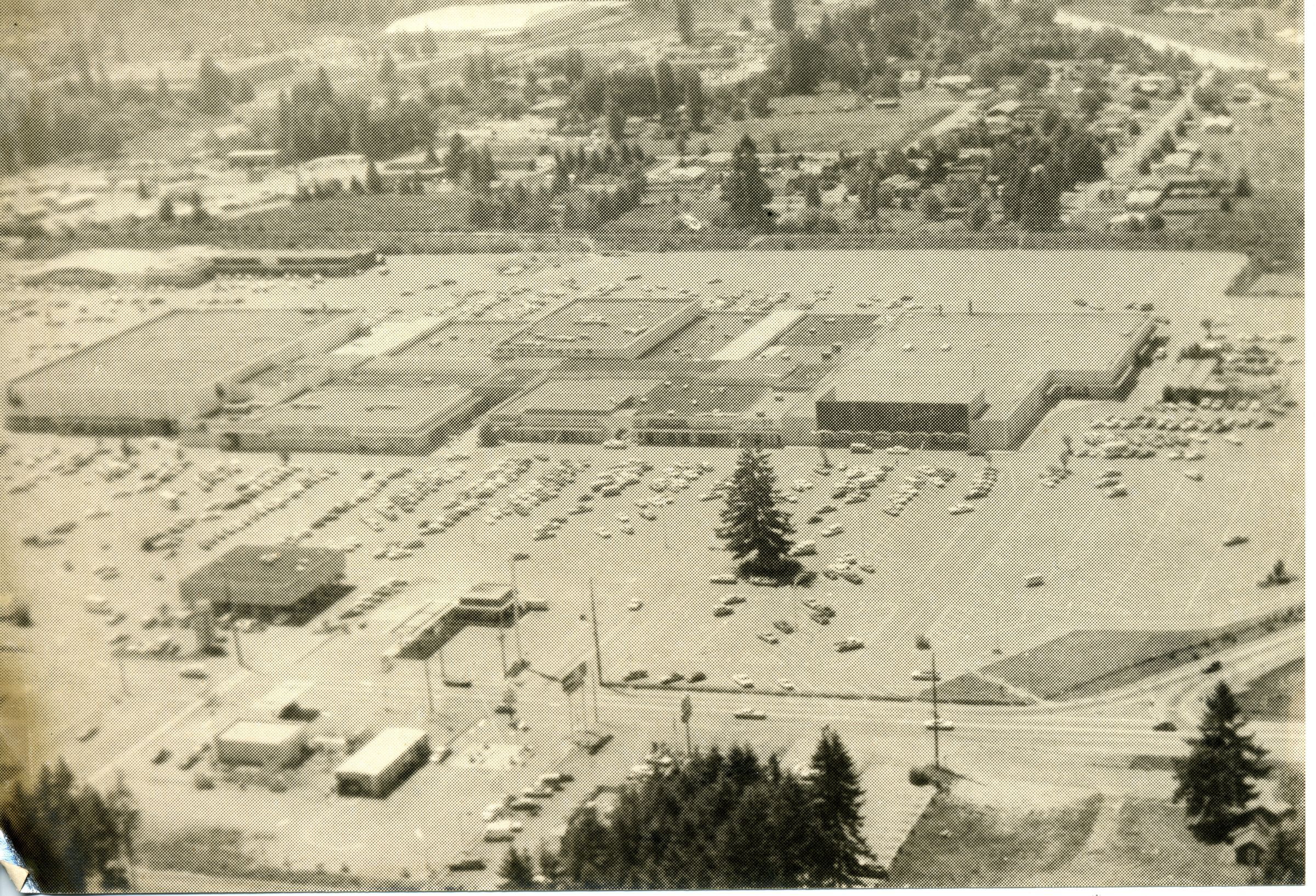 Black and white aerial photo of South Sound Shopping Center. The image is mainly buildings and cars with trees and houses in the back ground. Near the bottom of the image is Sleater Kinney Road. Above that is the Texaco gas station and a bank building. Among the many cars is a fir tree that was often used for a Christmas Tree. Next are the mall buildings and above them is a berm where a logging railroad was, and then the trees and houses. There is no border. There is no information on the back.Made/Created