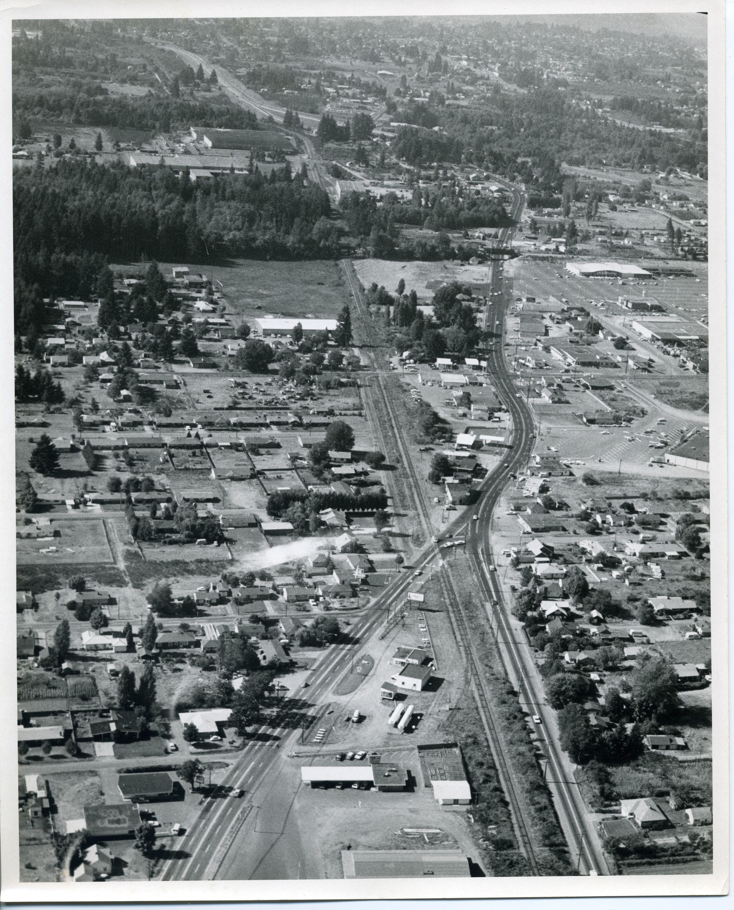 Black and white aerial photo of a portion of the City of Lacey. Starting near the upper right corner of the image and disappearing near the bottom right is Pacific Avenue. Branching off to the left near the center is Lacey Boulevard. A railroad track that later became a hiking trail enters from the top center and parallels Pacific Avenue near the bottom of the image. Near the top is a portion of the I-5 freeway. On the right edge above the center is a portion of the parking lot of South Sound Shopping Center showing some of the out-buildings including a grocery store. Across Sleater Kinney Road from the parking lot are more business buildings. Throughout the image are trees and houses. There is a white border on all sides. There is no information on the back.Made/Created