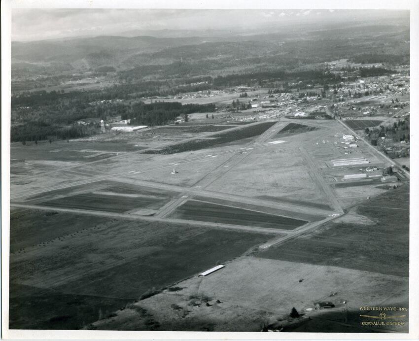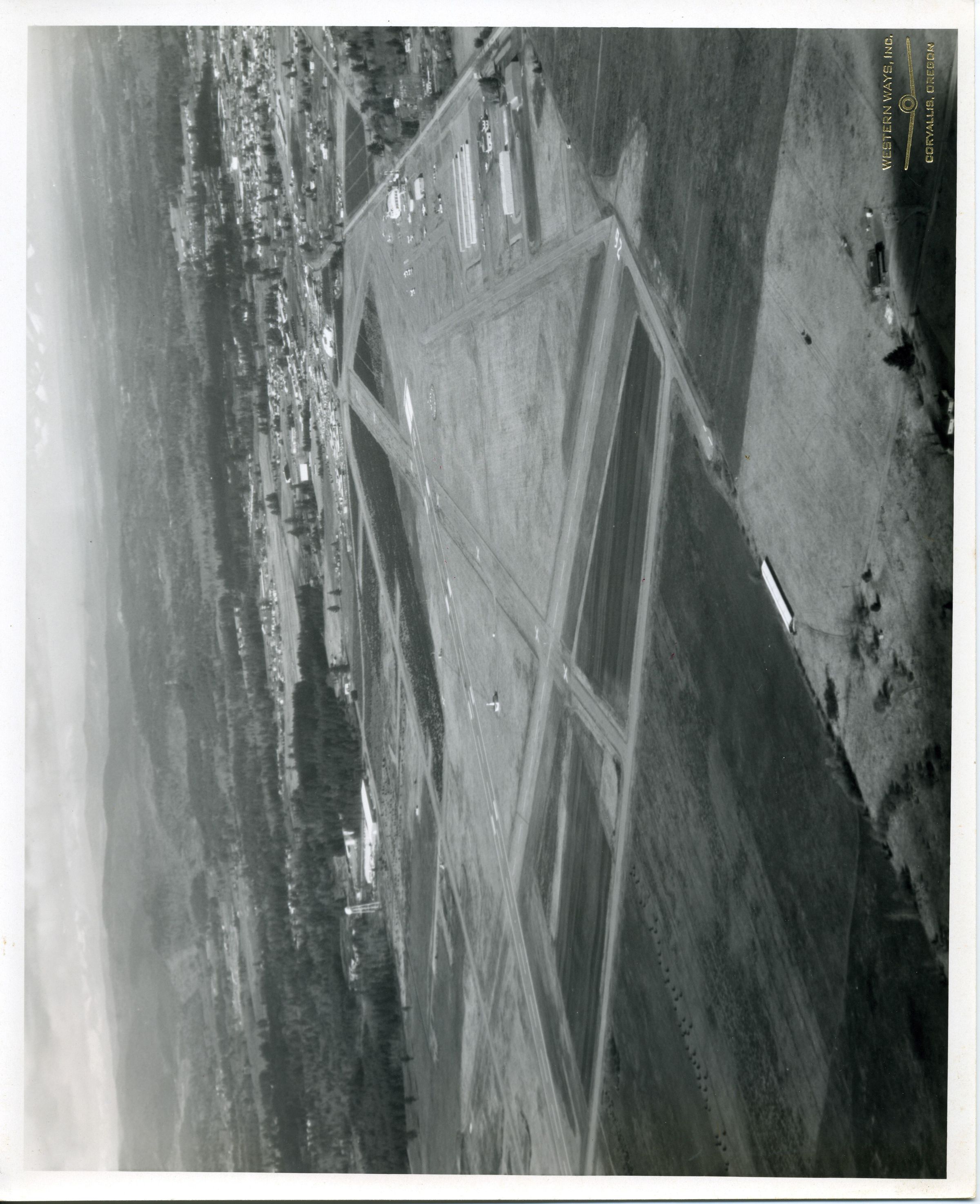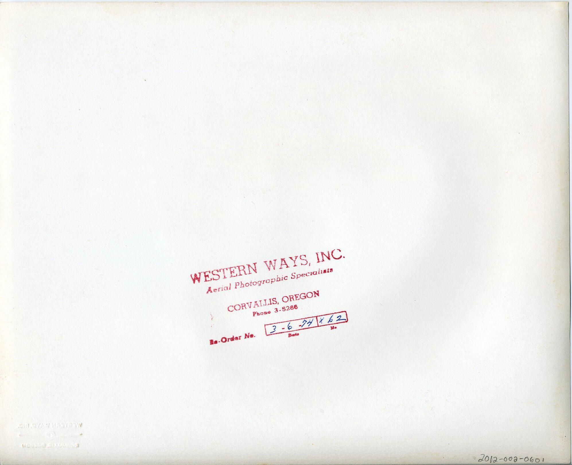 Black and white aerial photo of an airport, presumed to be at Olympia.. The image shows runways and buildings along with trees and houses. In the background are low hills. In the lower right corner is a stamp in yellow that says "Western Ways, Inc Corvallis, Oregon". There is an impression of an airplane inside the stamp. There is a white border on all sides. On the back is a red stamp that says "Western Ways, Inc Aerial Photographic Specialists Corvallis, Oregon Phone 3-5266 Re-Order No. 3-6-74 x 62".Made/Created