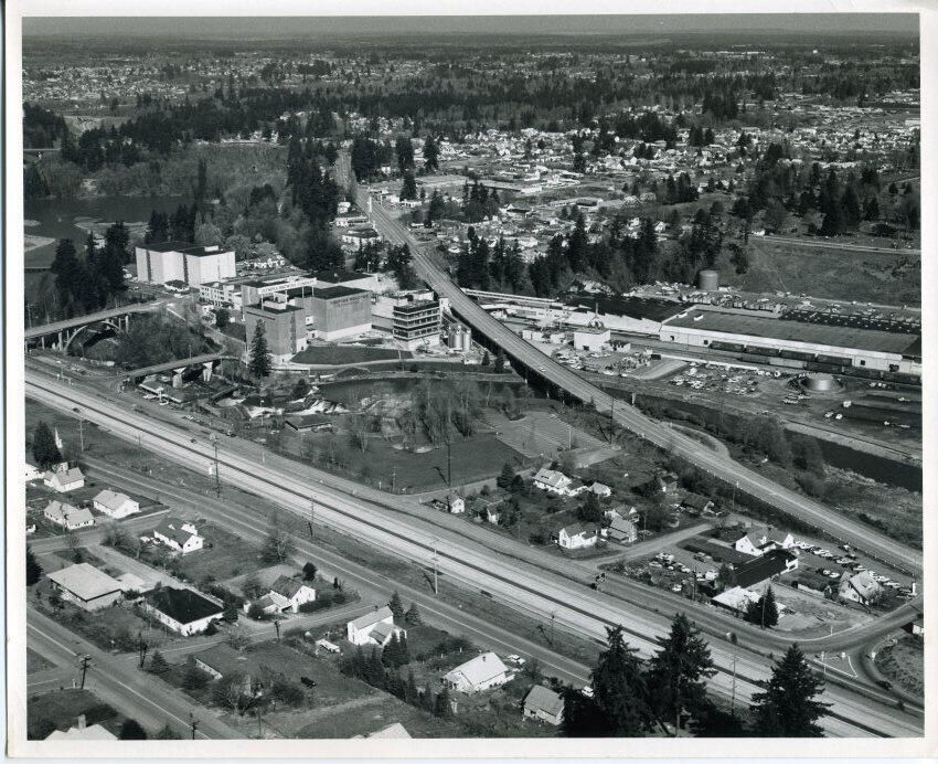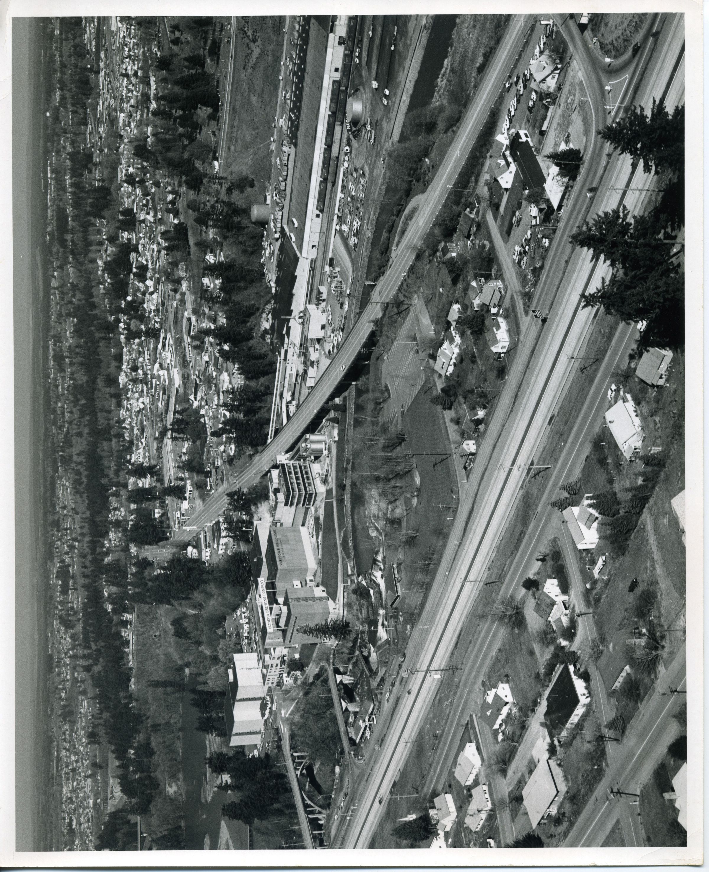 Black and white aerial photo of the Olympia Brewing Company. Near the bottom of the image is the I-5 freeway and near the center is a curving Capital Way. North Street can be seen near the left edge crossing the Deschutes River by means of a bridge. Near the center are the main buildings of the brewery, and warehouses are seen to the right. Local streets, houses, and trees are visible throughout and into the background. There is a white border on all sides. There is no information on the back.Made/Created